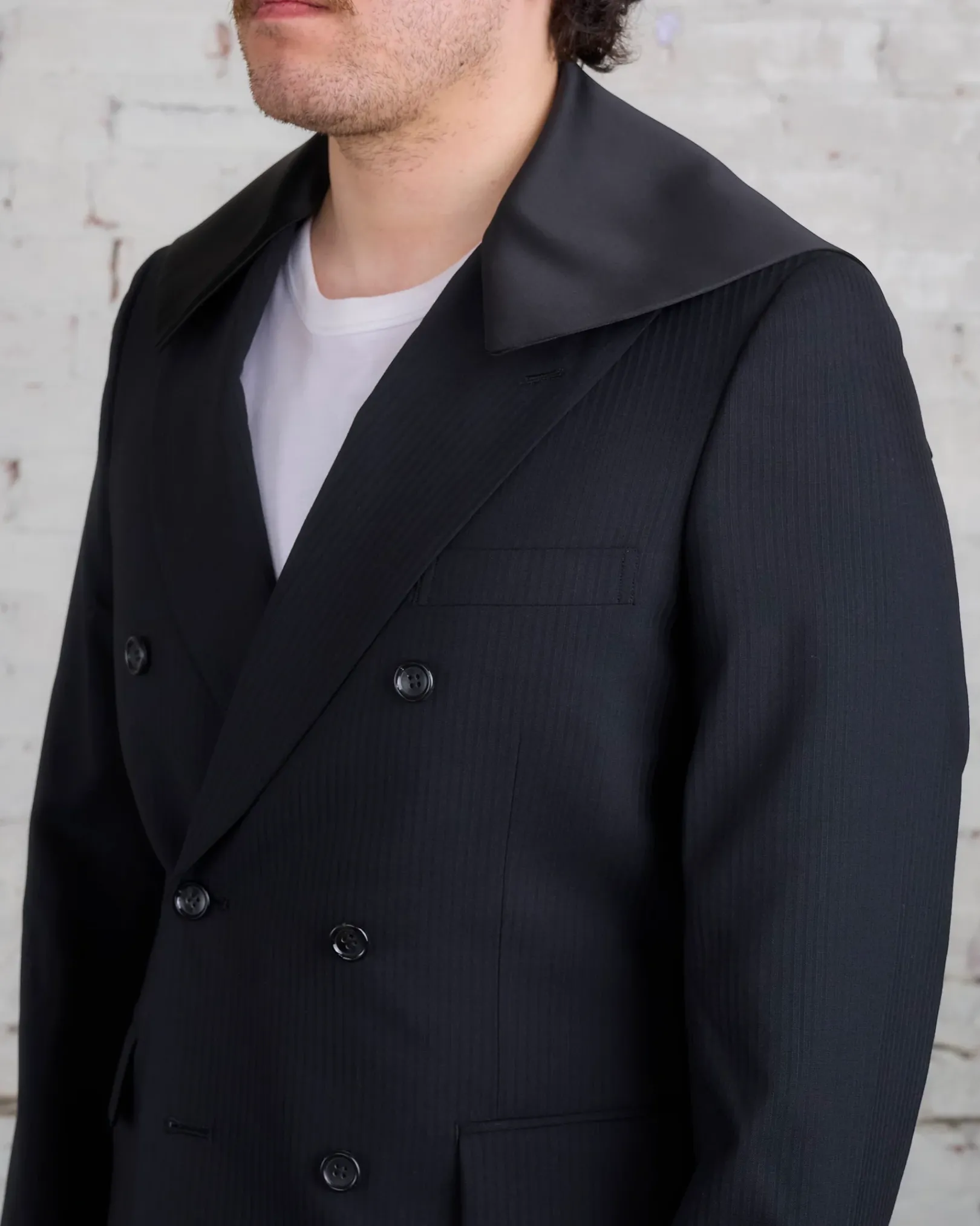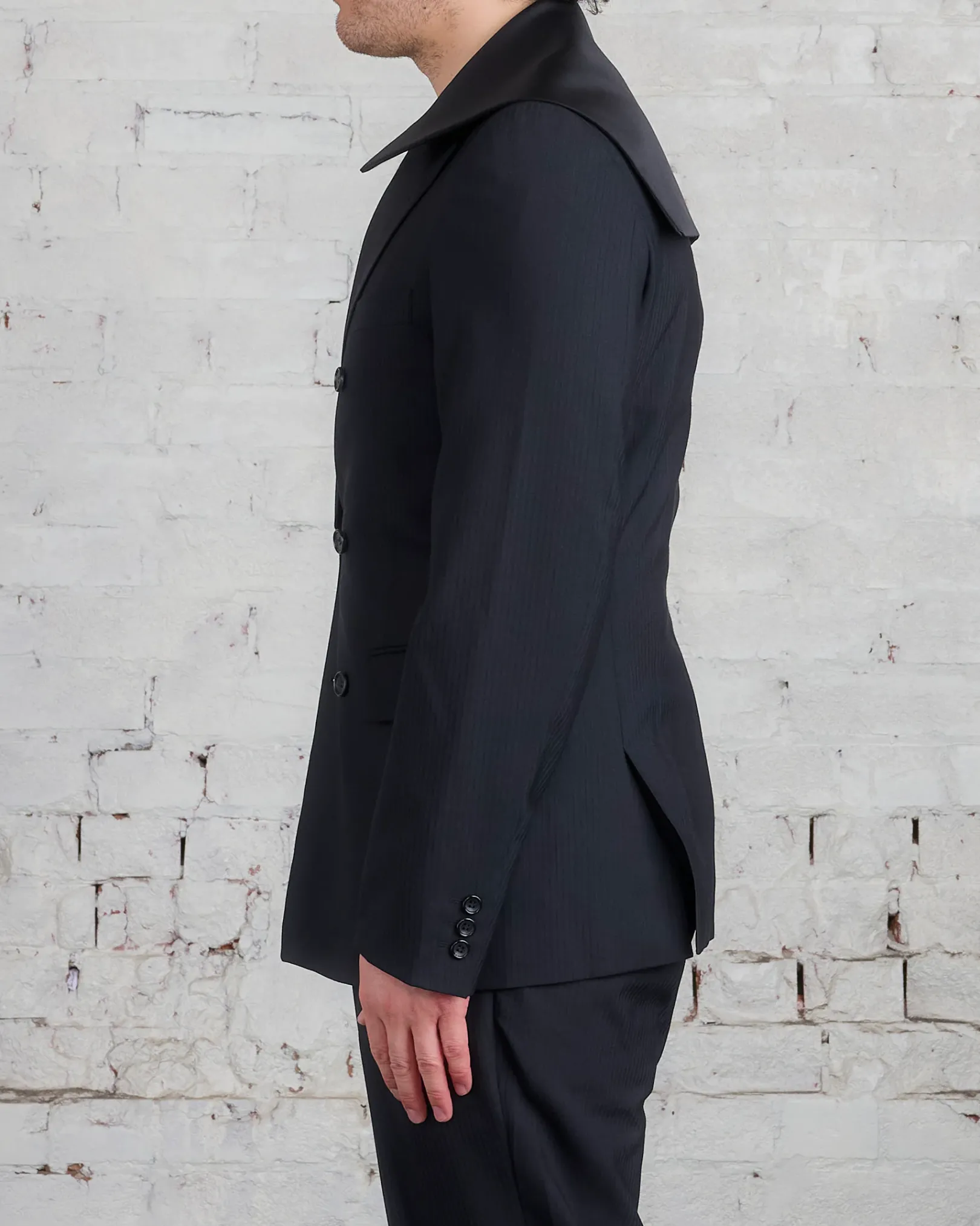 Made in Japan double breasted suit jacket. It features a detachable polyester satin collar, notched lapels, button closure, flap hand pockets, partially satin lined, and twin vents at the rear. Slim fit.