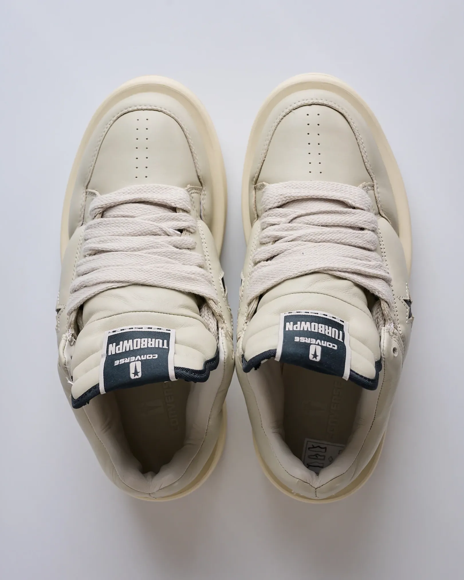 Rick Owens reimagines a Converse icon once again with the TURBOWPN Ox, a low-top evolution of the original TURBOWPN. Distorting and exaggerating classic basketball elements through his signature DRKSHDW aesthetic, the shoe features bold paneled leather uppers, an oversized tongue, and thickened sole for a striking, sculptural silhouette. Each pair is finished with custom DRKSHDW branding—delivering a distinctly Rick Owens take on timeless Converse heritage.