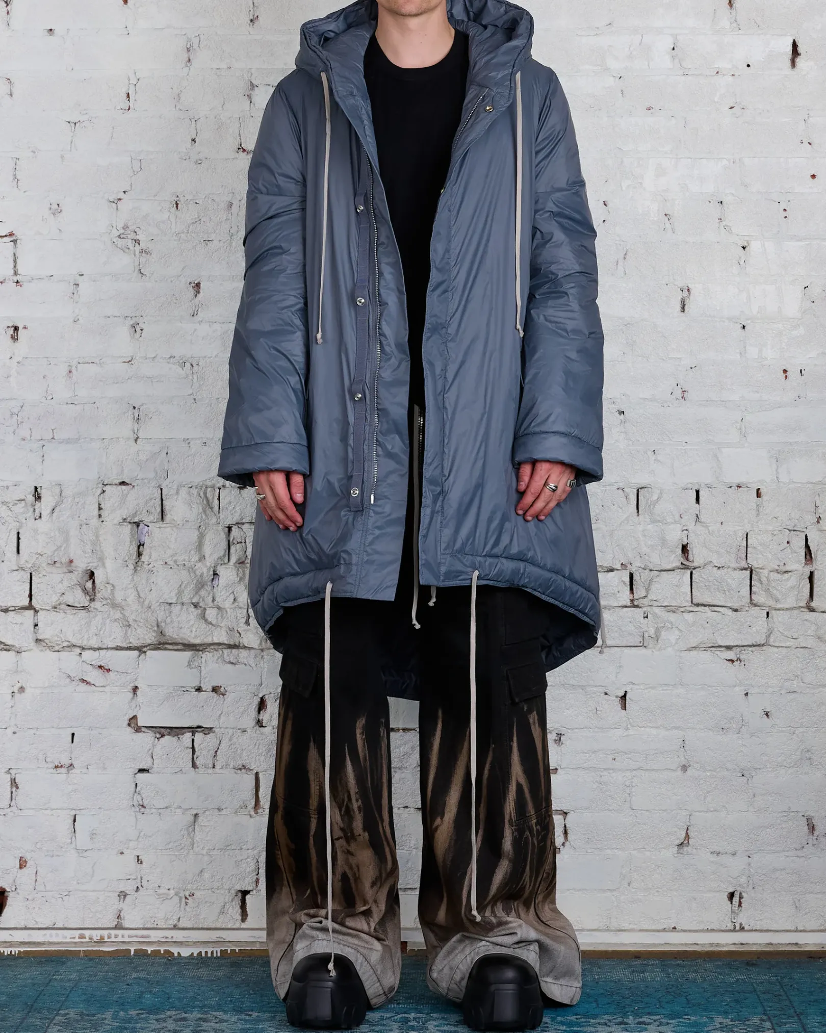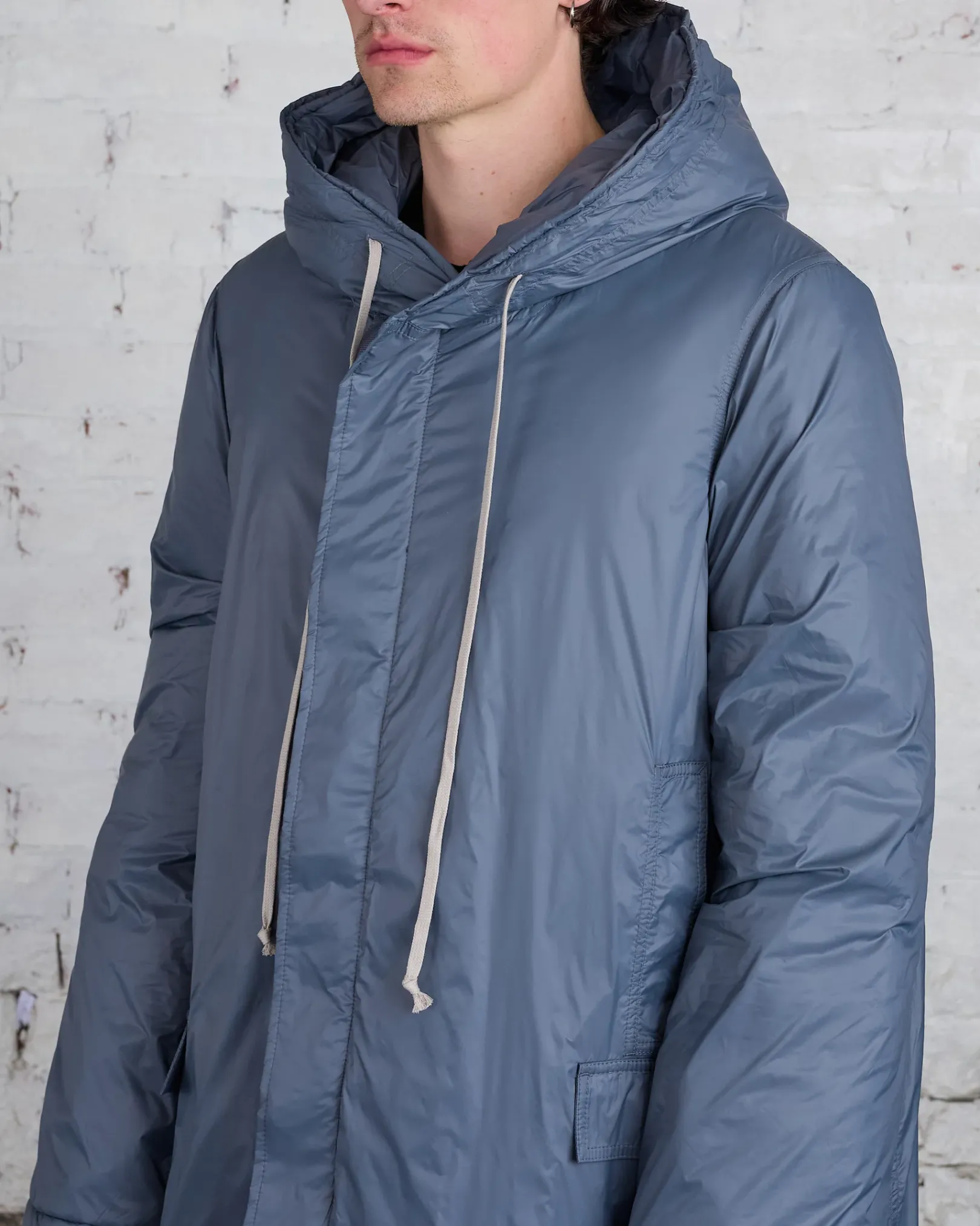 This fishtail parka is knee-length in front, and dips to a longer length in back. It has a double breasted flap that conceals a centre front zipper opening, and is secured with snaps, running down a webbing strip. It has long sleeves, a drawstring back waist and hood, two welt side pockets above two side pockets with flaps. It features a fishtail hemline with centre back split and drawstrings.