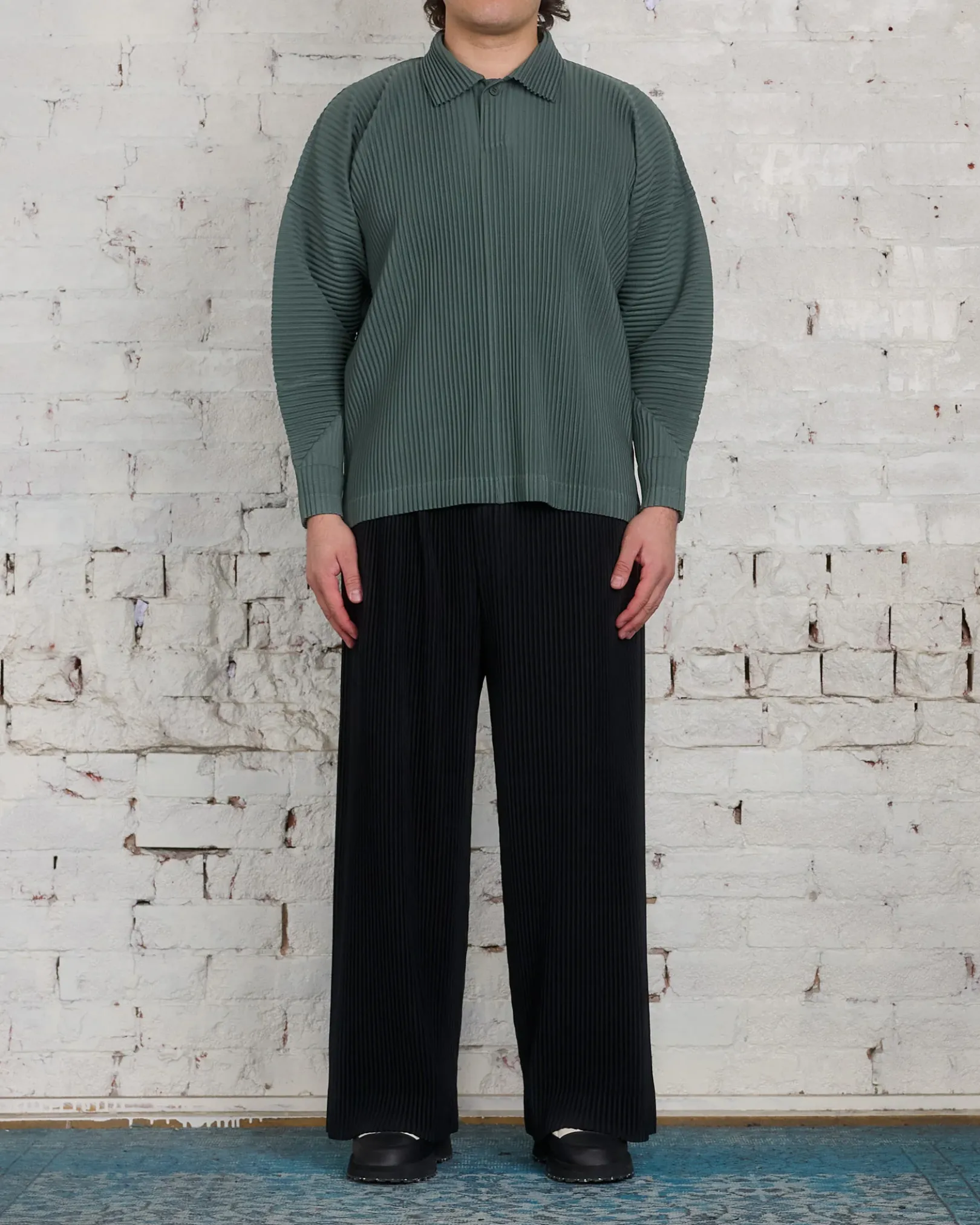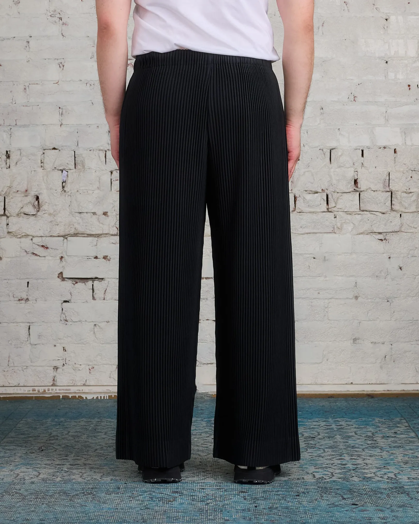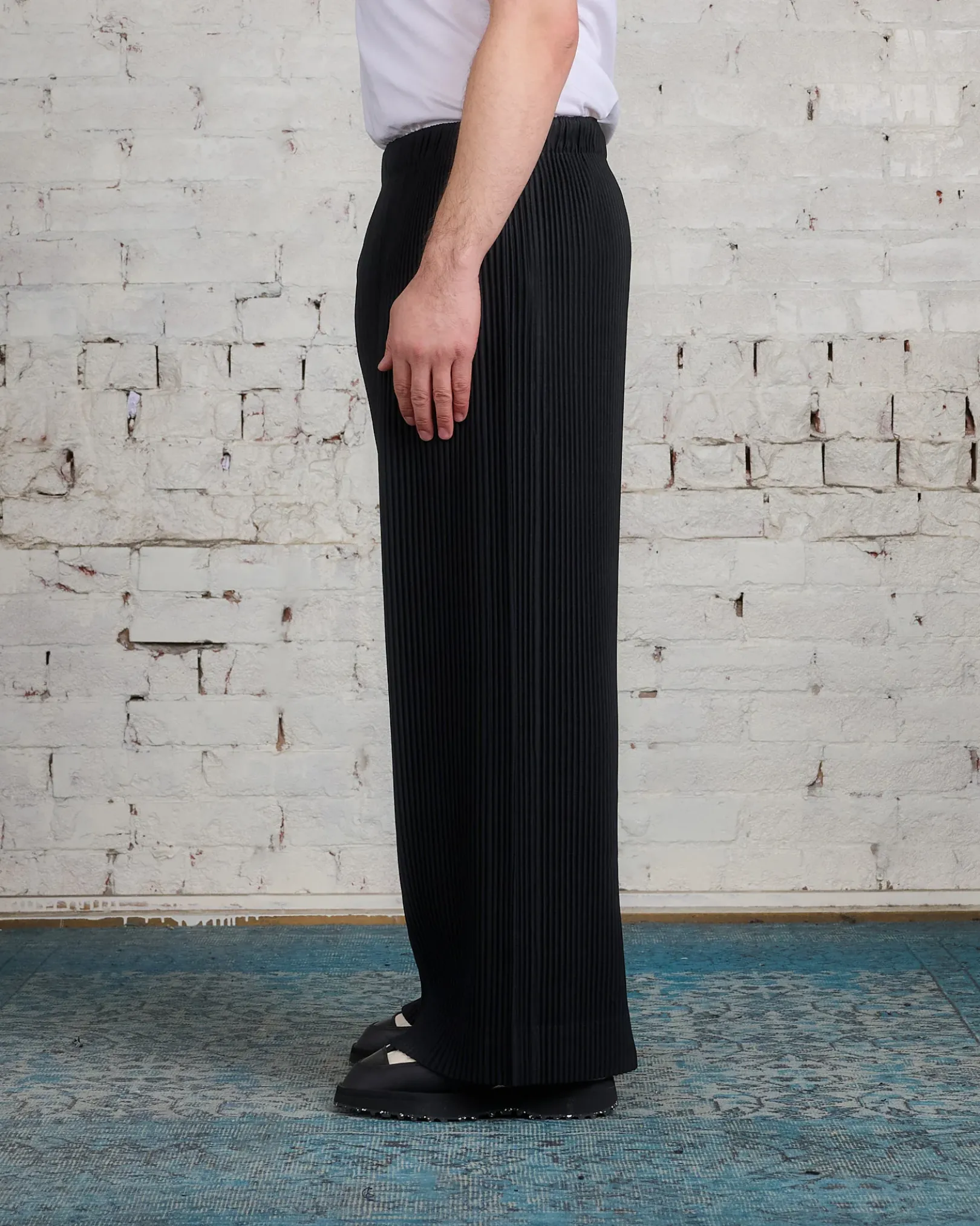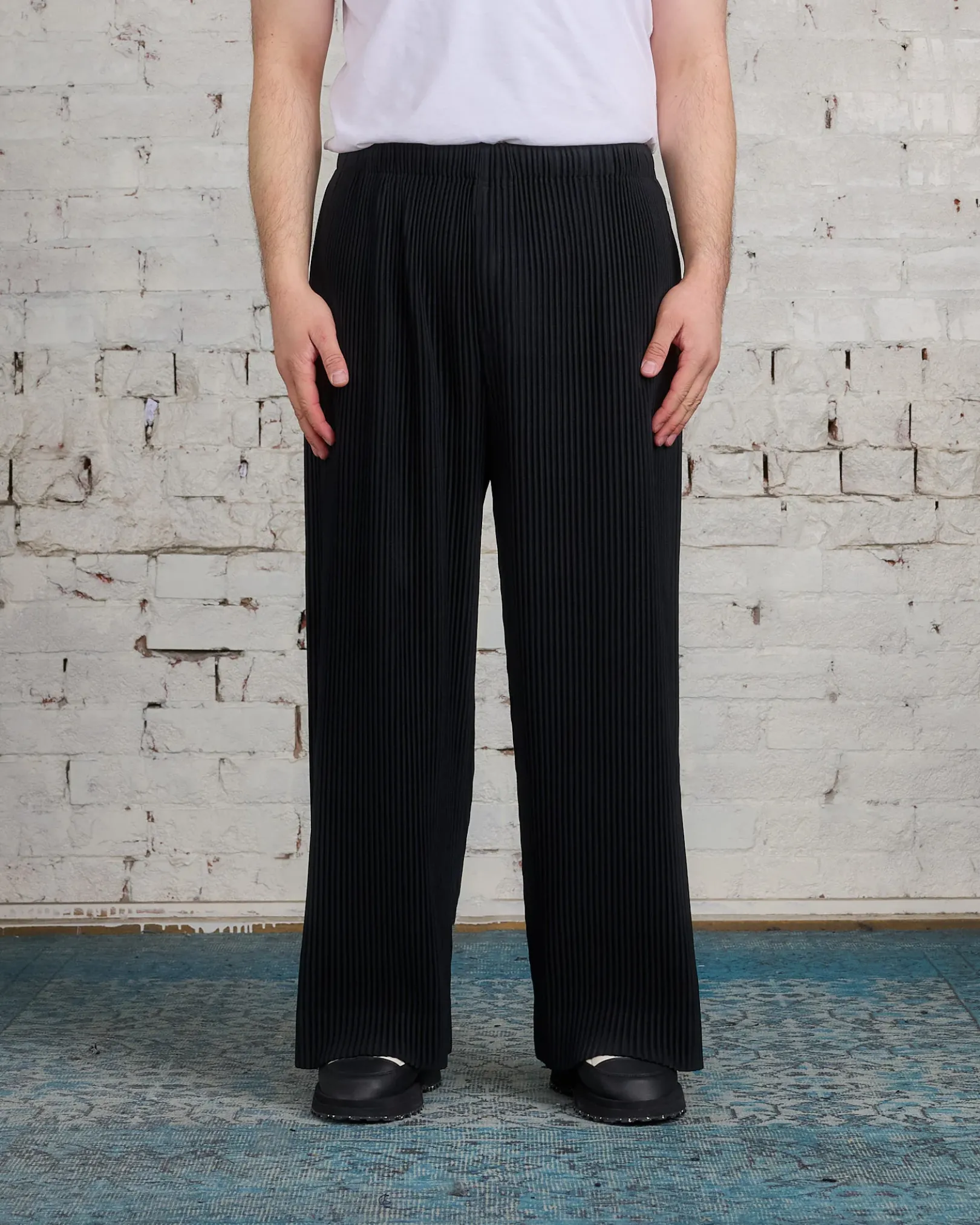 These pleated pants have a relaxed, wide leg, two side pockets, and an elastic waist.