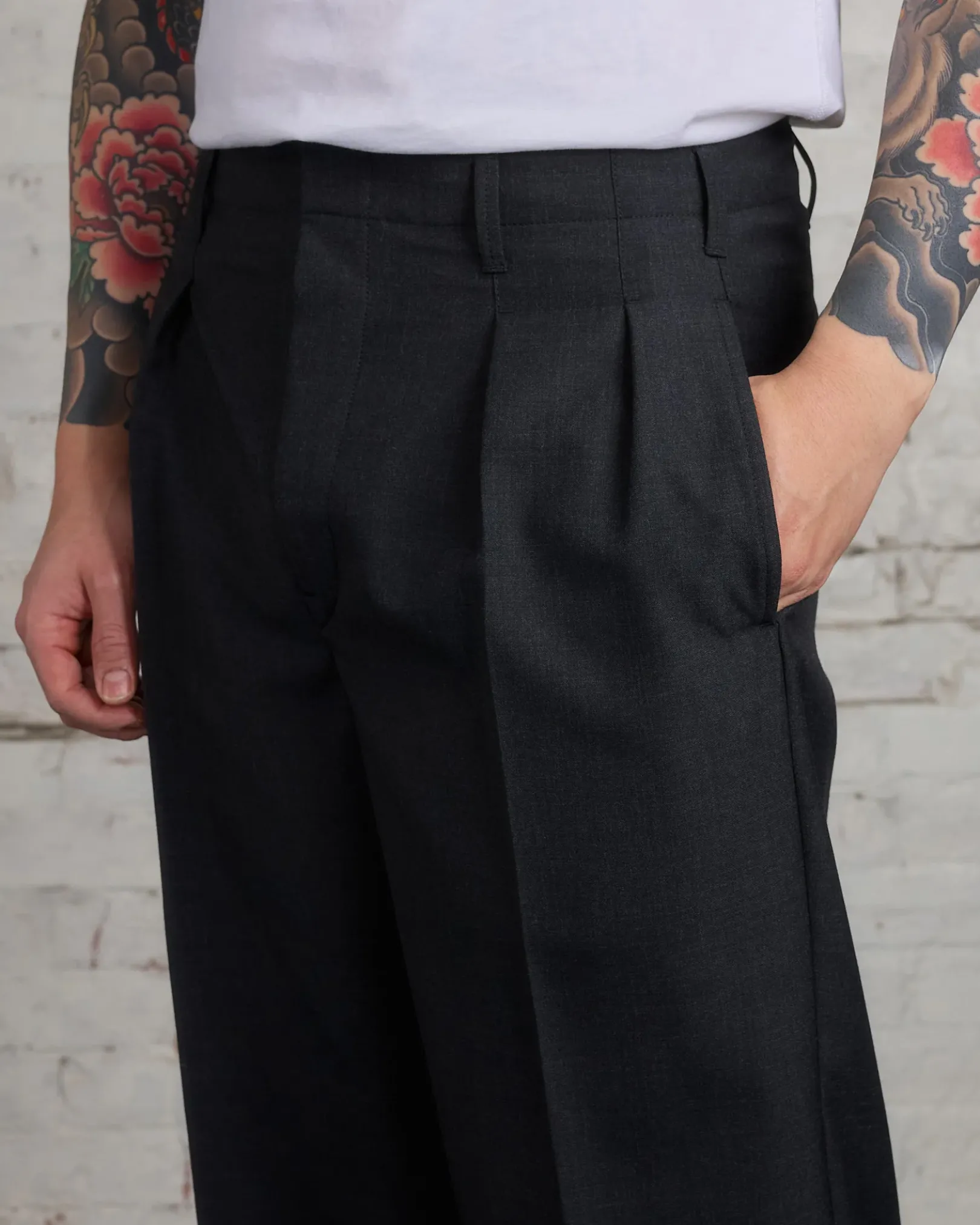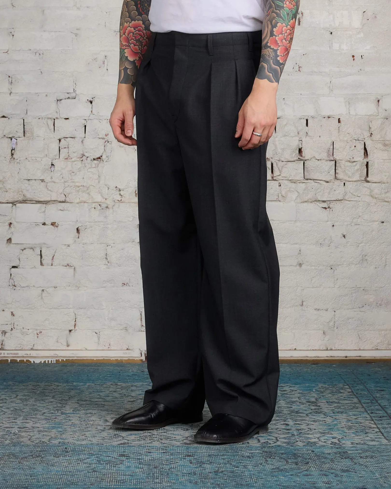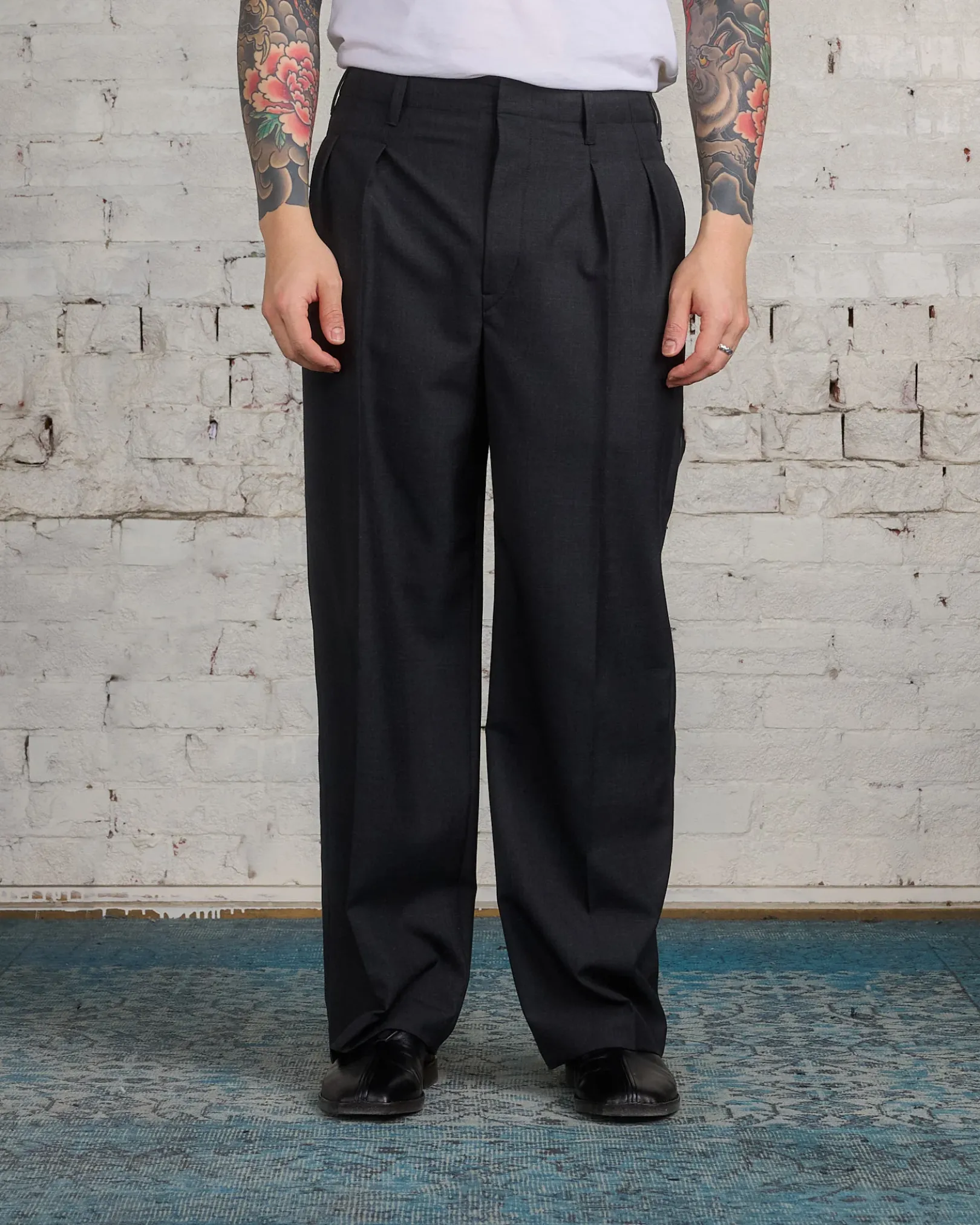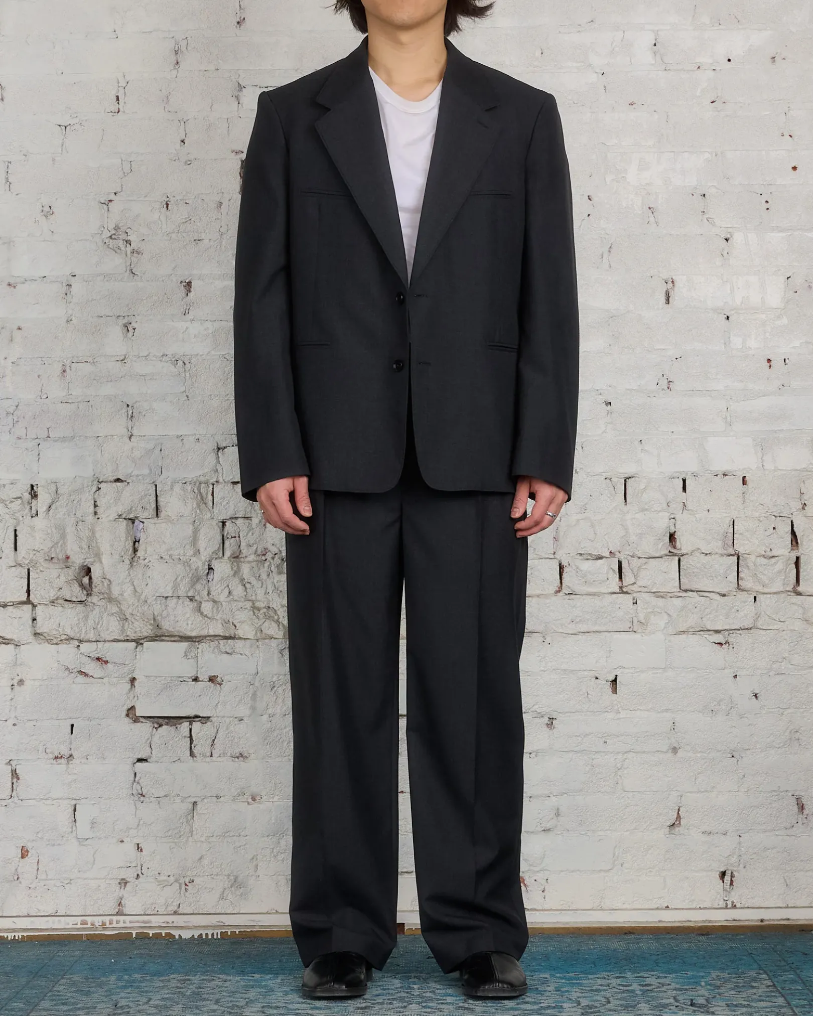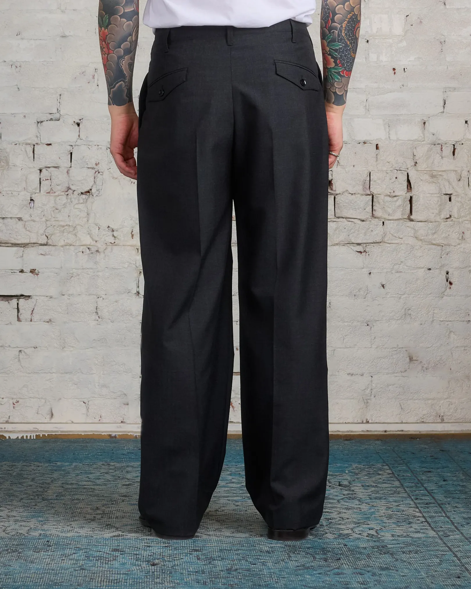 These straight cut trousers embody LEMAIRE’s relaxed tailoring philosophy. Crafted from a tropical poly-wool woven into a mélange twill, the dense yet supple material enables fluid tailoring with a soft feel. The relaxed pants boast seven belt loops and a continuous Hollywood waistband. The two front creases add volume to the leg and there are two inseam pockets on the sides, two buttoned pocket flaps and two darts to ensure its shape at the back.