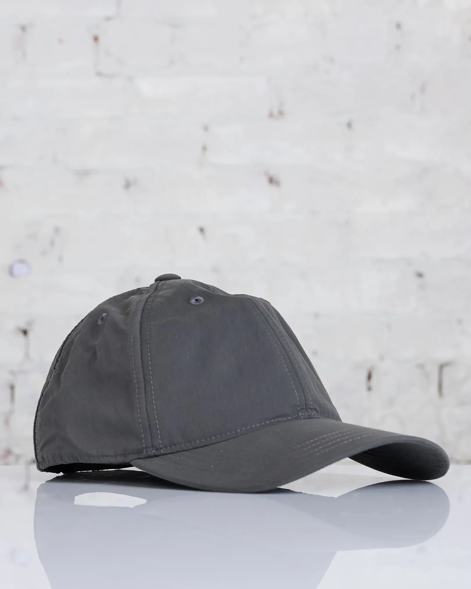 Ballcap in Vapor Charcoal Peached Nylon. Produced in an Italian peached polyamide fabric, the 6 panel baseball cap has a curved brim, stitched eyelets and a rear strap adjuster with brass hardware.