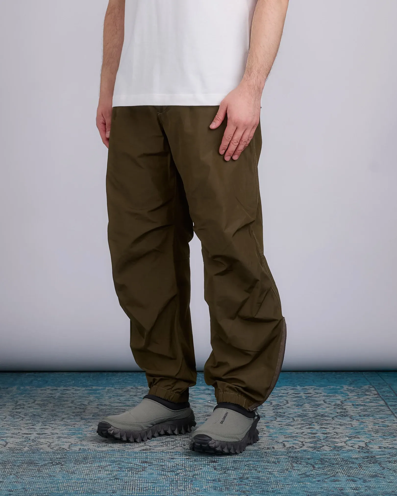 Trousers with zipper at the bottom inspired by military trousers. The brushed high-density material also has water repellency.
