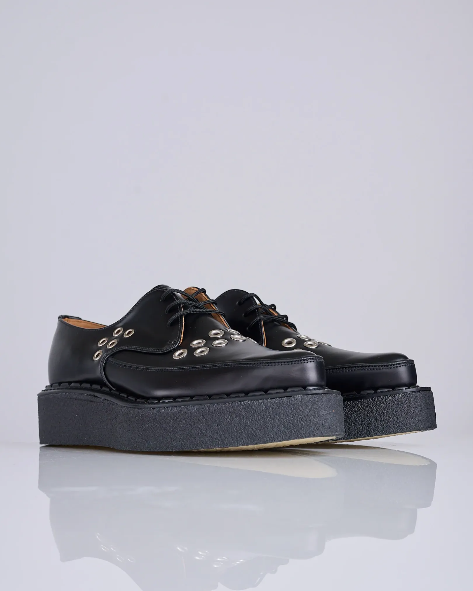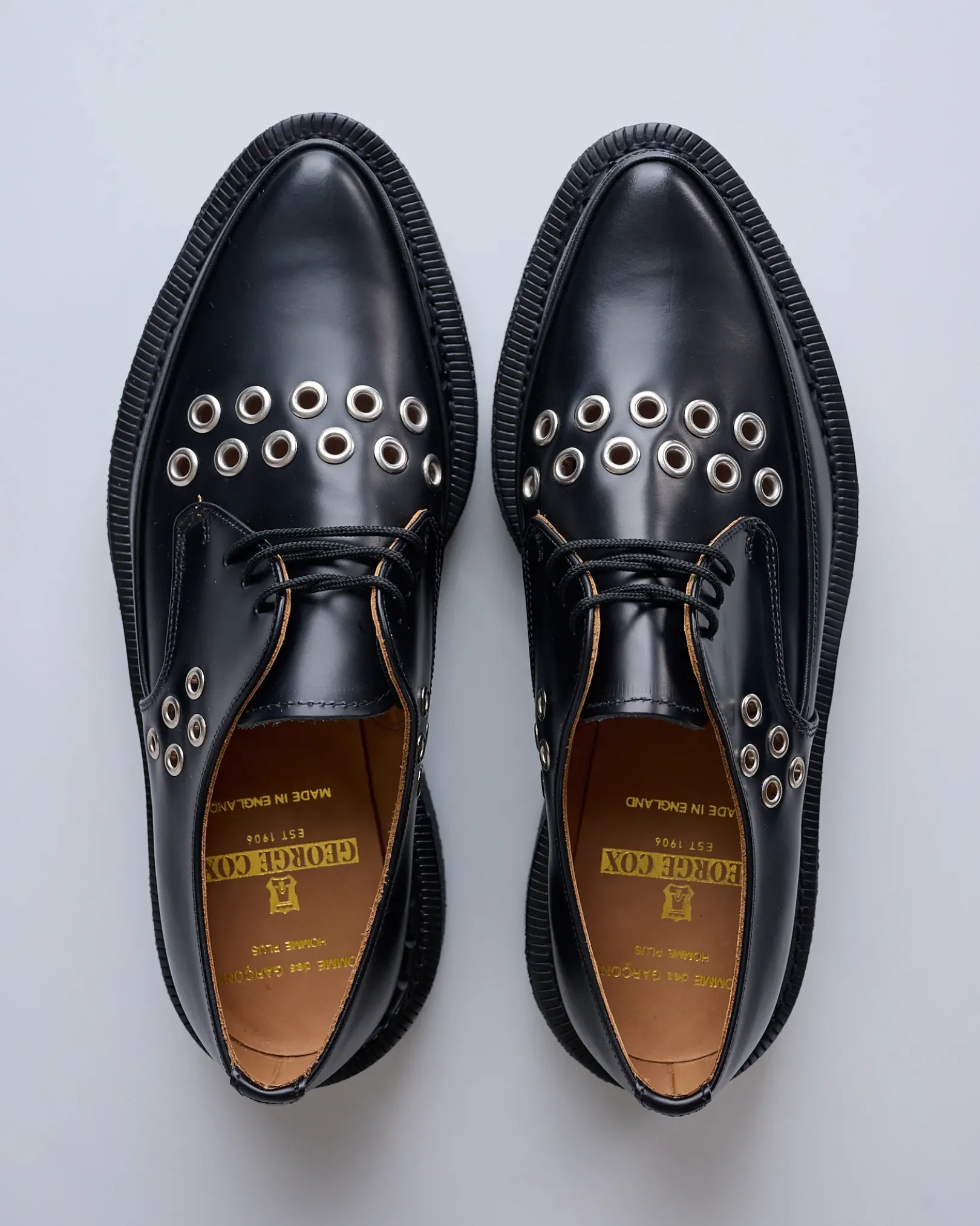 Polished corrected leather derby shoes crafted in collaboration with George Cox. Featuring a pointed moc toe, lace-up closure with eyelets at the vamp and sides, and a Goodyear welt construction for lasting durability. Finished with a buffed leather lining, crepe rubber sole, and a 2″ stacked heel for a bold, refined look.
