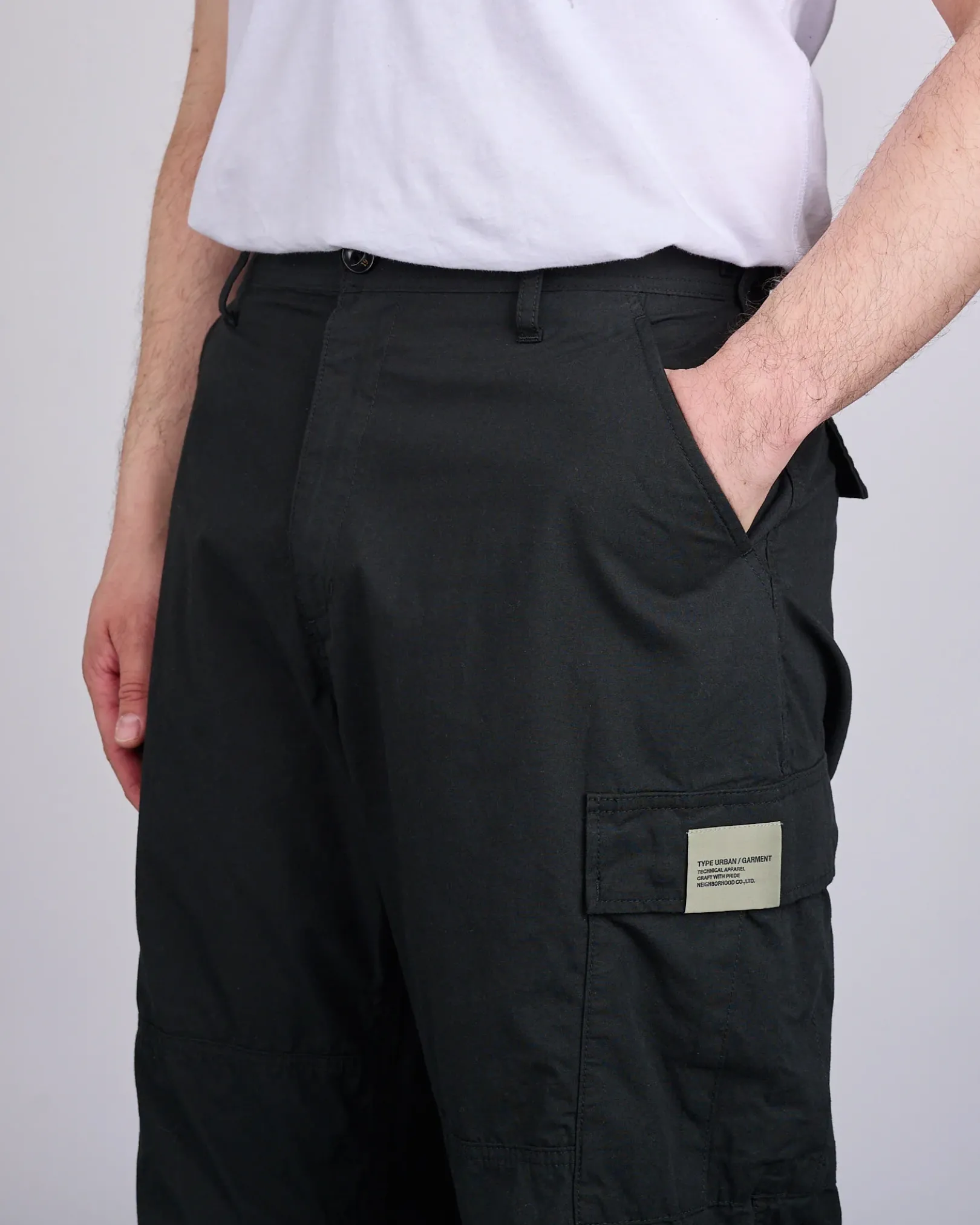 Crafted from high-density military-grade weather fabric, the Neighborhood BDU Pant delivers rugged durability with elevated detailing. Designed with cargo pockets, concealed-snap hip pockets, and adjustable drawstrings at the hems, they feature tucked knees for added mobility and a generous silhouette. Finished with original hardware, cat-eye buttons, and signature branding throughout.