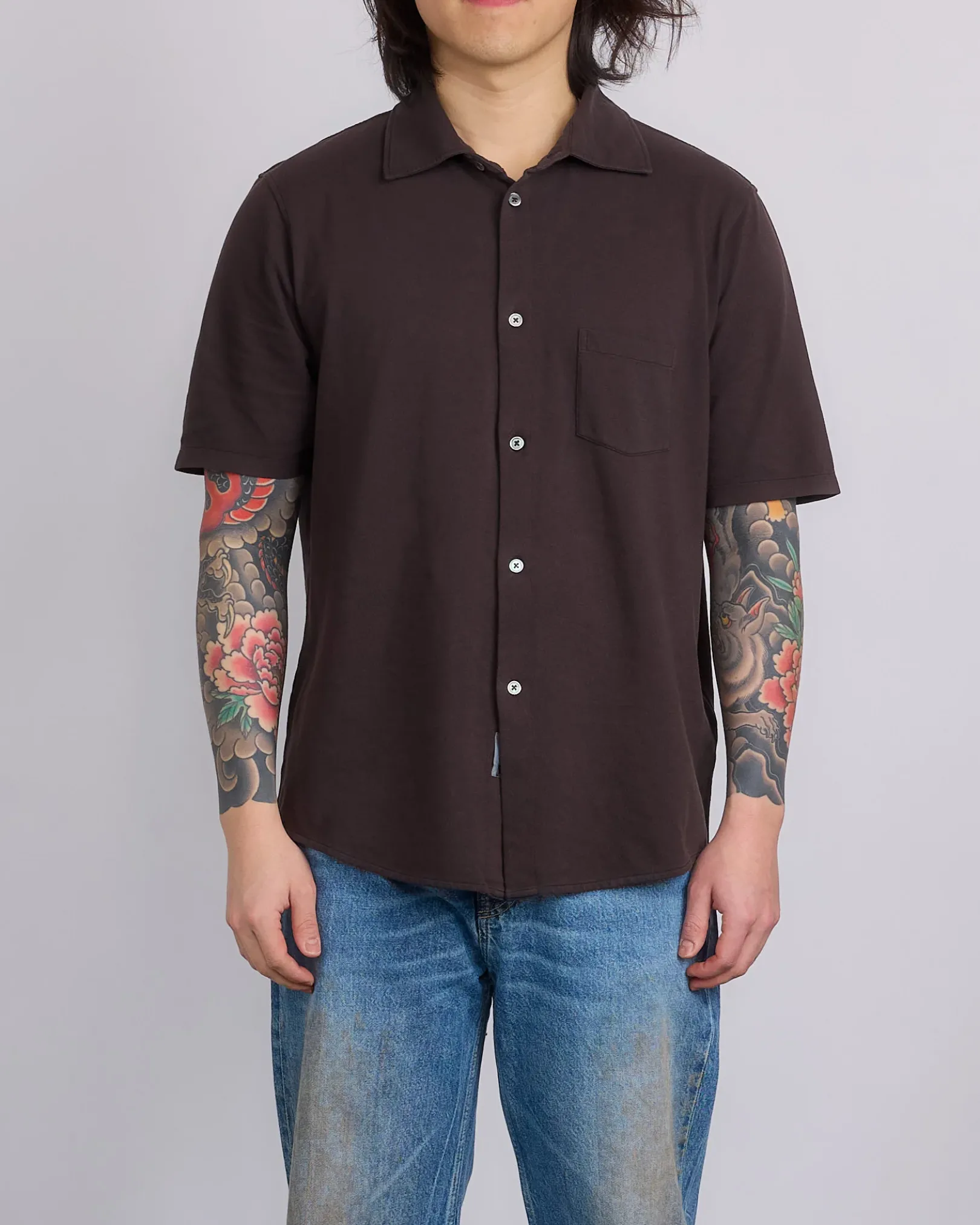 Our Legacy Analog Shirt in Deep Brown Super Mall Piquet. Produced in a Portuguese piquet weave cotton fabric, the mens Analog Shirt has a relaxed, straight fit, and features , a single patch chest pocket, smoke pearl buttons and a curved hem.