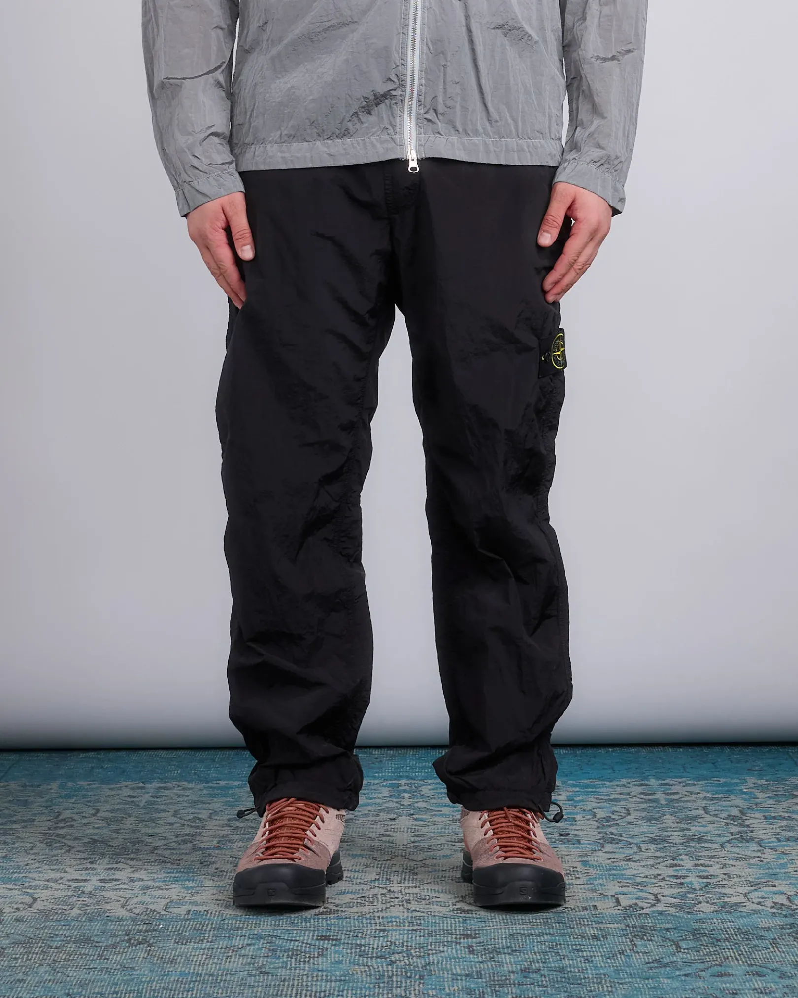 Sweatpants in a new responsible Stone Island iridescent Nylon Metal fabric. The evolution of this iconic fabric sees the use of ECONYL® regenerated yarns: the life-ended nylon, pre- and post-consumer, is recycled with a complex depolymerization process to create this fiber that features the same intrinsic characteristics of nylon from fossil raw material. The finished piece then undergoes an elaborate double-dye procedure. Nylon mesh lining.