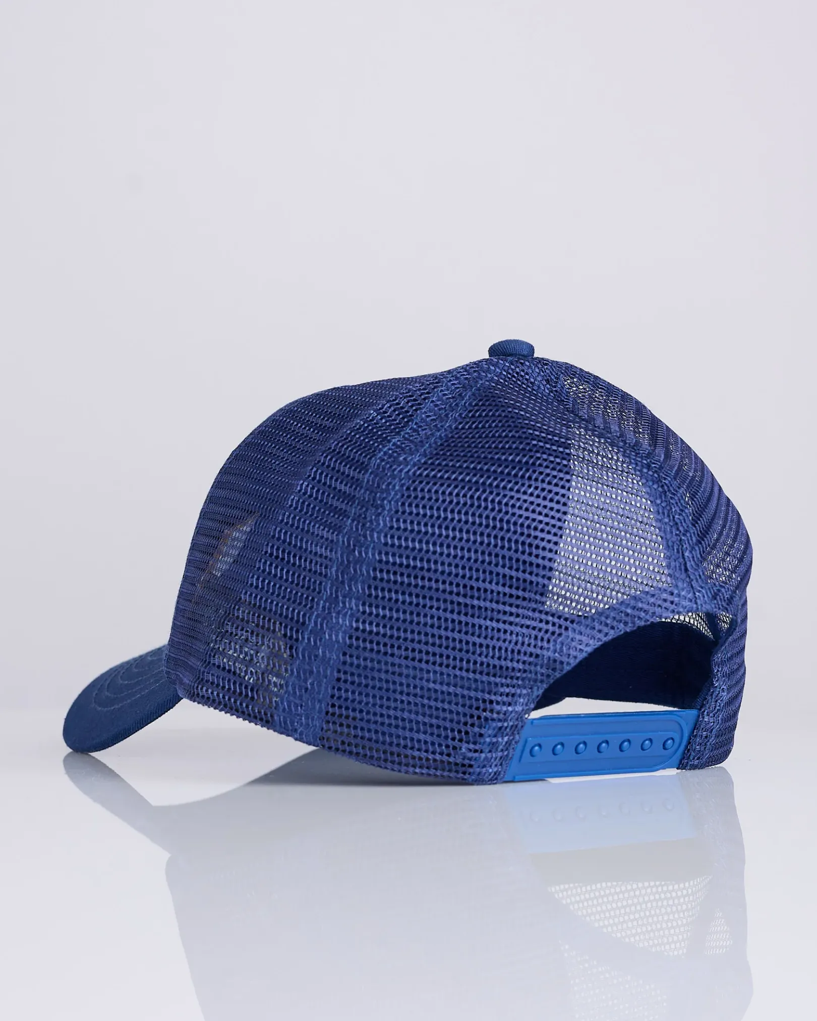 Low profile five panel trucker cap in cotton twill. Stüssy logo in raised embroidery at the crown.