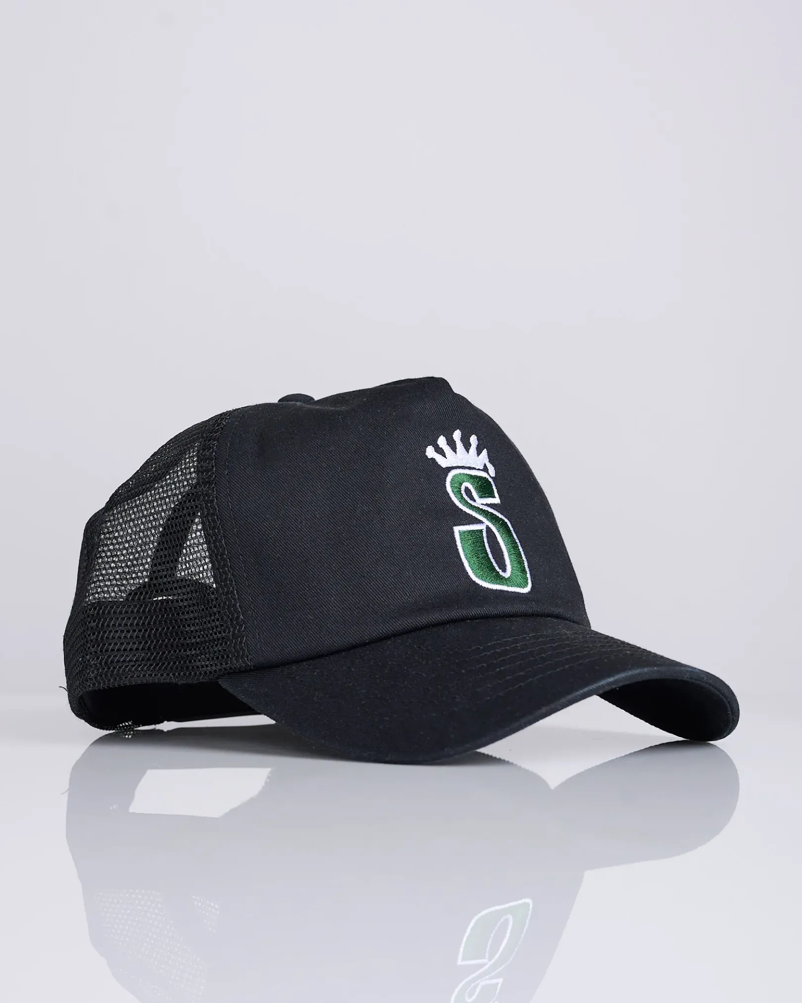 High crown five panel trucker cap in cotton twill. Stüssy S crown logo embroidery at front.