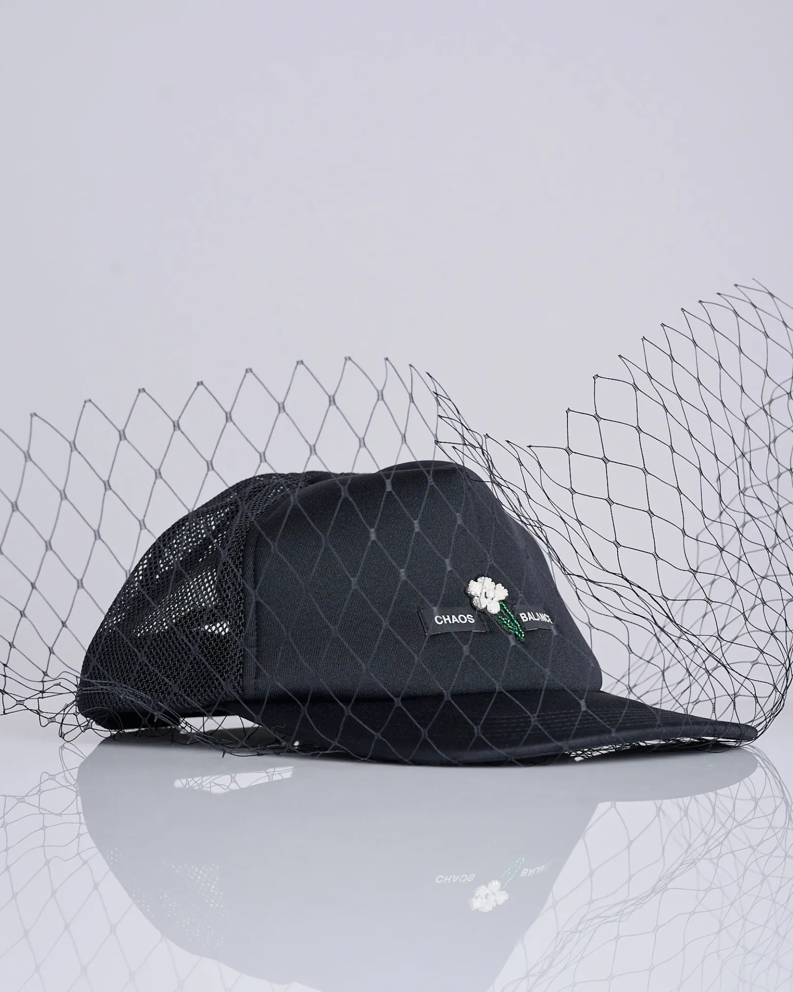 Blending subversive detail with classic streetwear, the Mesh Veil Trucker Cap from UNDERCOVER features bead embroidery and ribbon detailing at the front, along with the brand’s iconic Chaos/Balance logo. Designed with a removable mesh veil, this unique take on the trucker silhouette fuses punk attitude with refined craftsmanship.