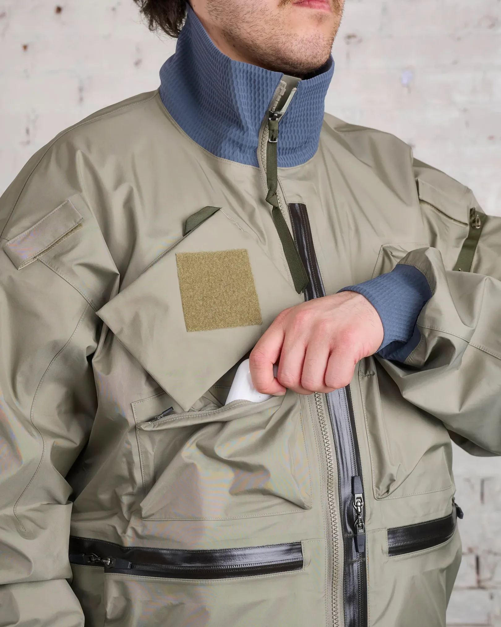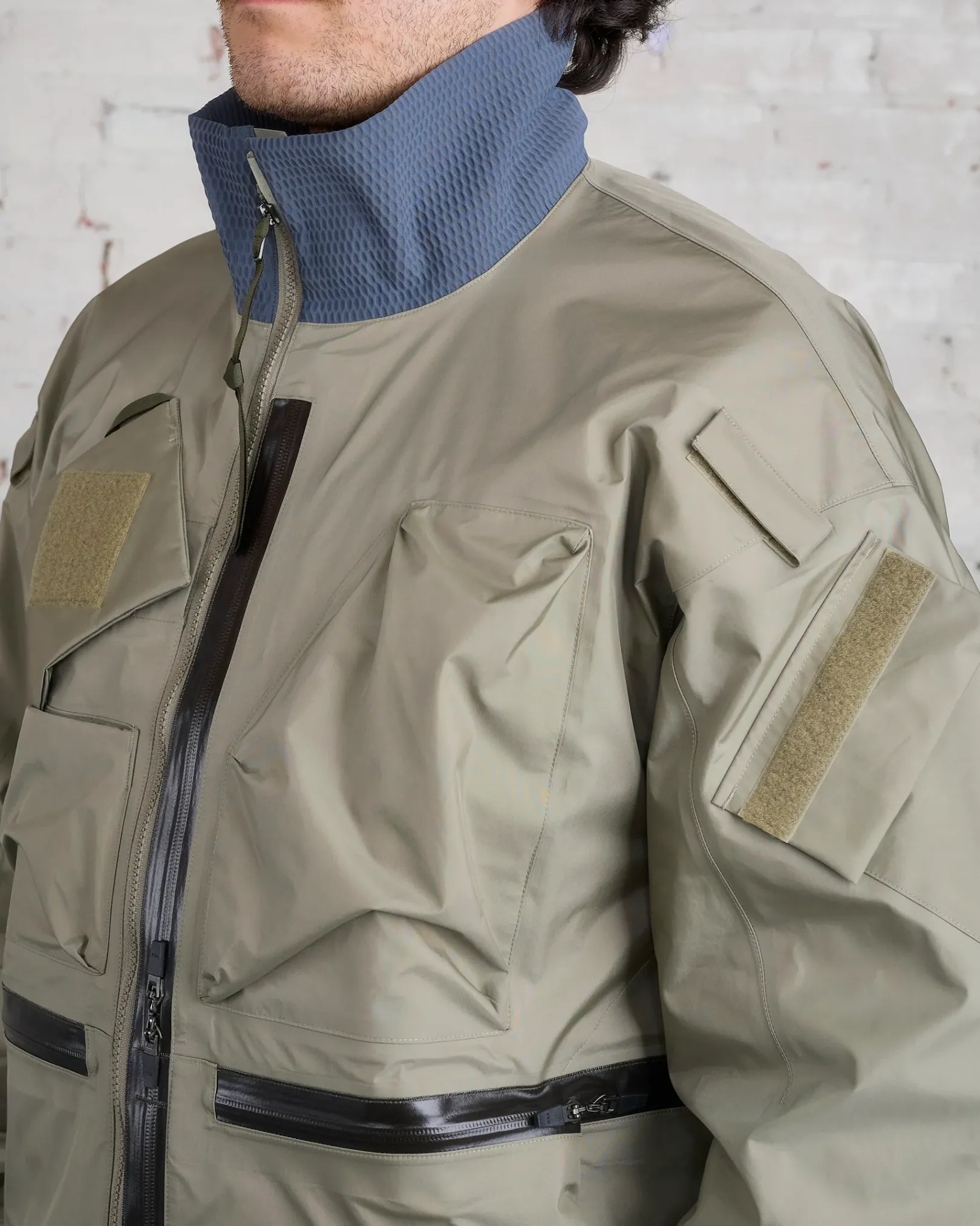 ‘My new jacket can hold the bridge.’ Demi-oversized blouson bomber with asymmetric Interopsǽ compatible pocket layout. Gore-Tex® 3L shell fabric and dimensional flex cuffs. Modular spikes on left shoulder pocket and Jacketslingǽ. Myriad use-driven technical details you will be discovering for years to come.