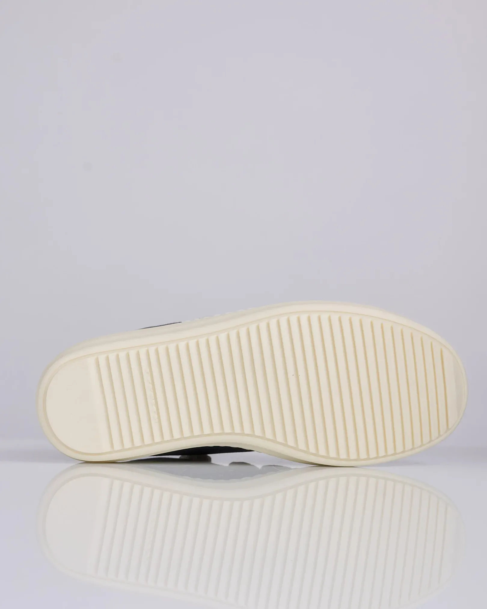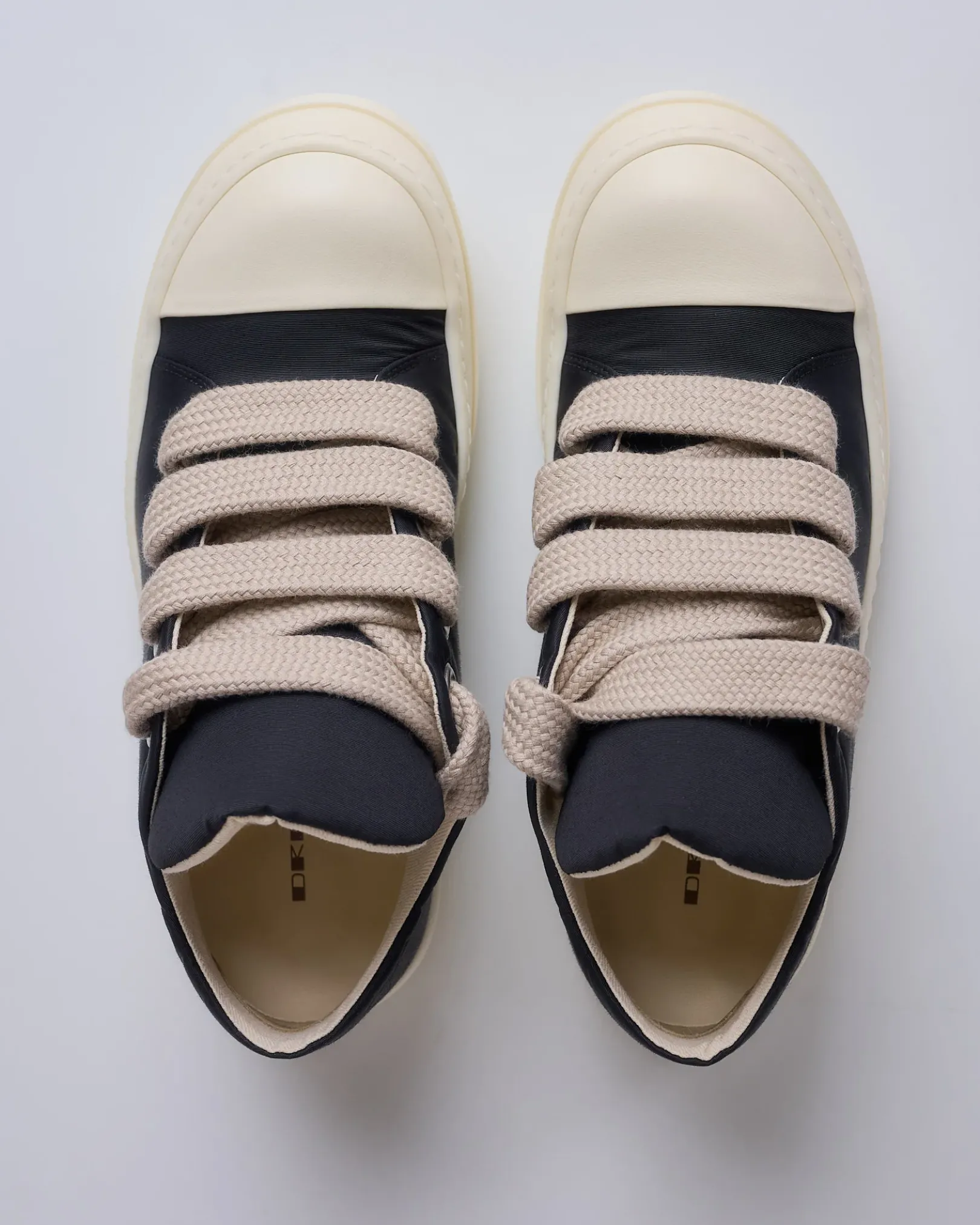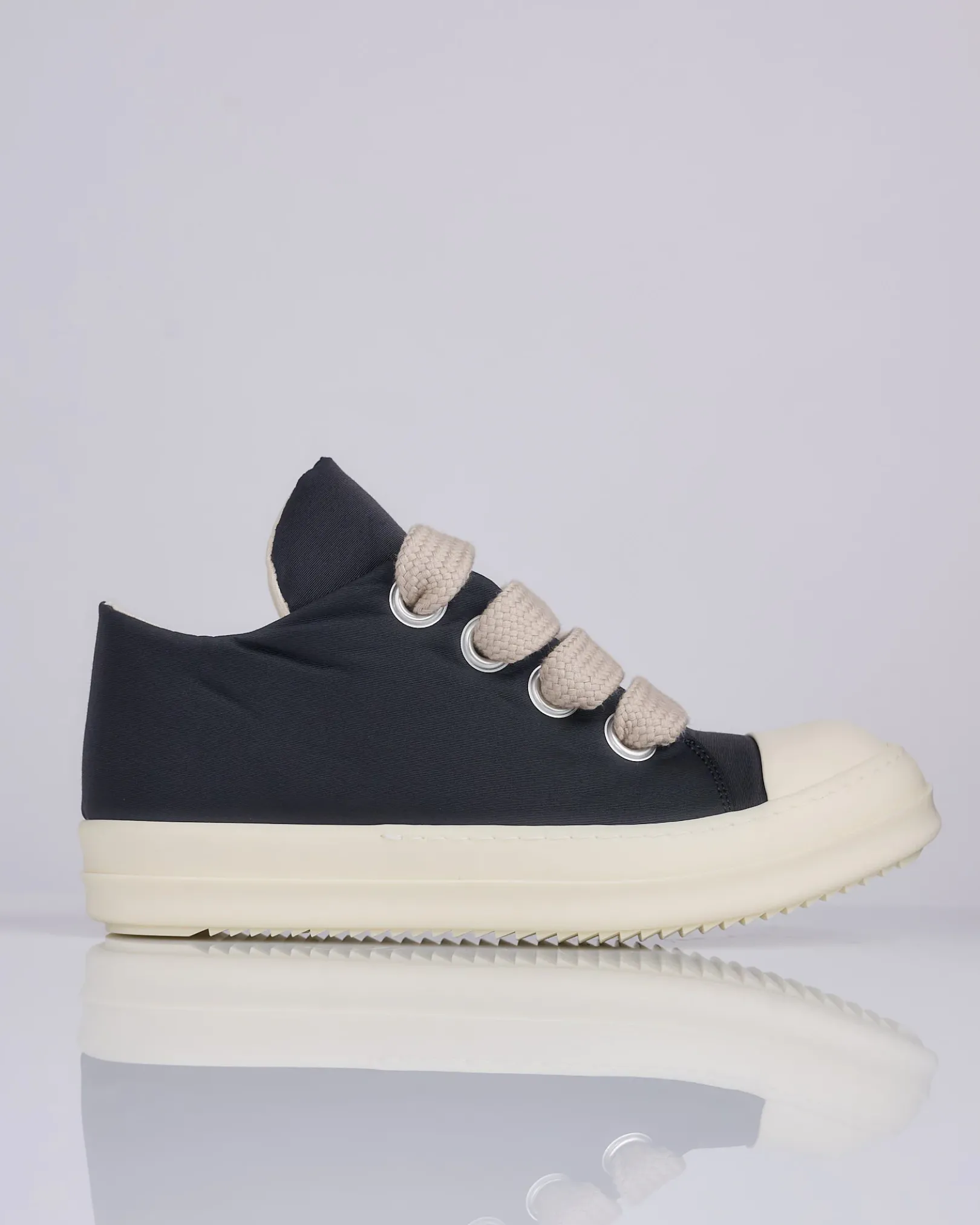 These jumbo lace puffer low sneaks are under ankle height. They are a blown up version of Rick’s signature low sneaks, with a cushioned outer and jumbo laces. They have four large eyelets, toe caps and shark tooth soles.