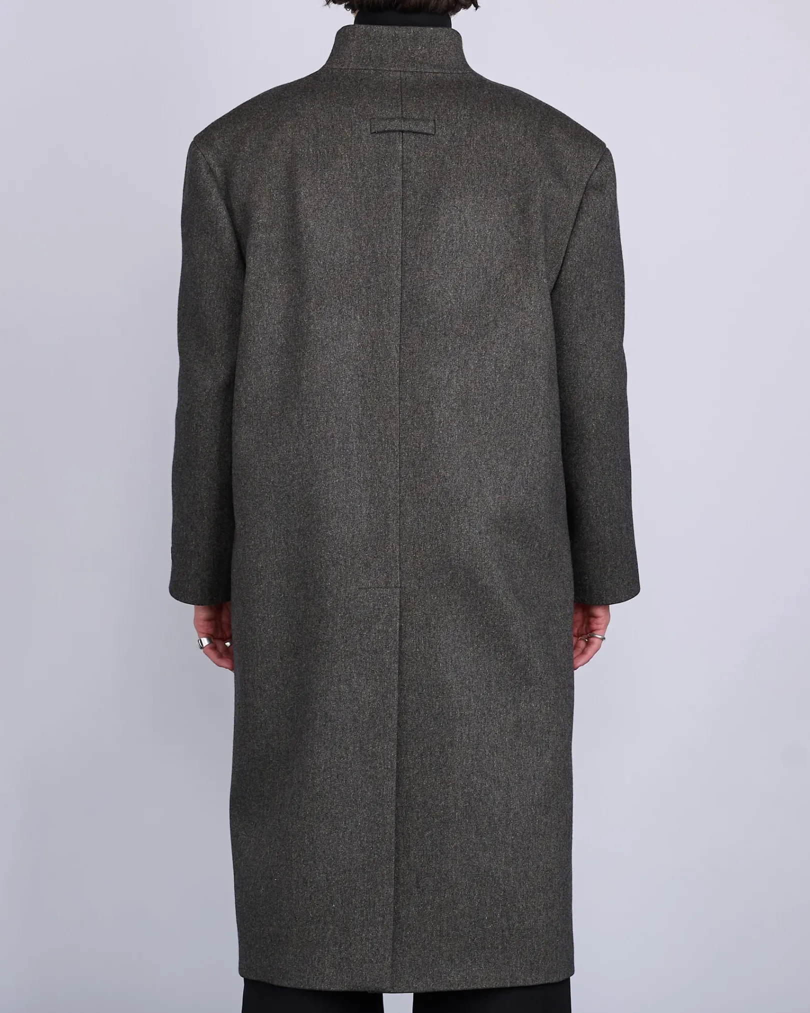 The Lapelless Coat is tailored in Italy from a sturdy military wool-cotton blend to provide a strong structure that is softened by iridescent cupro lining. The lapelless, double-breasted style is voluminous in the body to provide comfortable layering. Details include horn button closures, side pockets, and a leather Fear of God stitched on the sleeve.
