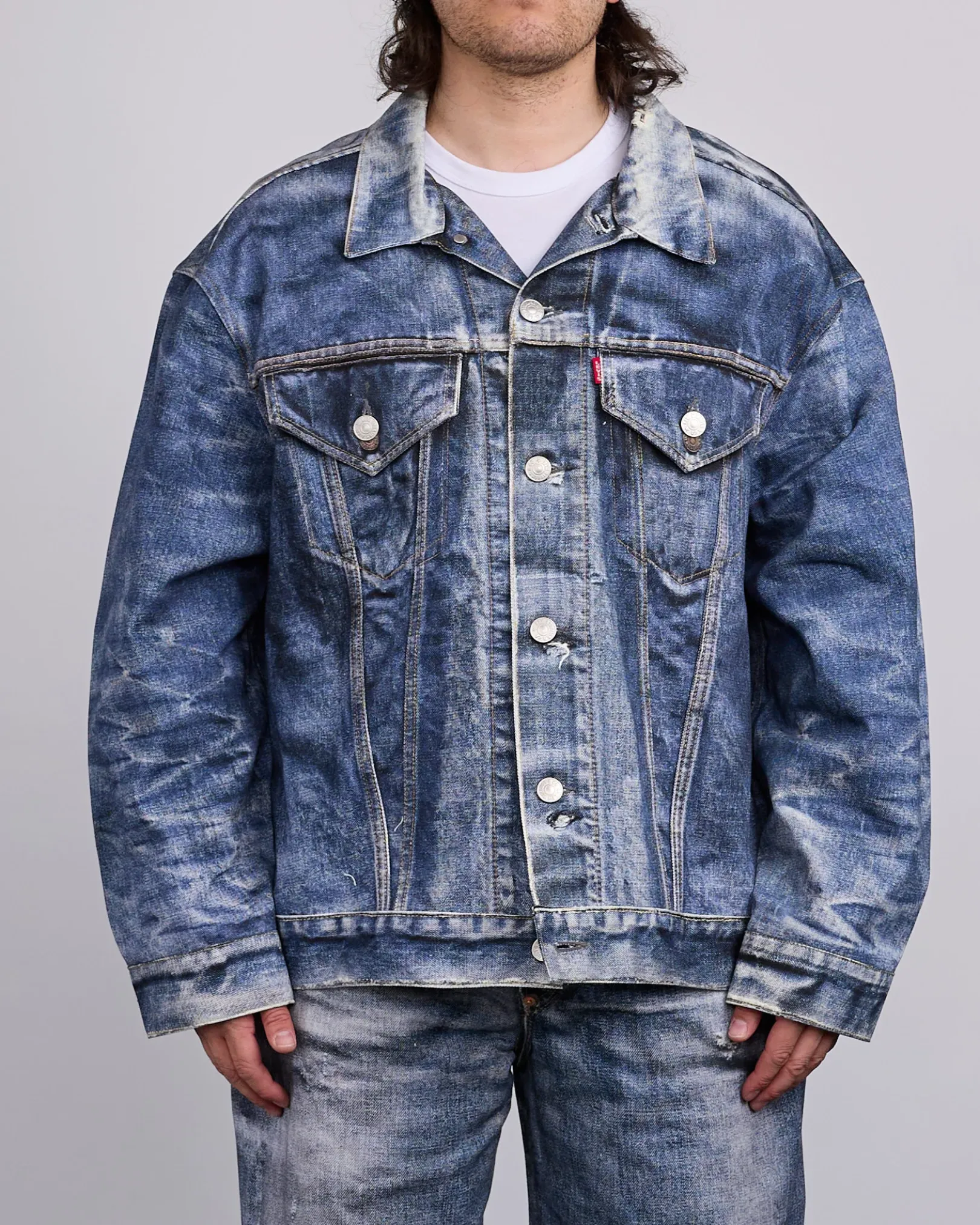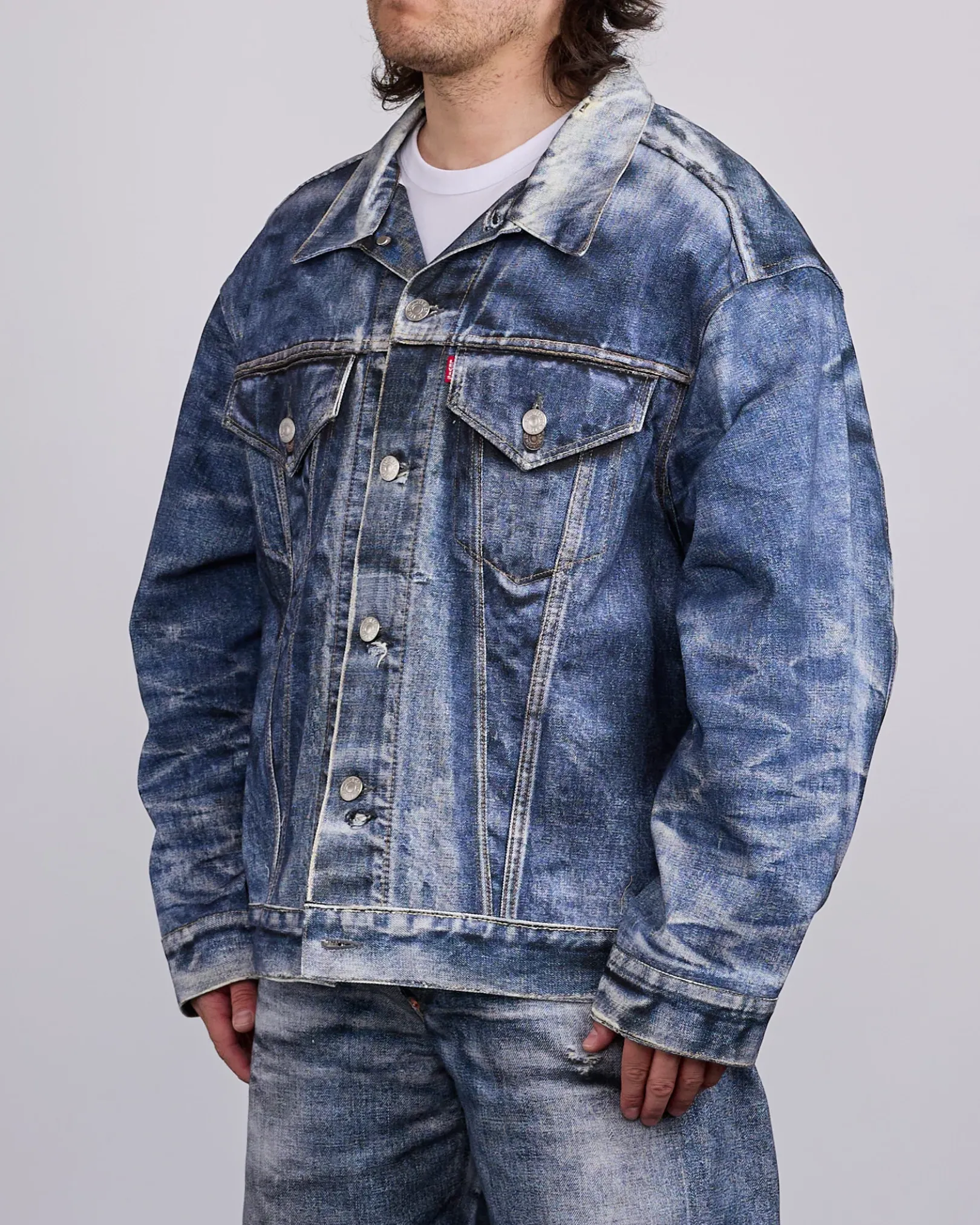 This standout piece from Junya Watanabe MAN in collaboration with Levi’s features an inkjet-printed trompe l’oeil design, creating the illusion of classic denim while offering the comfort of lightweight cotton. Inspired by vintage silhouettes and Japanese archival influence, the oversized fit delivers a modern, relaxed profile. Details include two front flap pockets, buttoned cuffs and waist, and precise tailoring synonymous with Junya’s craftsmanship.