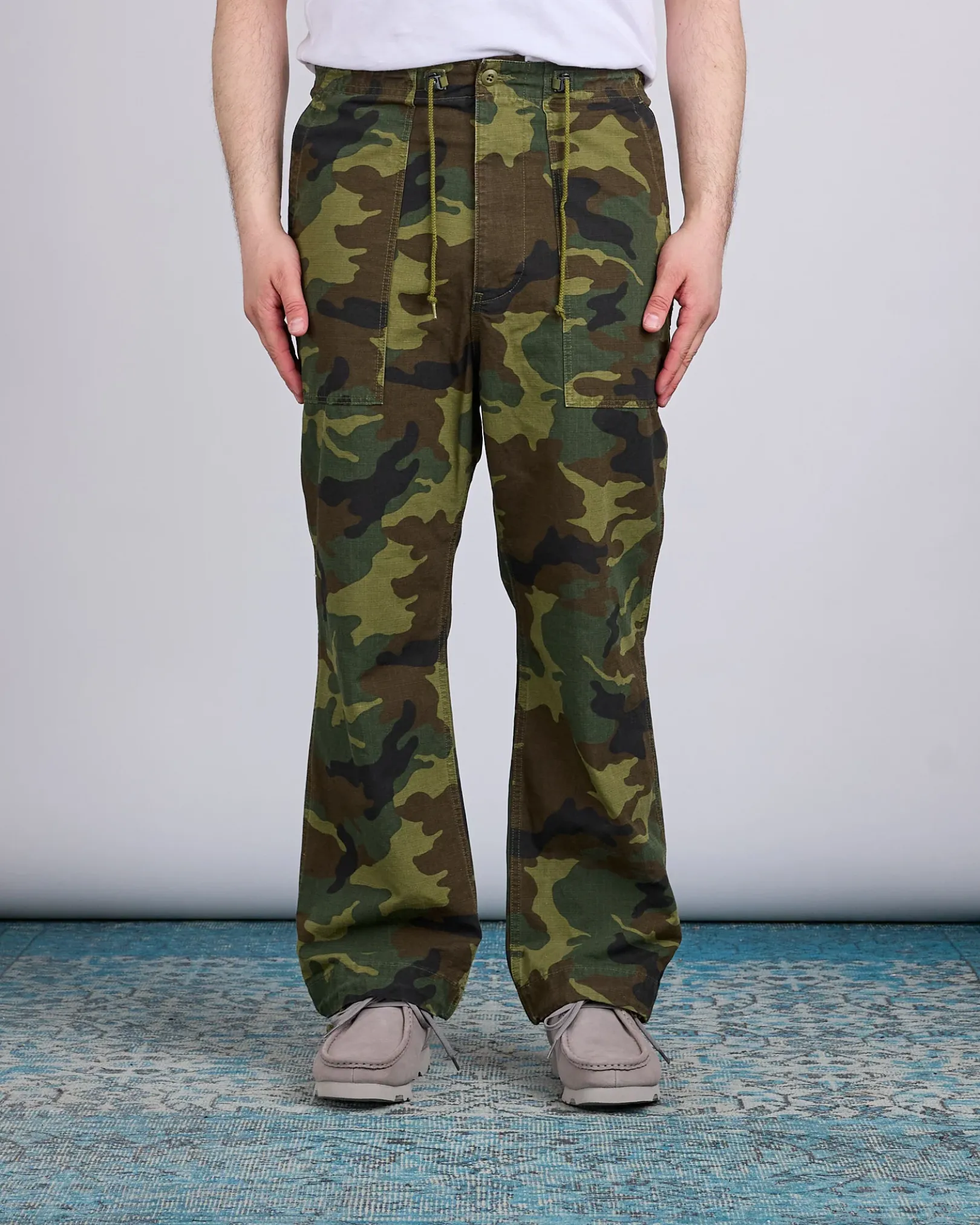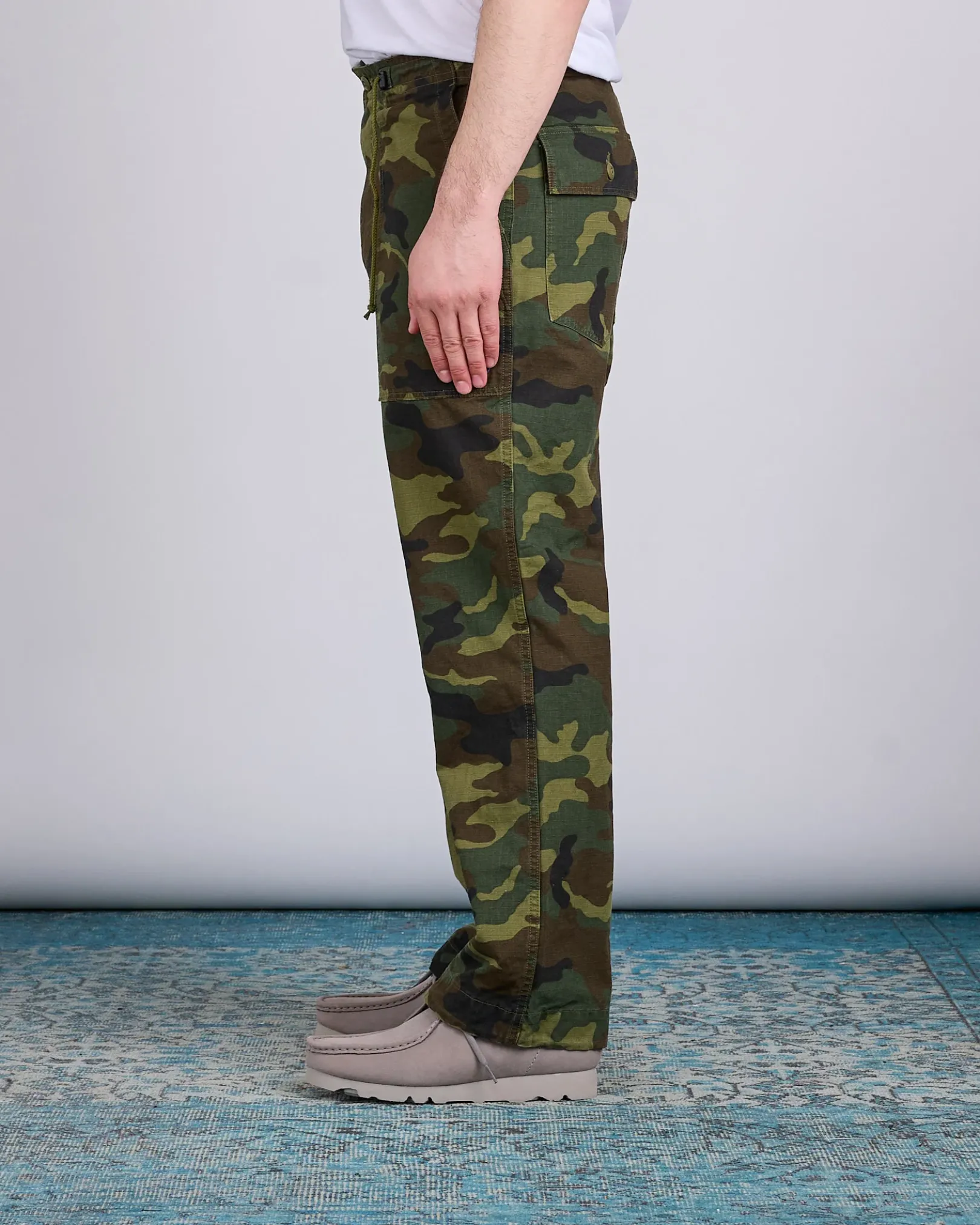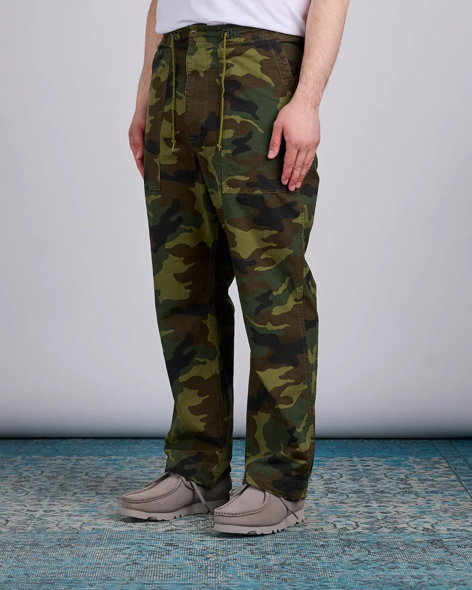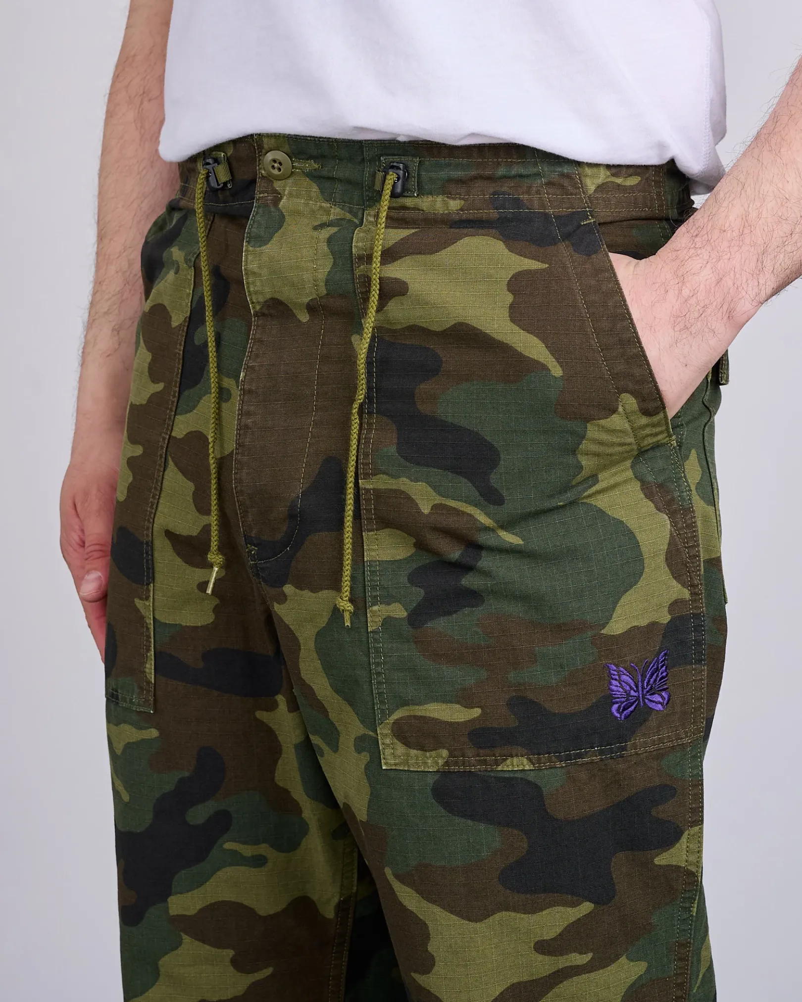 The String Fatigue Pant from Needles channels military inspiration through a fashion-forward lens, cut from durable cotton ripstop in a bold camo print. Designed with a wide-leg silhouette, these pants feature fatigue-style front pockets, buttoned back patch pockets, and an adjustable drawstring waist. A signature purple butterfly logo is embroidered at the front pocket for a subtle yet iconic finish.