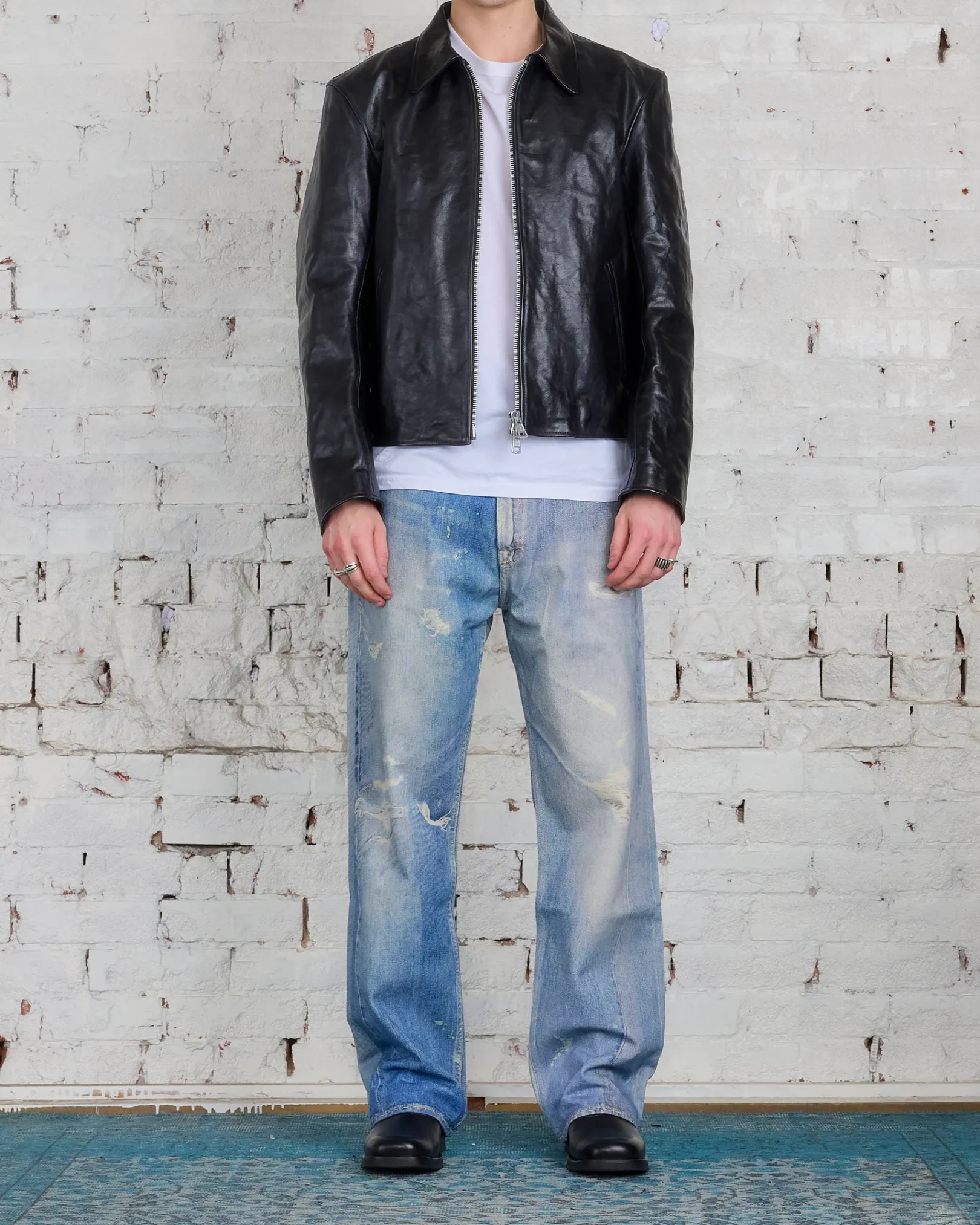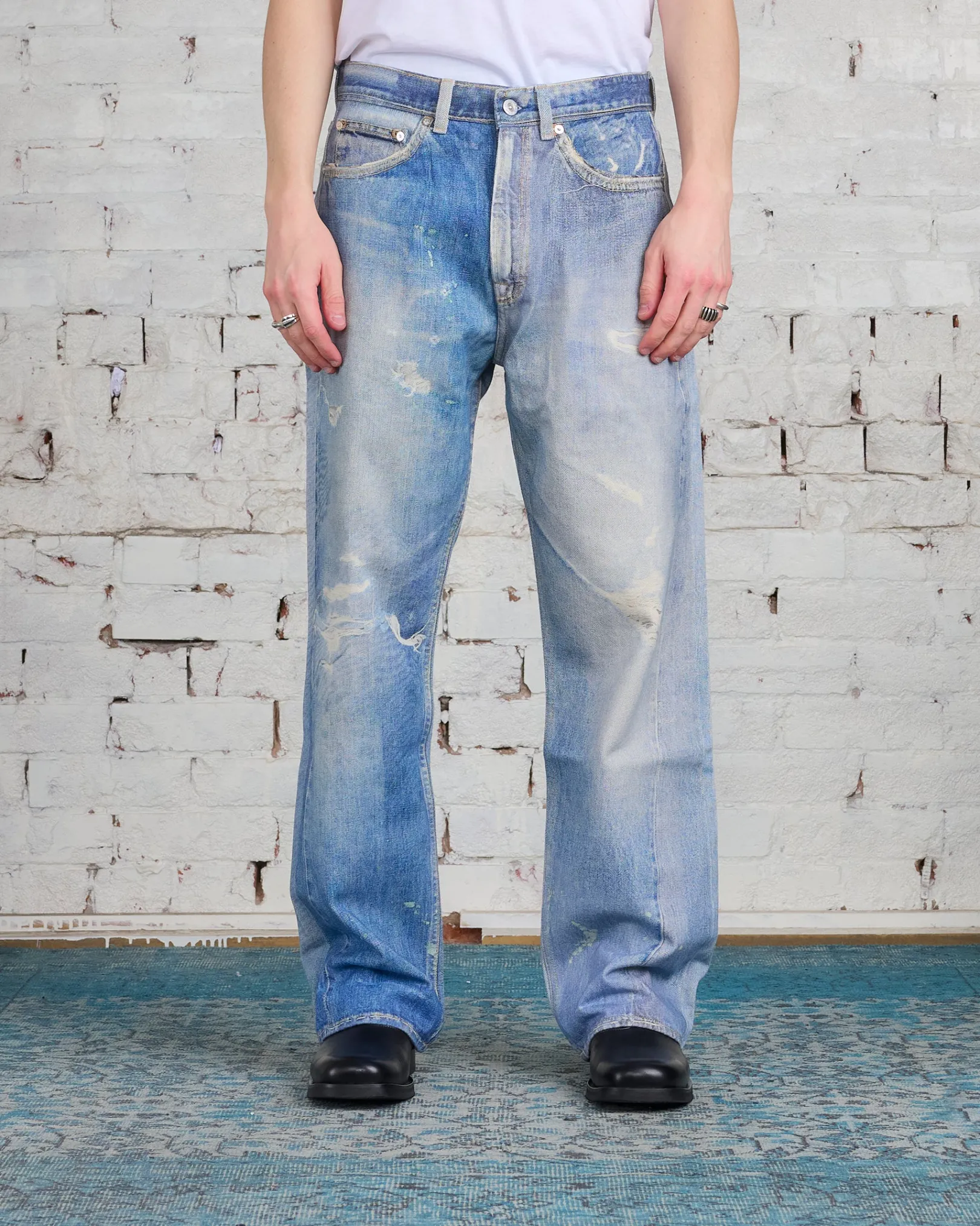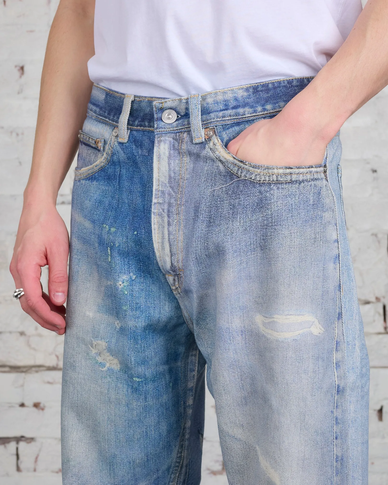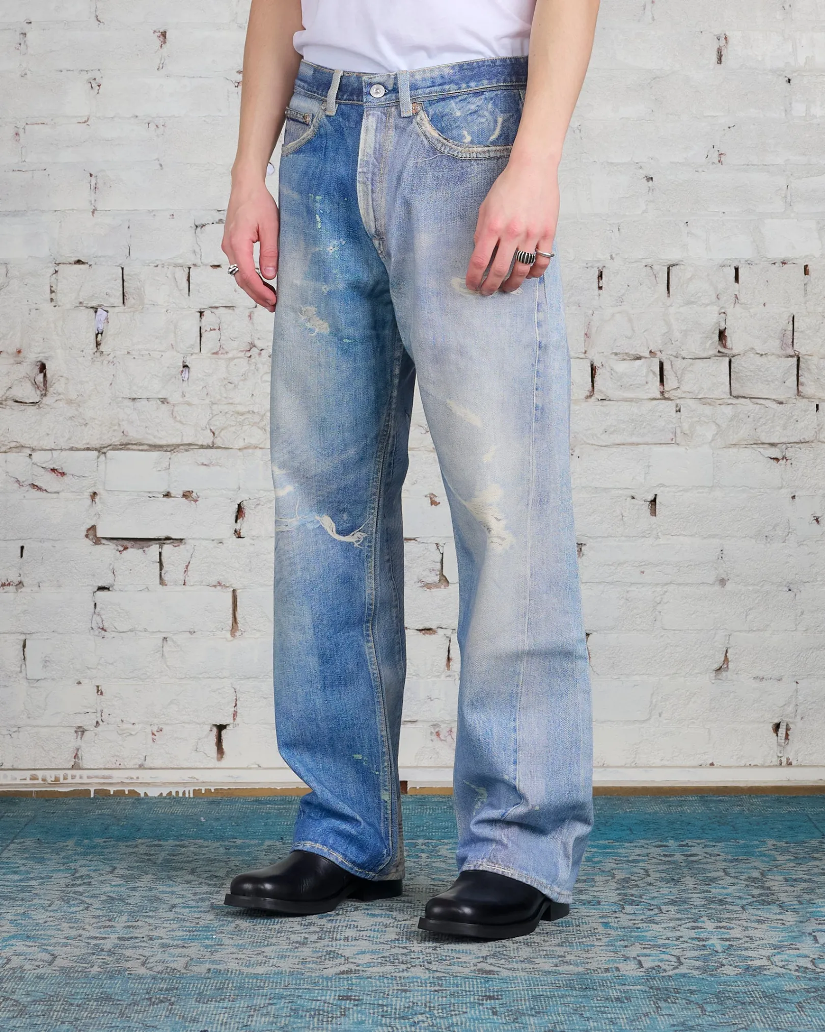 Our Legacy Third Cut Jeans in Digital Denim Print. Produced in an Italian denim with a trompe l’oeil vintage denim print, the mens Third Cut jeans have a relaxed, wide legged fit and feature a YKK zip fly, metal rivets and reinforced back pockets.