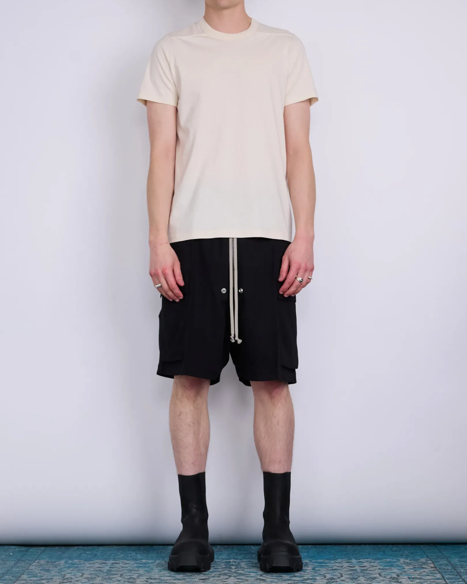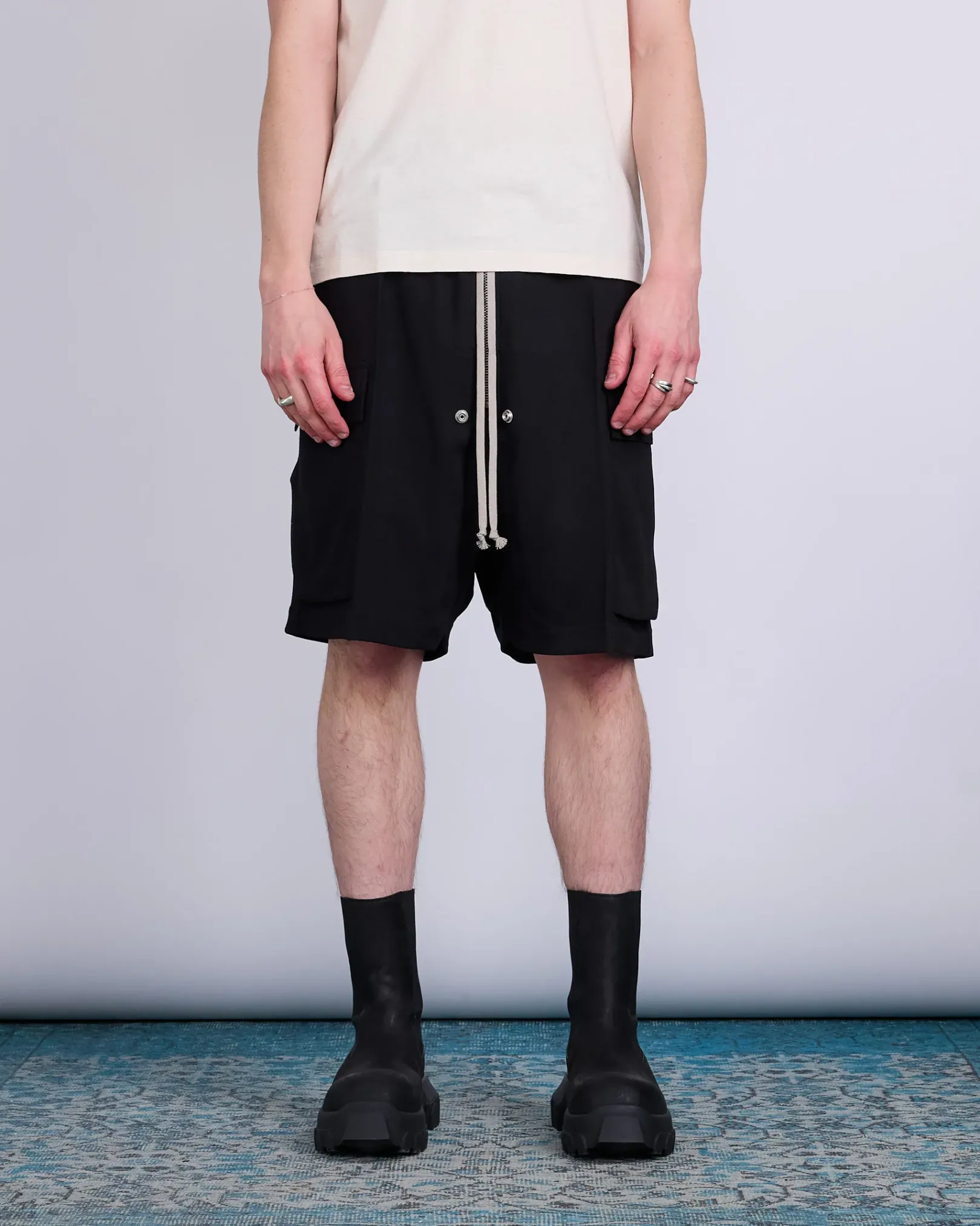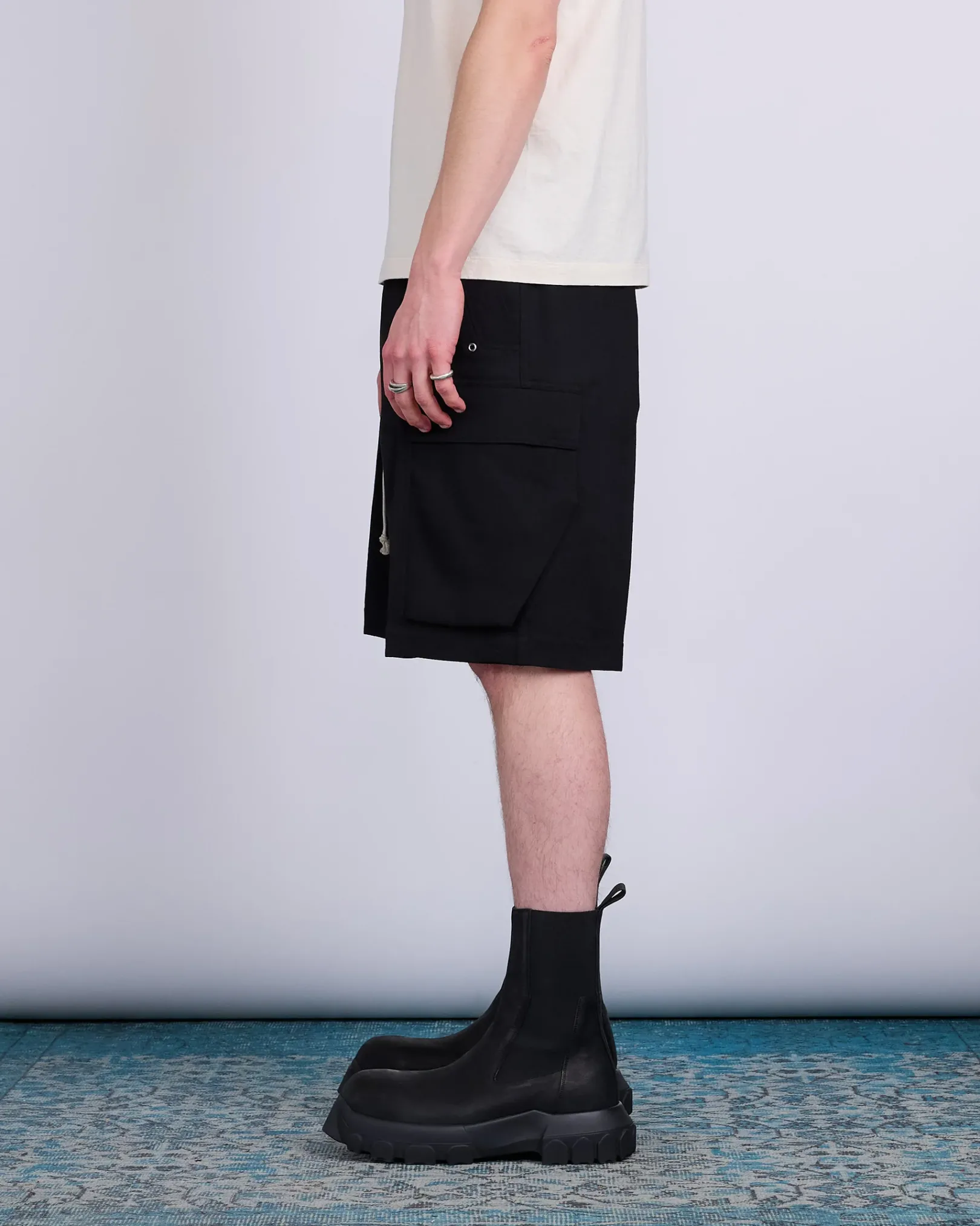 Rick Owens SS25 HOLLYWOOD cargobela shorts in black wool stable