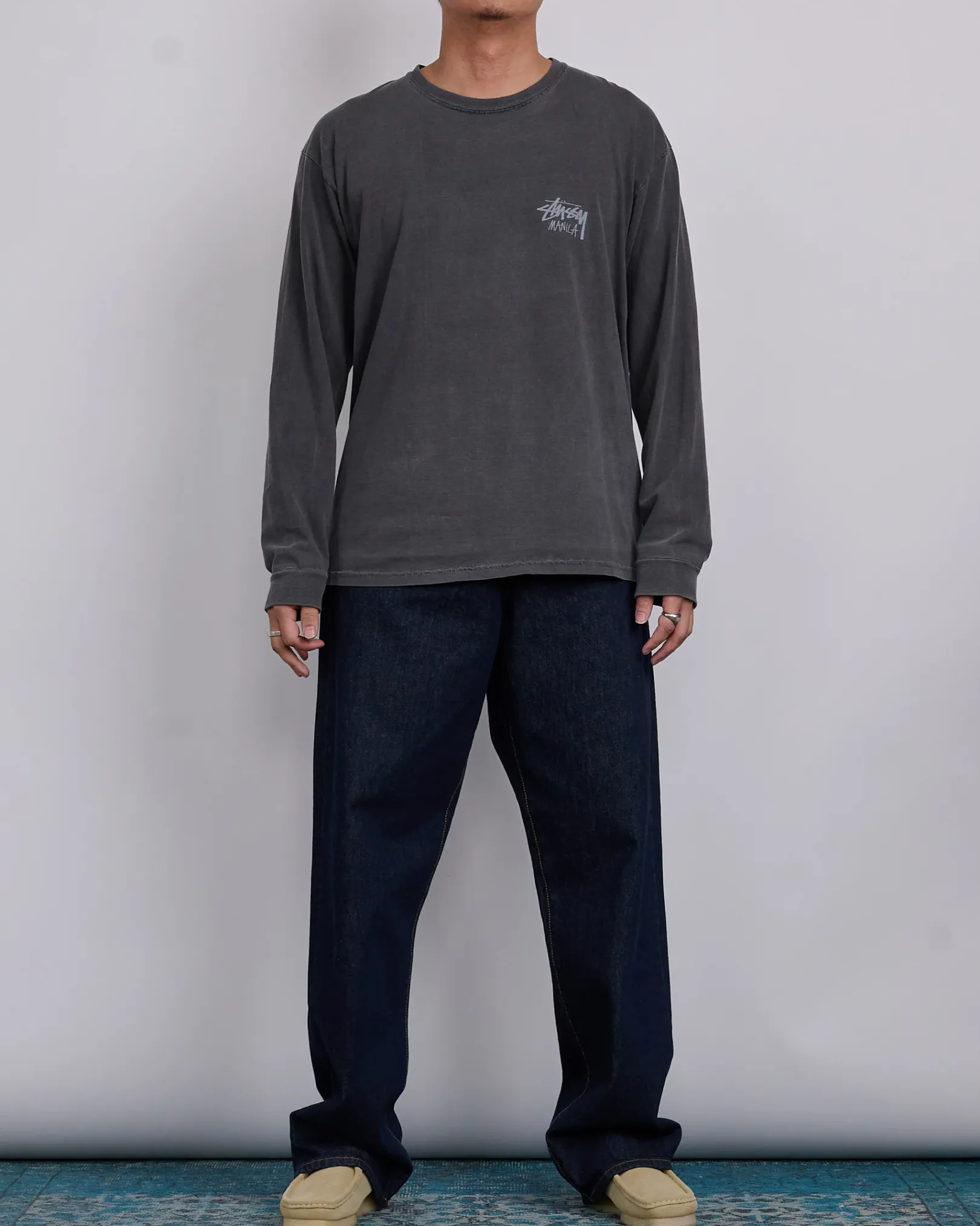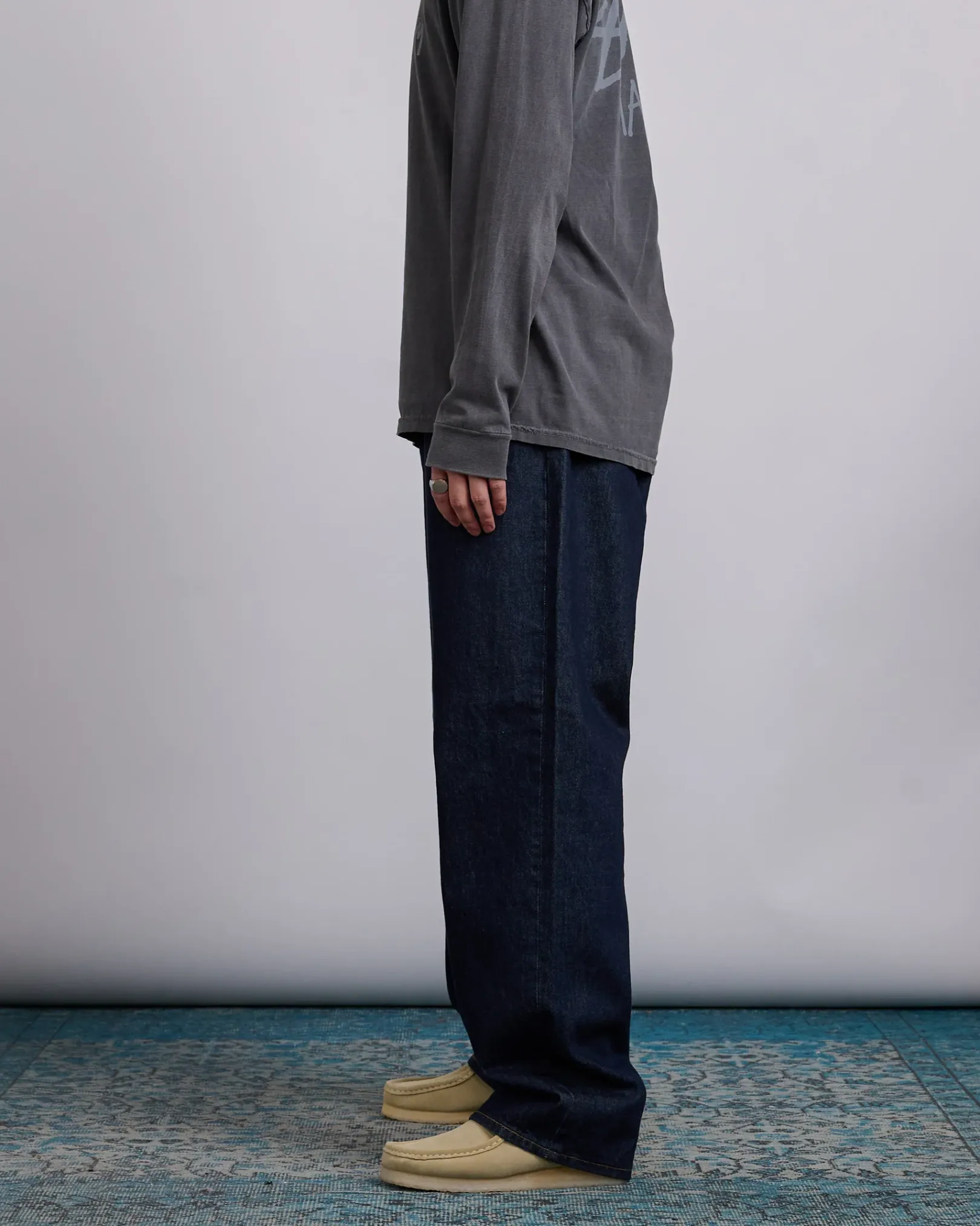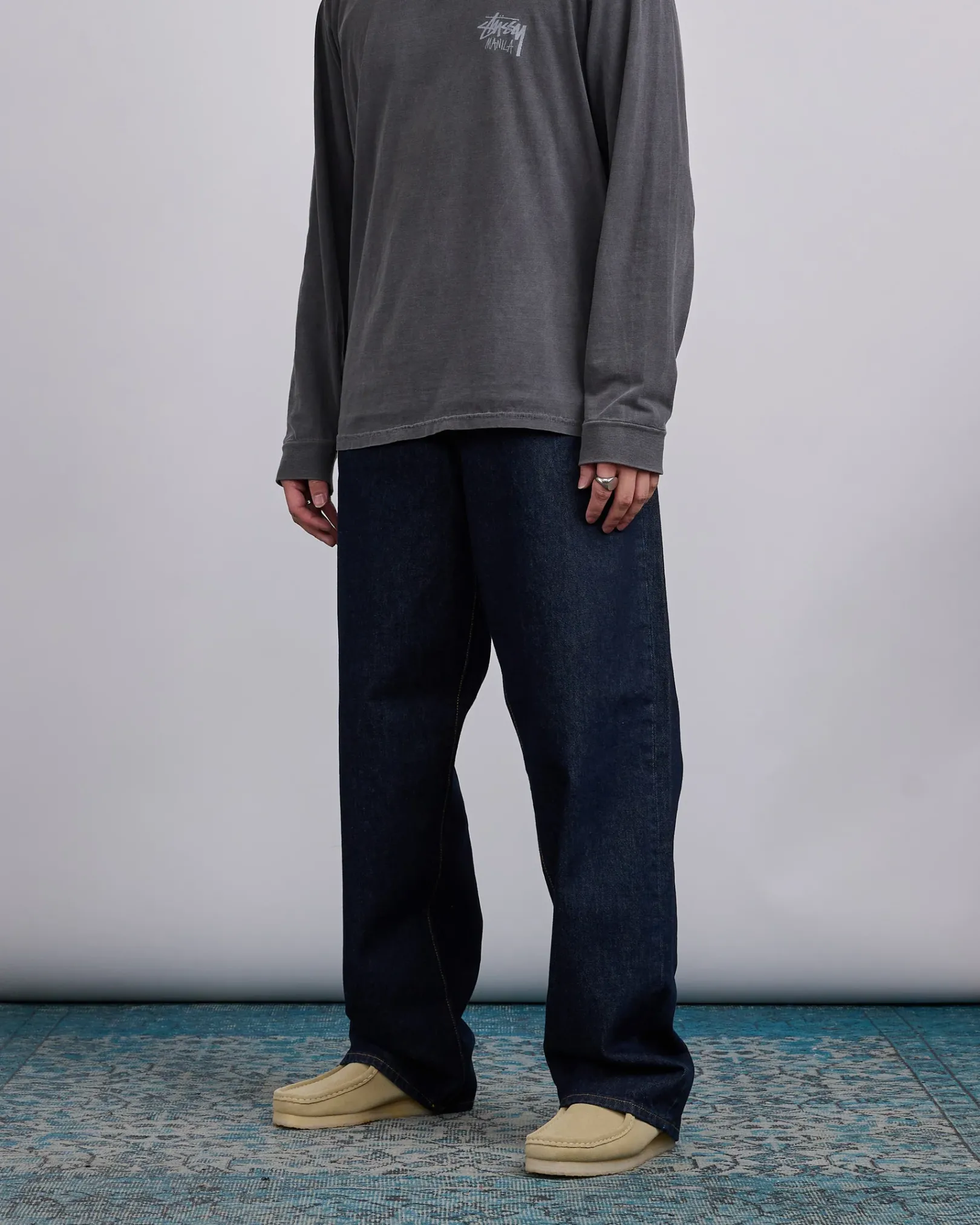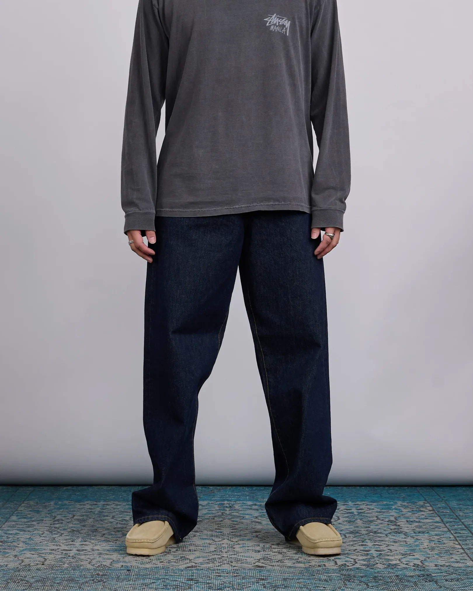 Baggy jean in 14.5oz denim. Oversized waist with a relaxed rise, tapered cut, and roomiest thigh fit of Stüssy’s denim range. Features branded nickel shank hardware and a suede Stüssy logo patch. Size down for a more true-to-size fit in the waist.