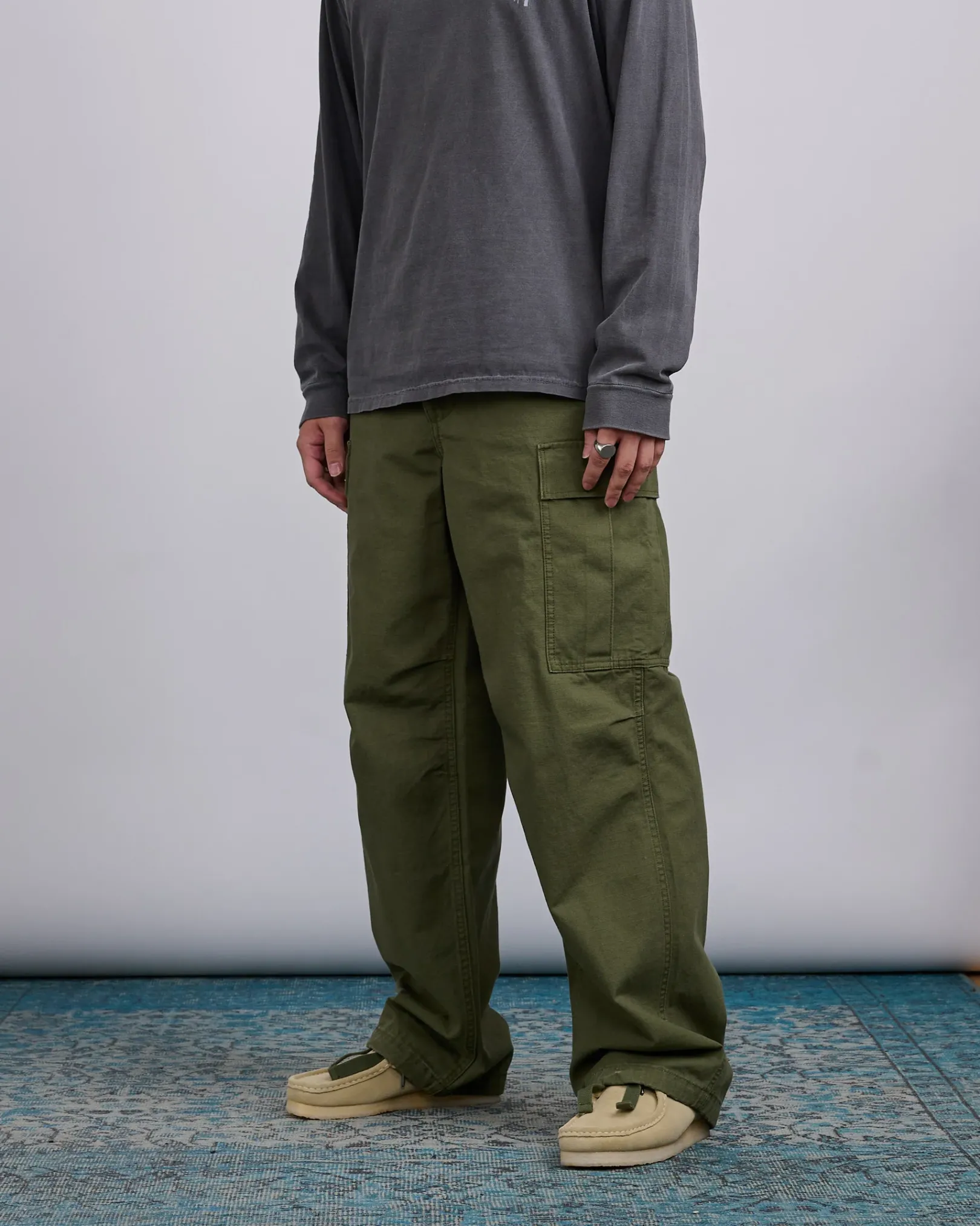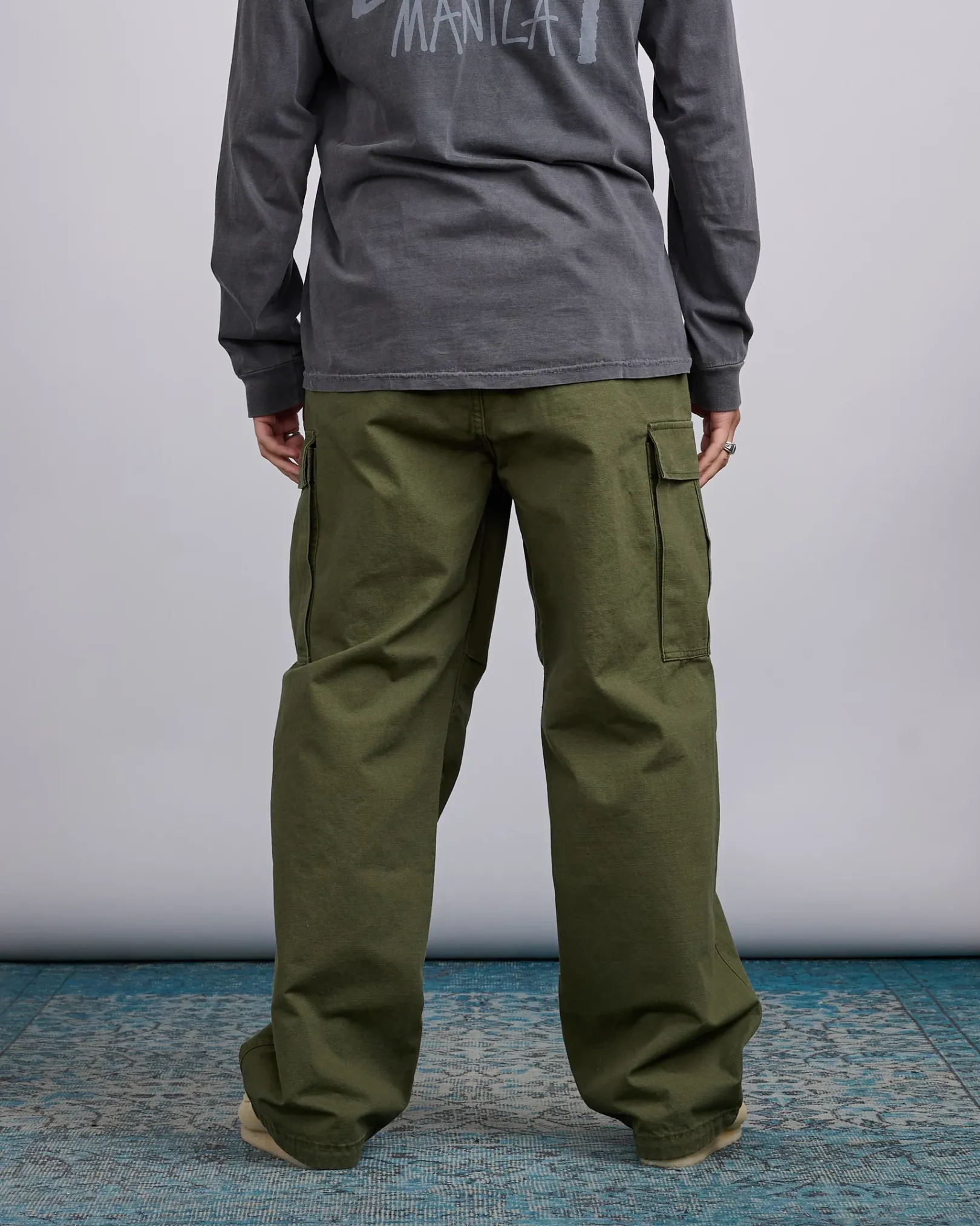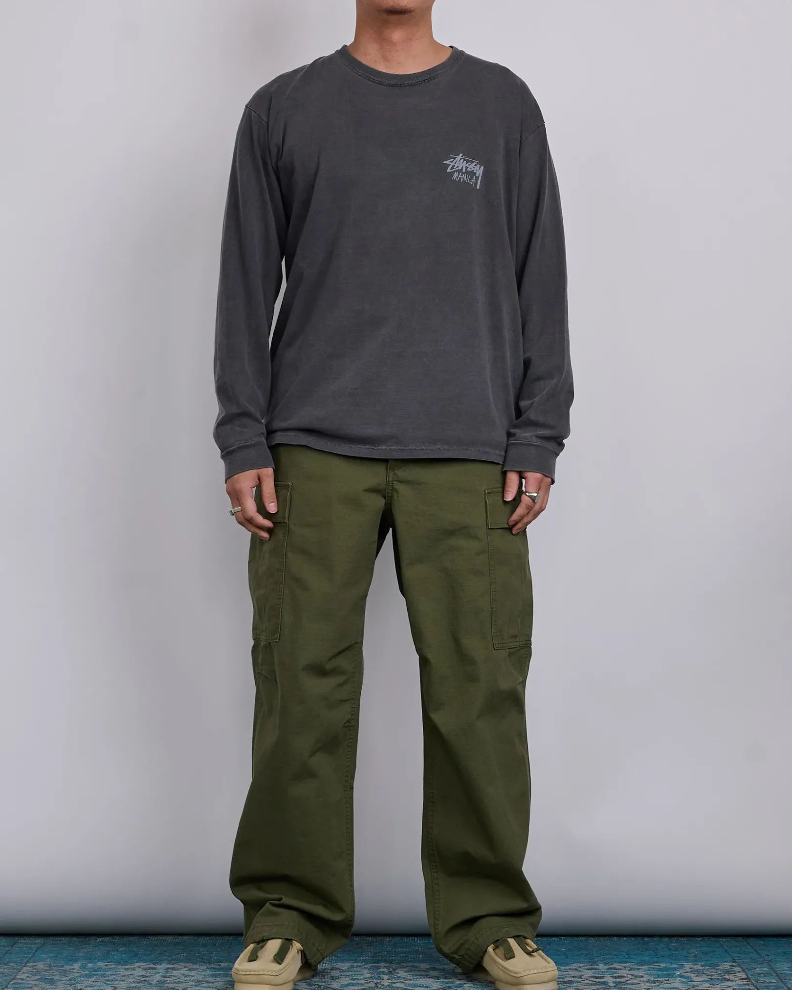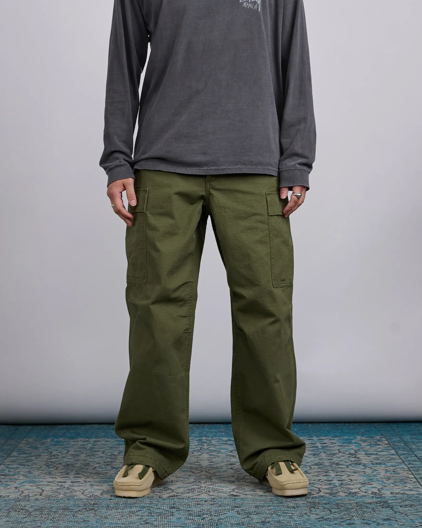 Relaxed fit cargo pant in washed cotton ripstop. Features flap pockets, adjustable waist tabs and flat cotton drawcords at the cuffs. Stüssy stock flag label at rear pocket.