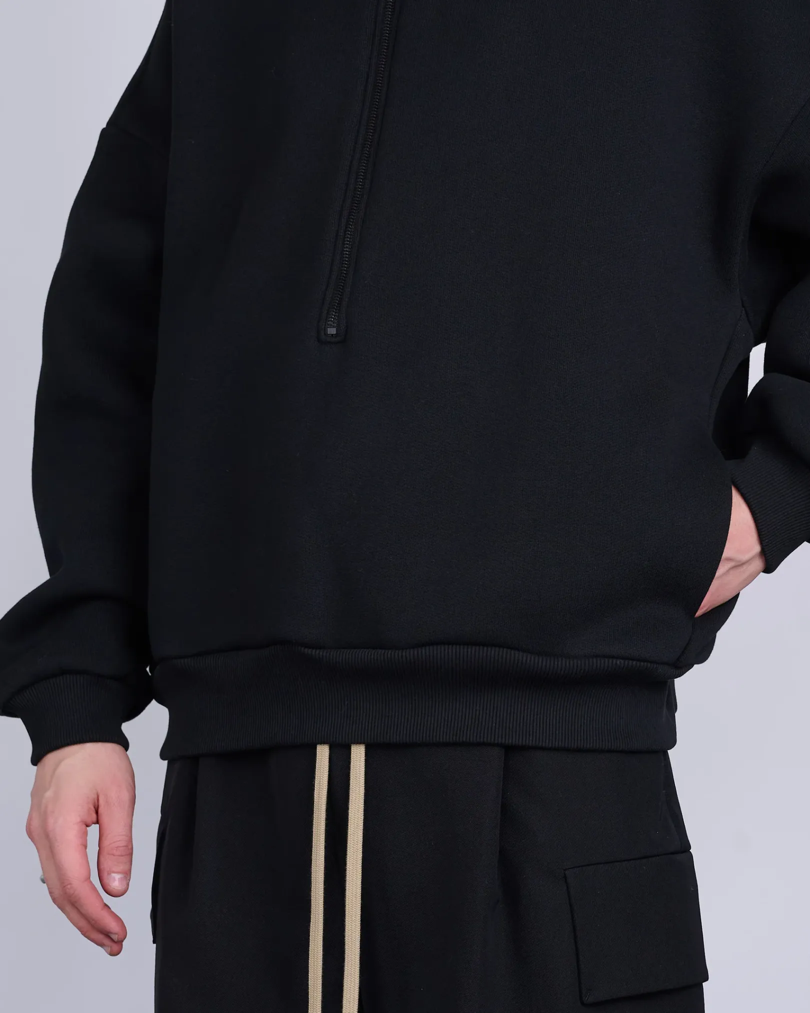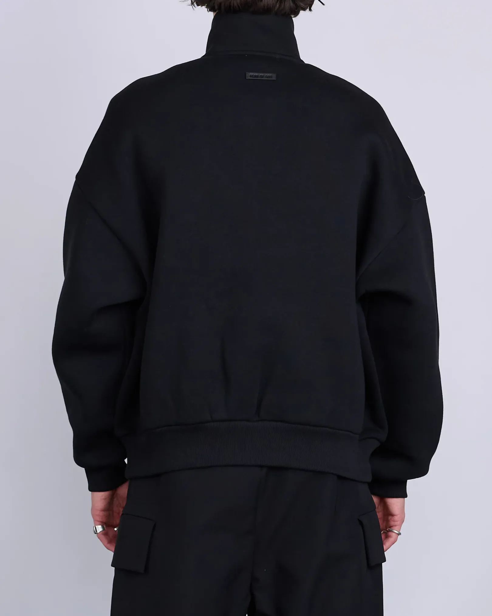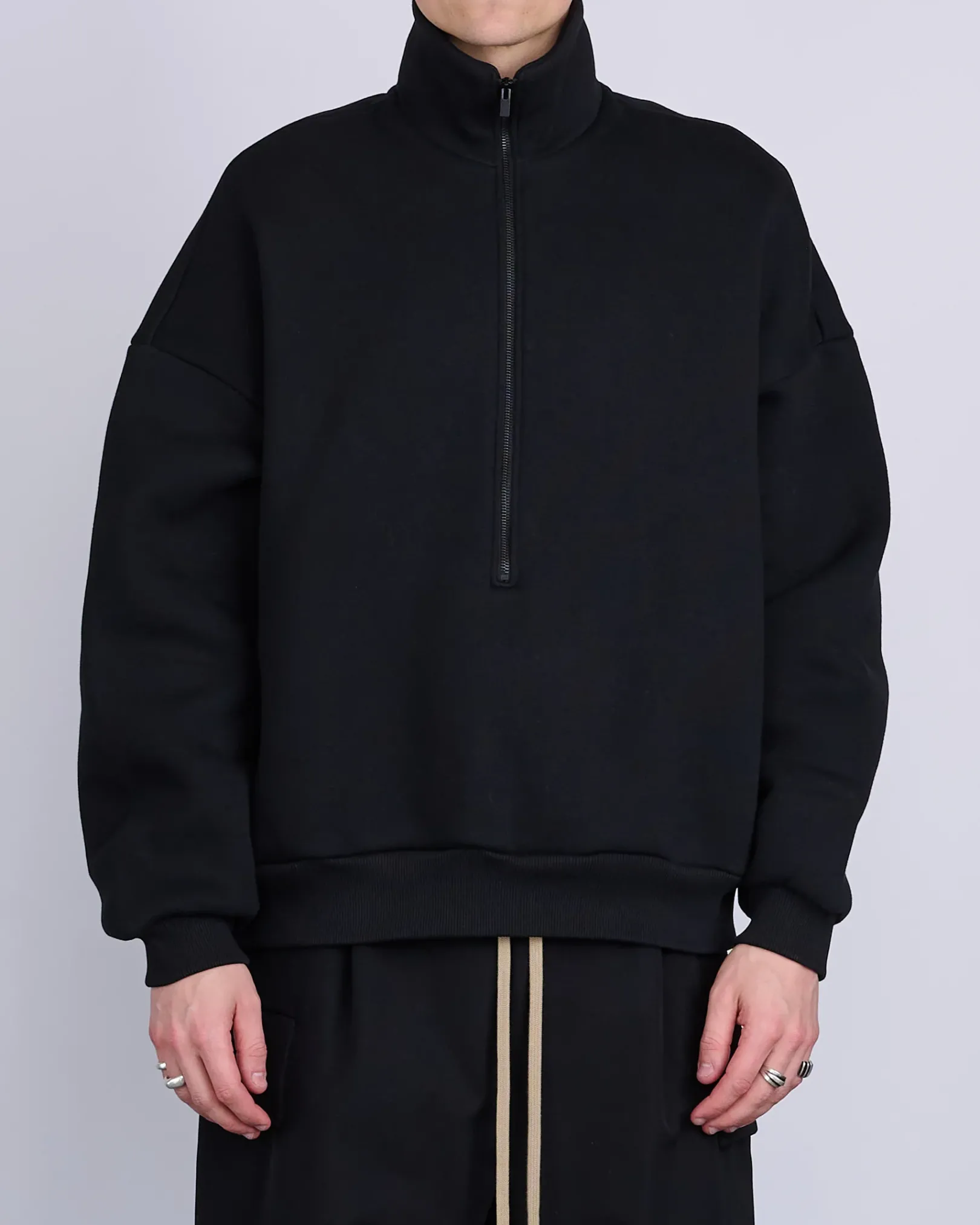 The Half Zip Mockneck is made in Portugal from a heavy cotton blend to contribute depth and softness. The signature Fear of God fit is evident with a relaxed silhouette, dropped shoulders, and wool rib-knit cuffs, and waist hem. Additional details include a half-zip front and side pockets, and a leather Fear of God label is stitched on the back.