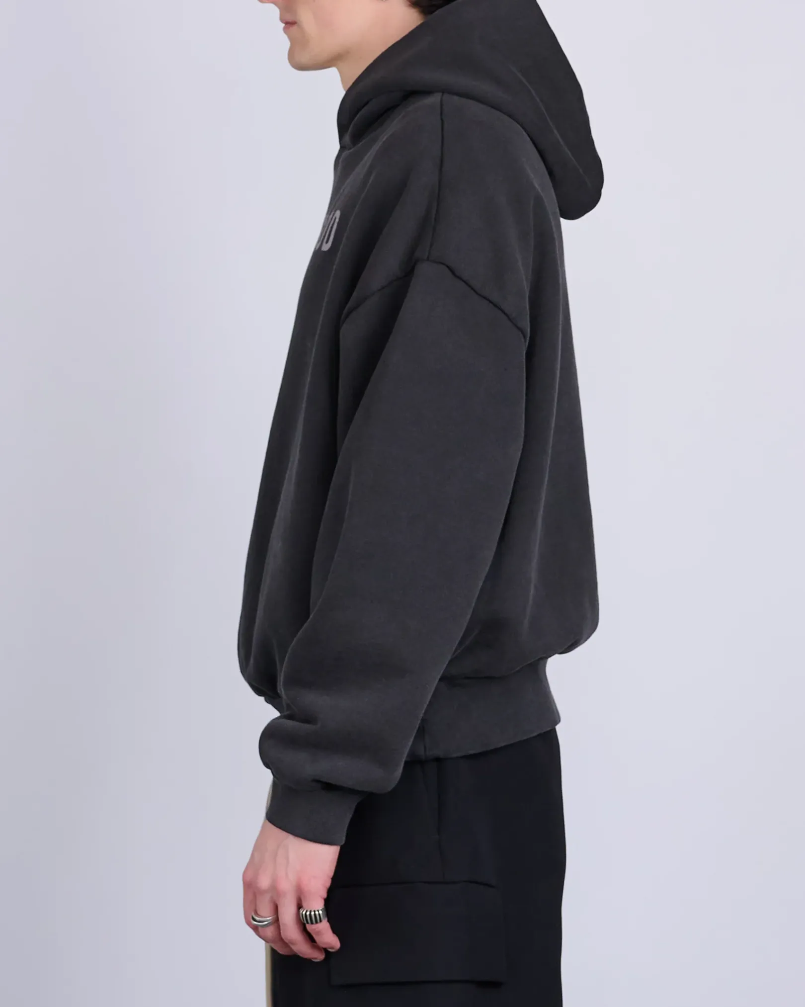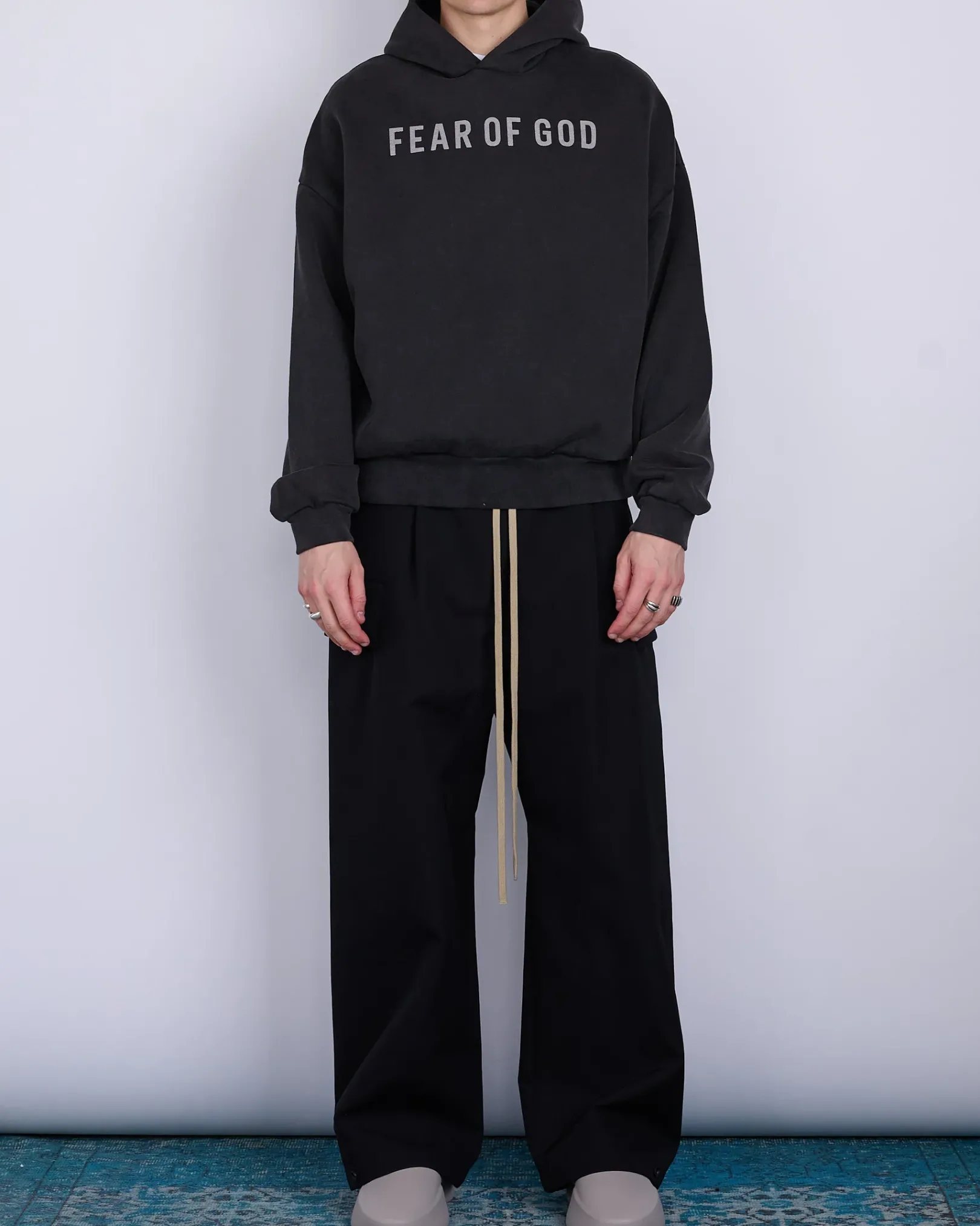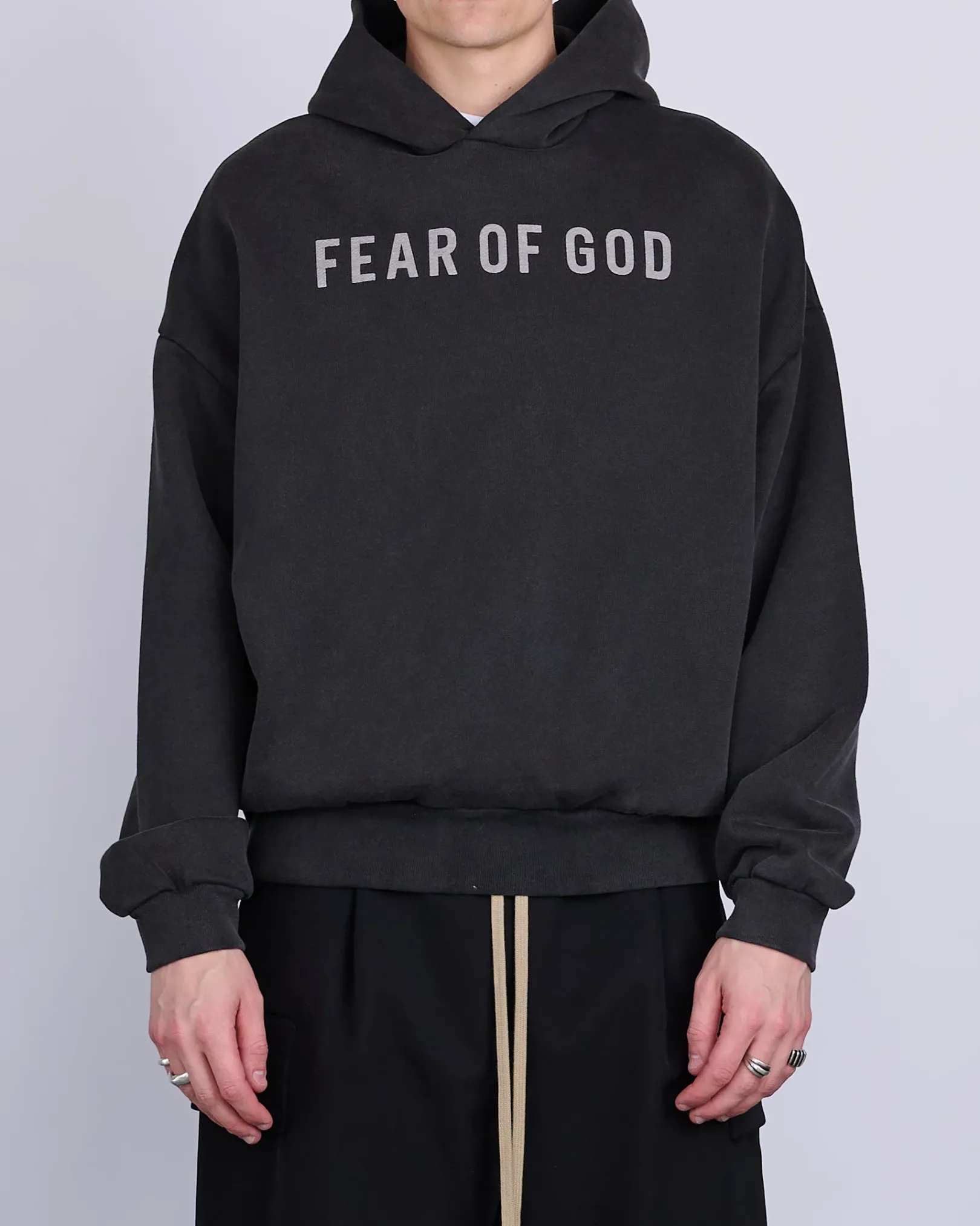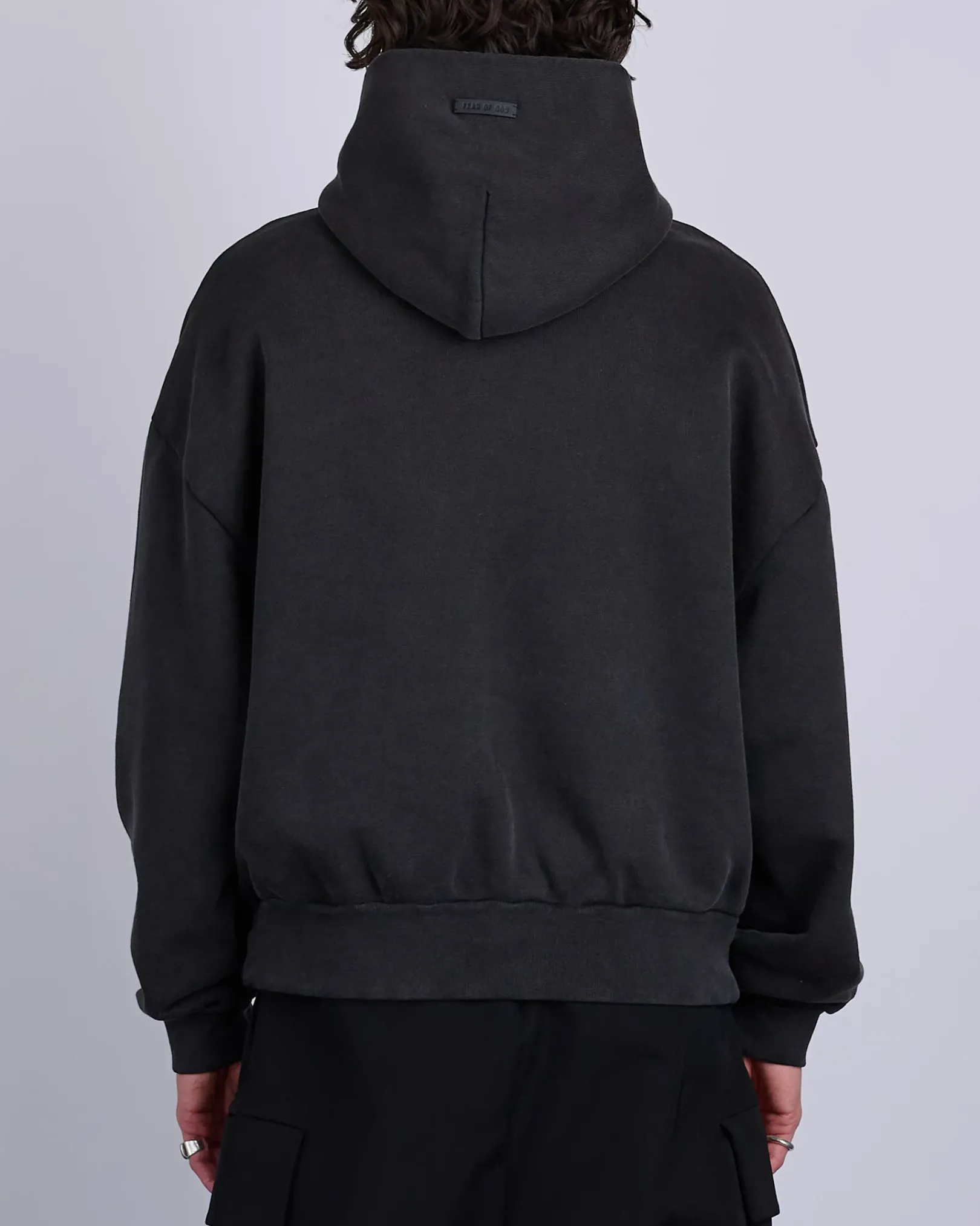 The Fear of God Hoodie is made in Portugal from 100% cotton French terry with a vintage wash to contribute depth and softness. The signature Fear of God fit is evident with a relaxed silhouette, dropped shoulders, and overlapped neckline that leads into the double-layered hood. Additional details include a printed Fear of God on the front, side pockets, rib-knit cuffs, waist hem, and leather Fear of God label.