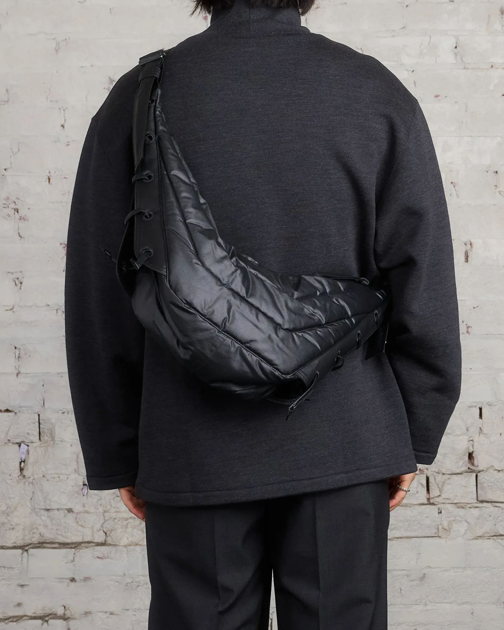 The Soft Game line is reinvented in a new fabric this season. This Medium Soft Game bag is made of a fluffy-cotton canvas treated with an icy, water-repellent finish – OCS certified. Its wadded fabric gives the bag a shiny surface and a sturdy structure that holds its shape over time. Inspired by the Croissant bag, the Medium Soft Game is lightweight yet functional thanks to its padded adjustable strap and its interior zipped pocket. It has the capacity for accessories such as a smartphone or a 4×7-inch book. On both sides of the bag, embroidered eyelets and laces allow its volume to be adapted. Ideal for daily use, this style can be worn as a shoulder or a cross-body bag.