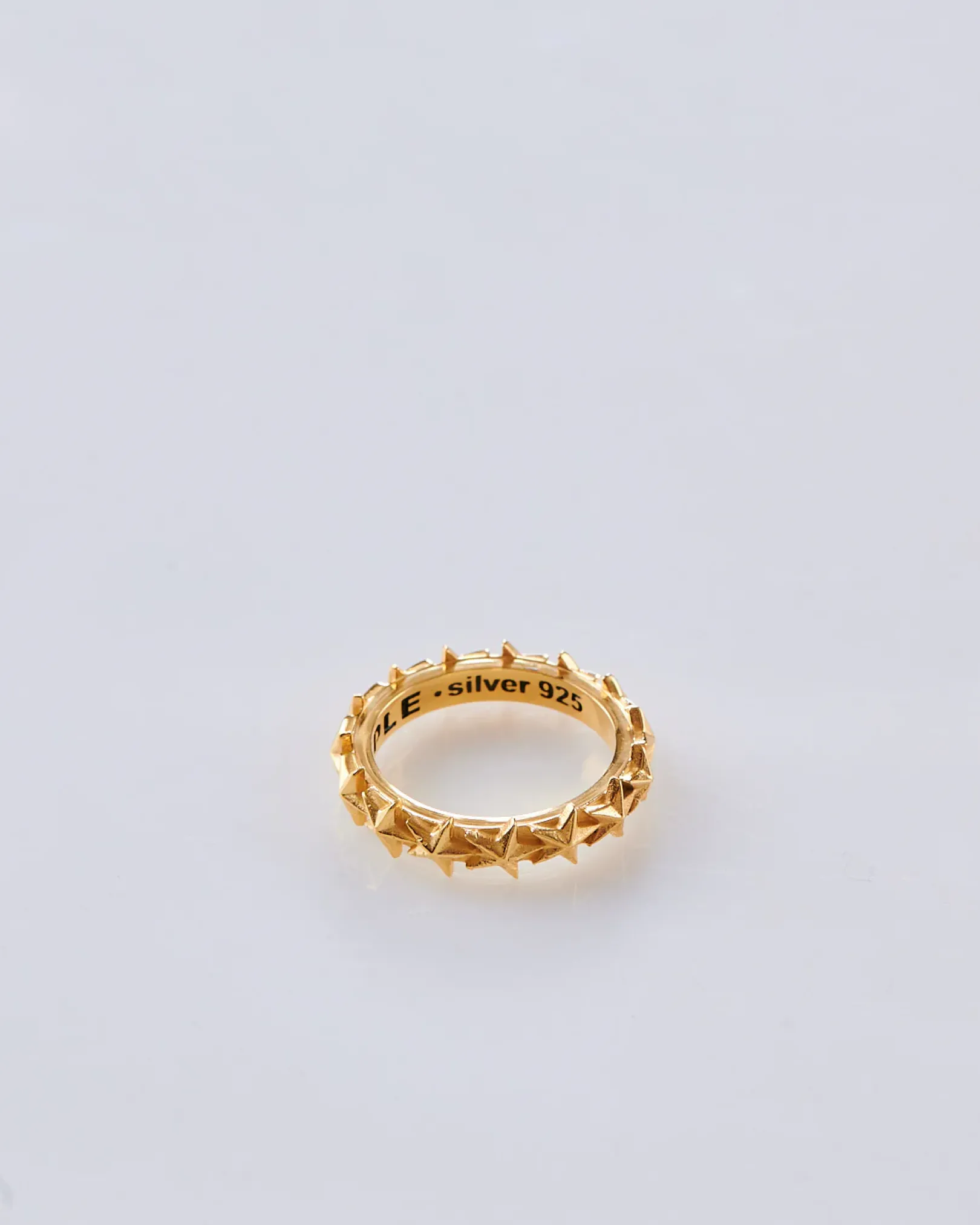 Silver 925 base with 14K gold dip finish. The Star Ring features a 3D star pattern band. Black tinting accents the polished silver to give the ring depth. Hallmarking and MAPLE logo inside.
