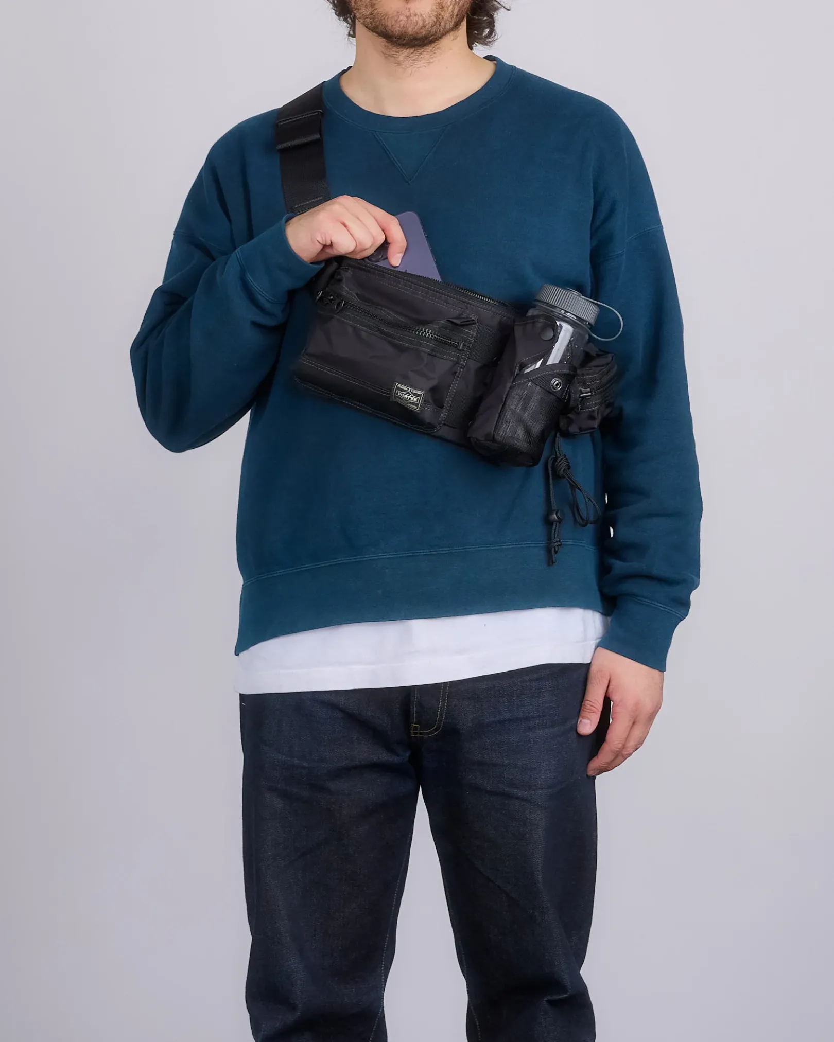 The PORTER ALL series brings customization to the forefront, allowing you to adapt your bag to different needs and occasions. The bag includes a detachable pouch ideal for small items like cards, wireless earphones, or bottles, and can be worn around the neck or shoulder. Made with ultra-dense PORTER 66 nylon fabric and a soft, bonded cotton ripstop lining, the bag molds comfortably to your form. The waist bag features a streamlined design, front zipper pocket, and interior compartments, perfect for essentials in a stylish, versatile setup.