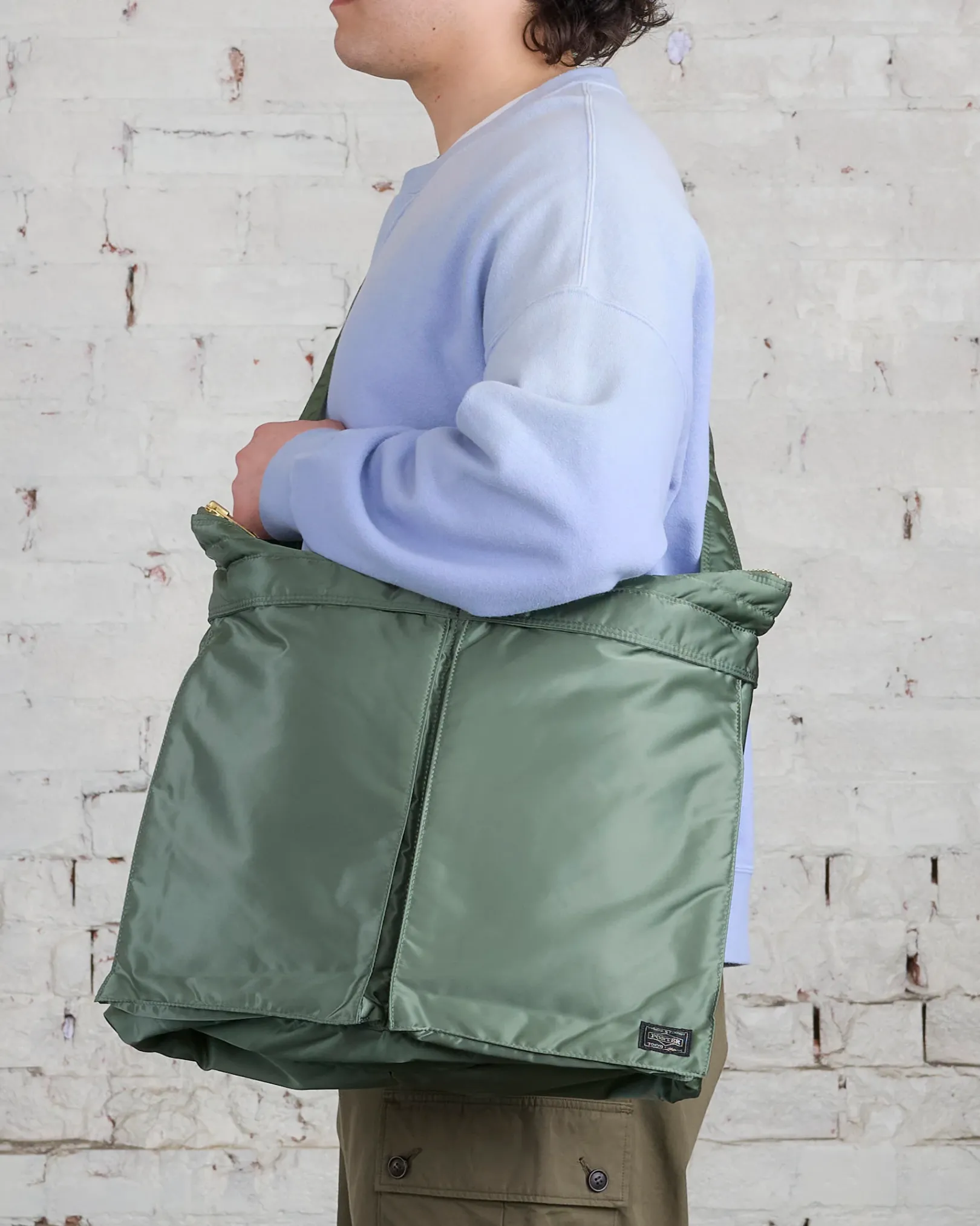 The Porter Tanker 2-Way Helmet Bag Sage Green is a versatile and functional accessory for your daily commute. With two large front pockets, it offers ample storage space for your belongings. The main compartment can hold a 14-inch PC, while the expandable gusset allows for even more storage capacity. Its removable shoulder strap allows for easy conversion from a hand bag to a shoulder bag. Made in Japan with a simple yet durable design.