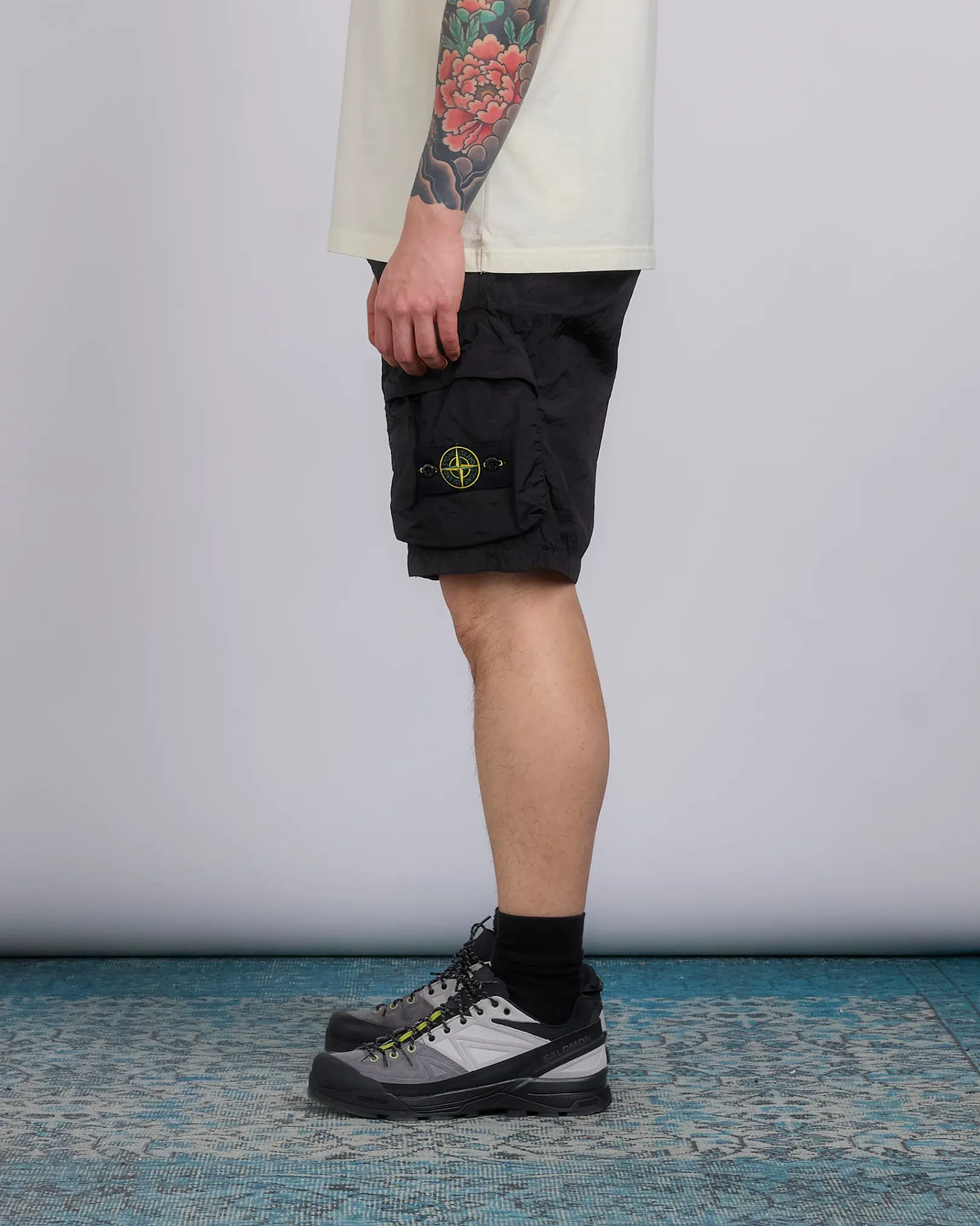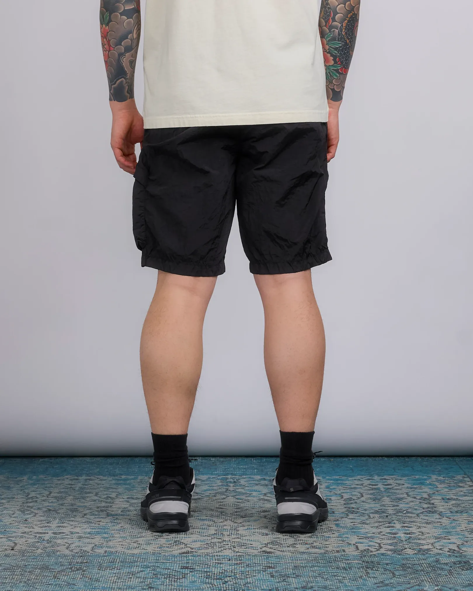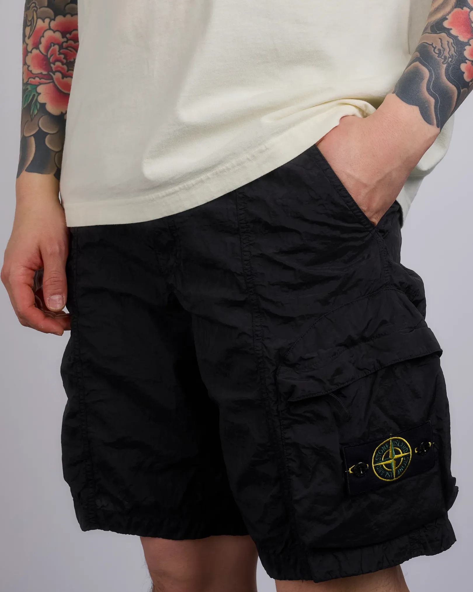 Cargo Bermuda shorts made in a new responsible Stone Island iridescent Nylon Metal fabric. The evolution of this iconic fabric sees the use of ECONYL® regenerated yarns: the life-ended nylon, pre- and post-consumer, is recycled with a complex depolymerization process to create this fiber that features the same intrinsic characteristics of nylon from fossil raw material.