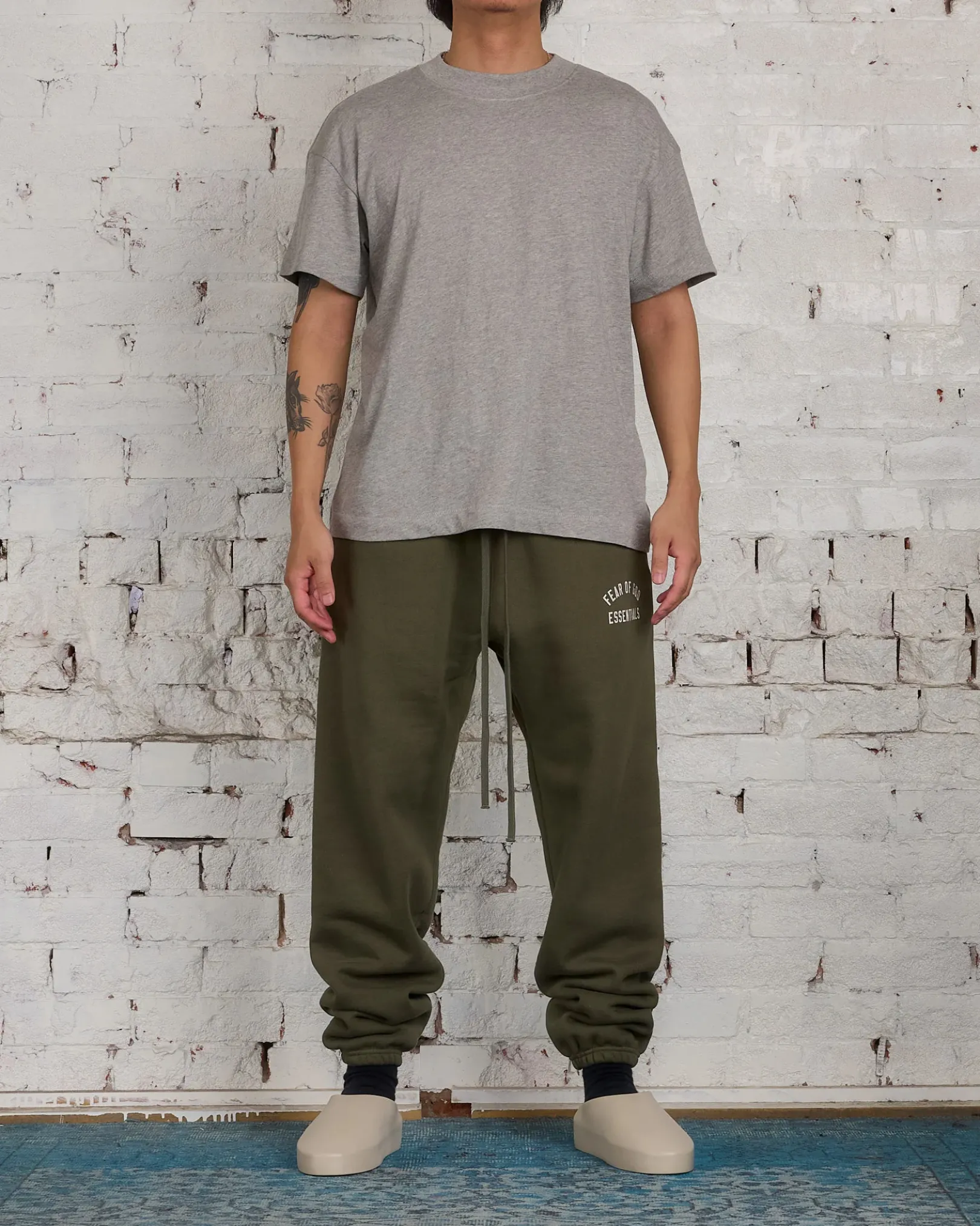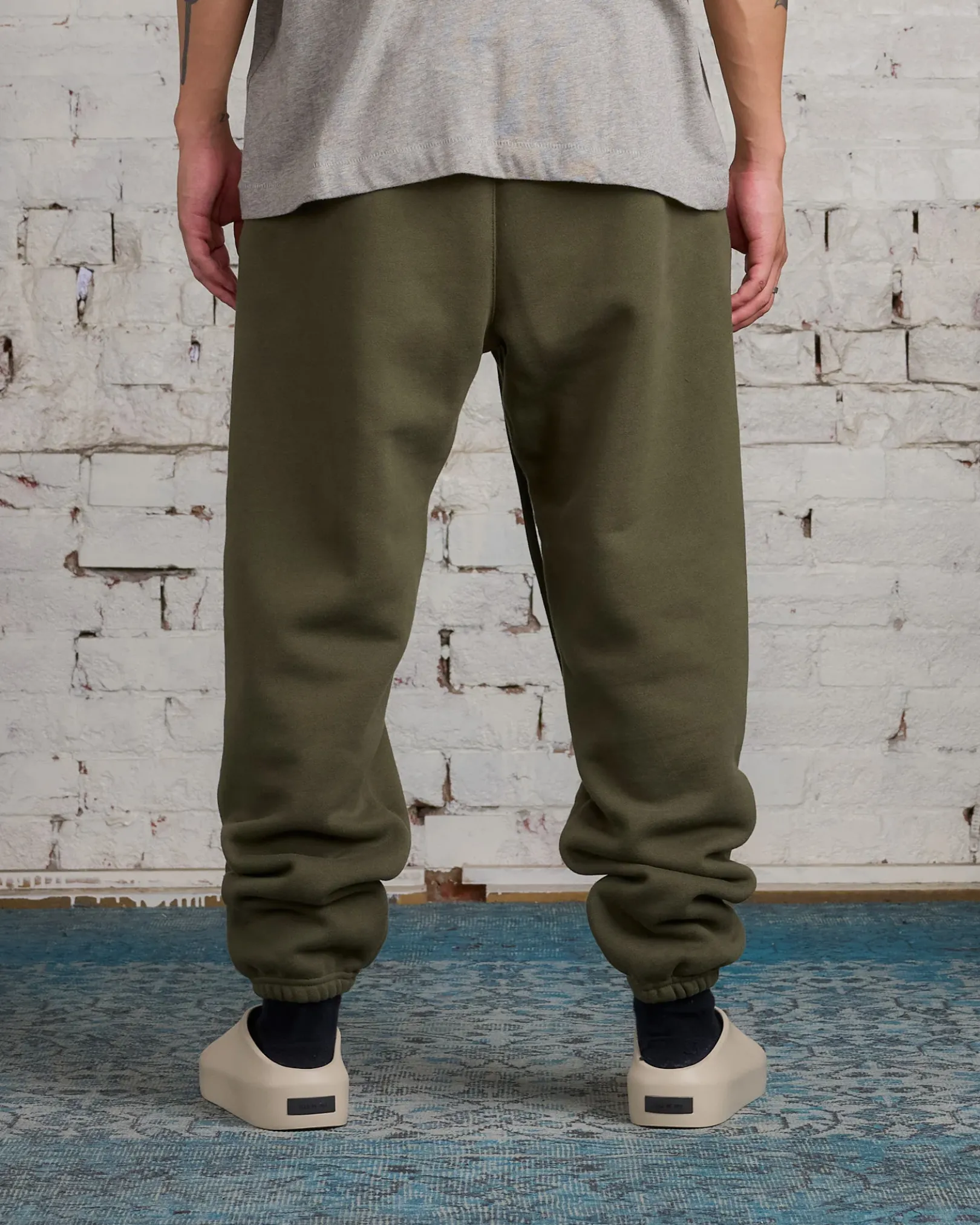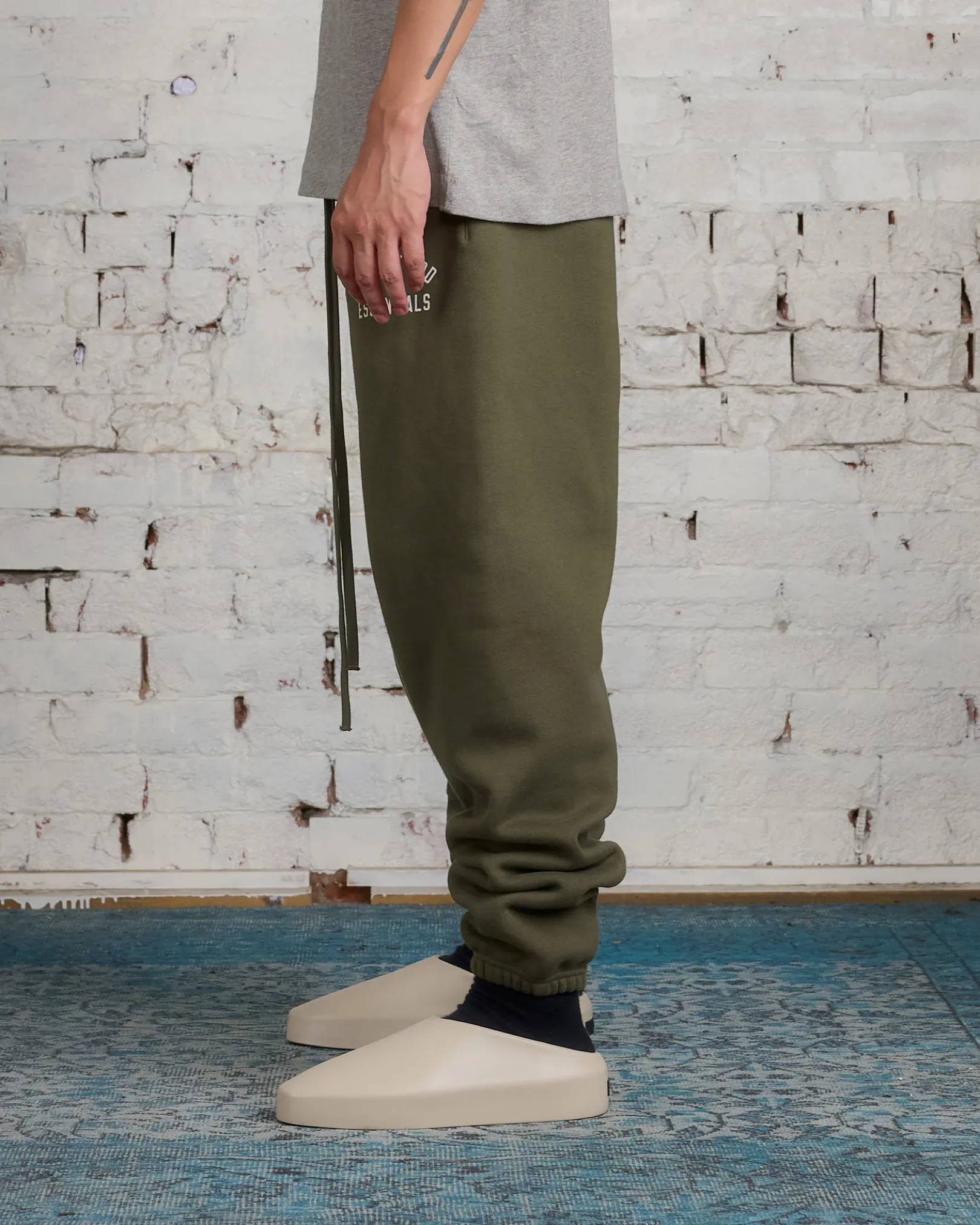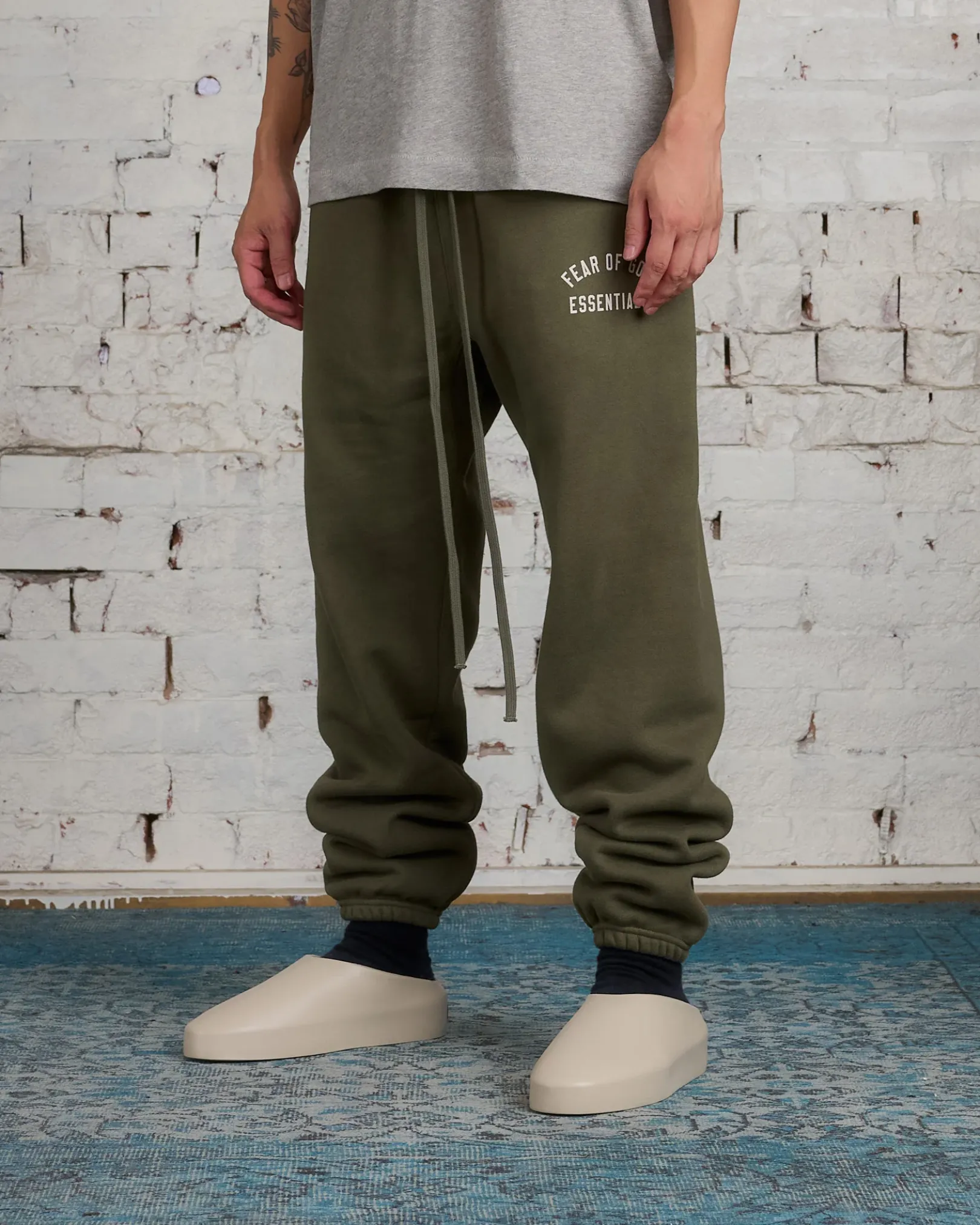 The Essentials Sweatpant has been upgraded in a heavier 480gsm core fleece to provide additional body and structure. A “Fear of God State” collegiate graphics screen-printed on the leg. Additional details include an encased elastic waistband with elongated drawstrings, and side seam pockets. The Essentials Fear of God rubberized label is at the center front.