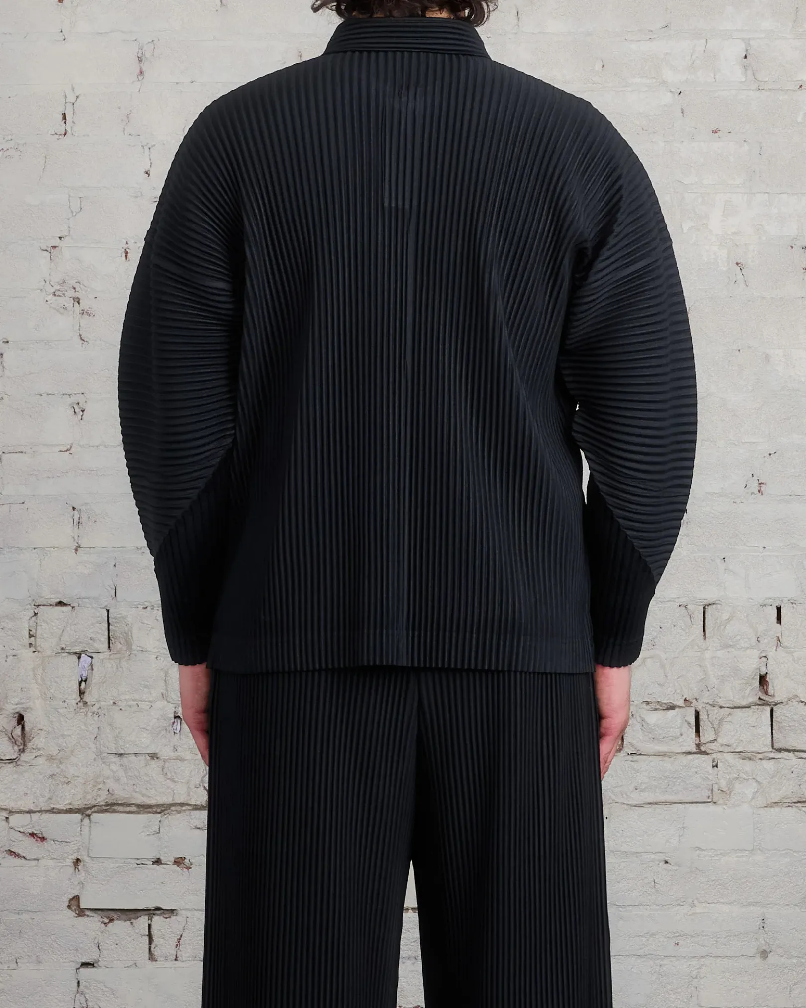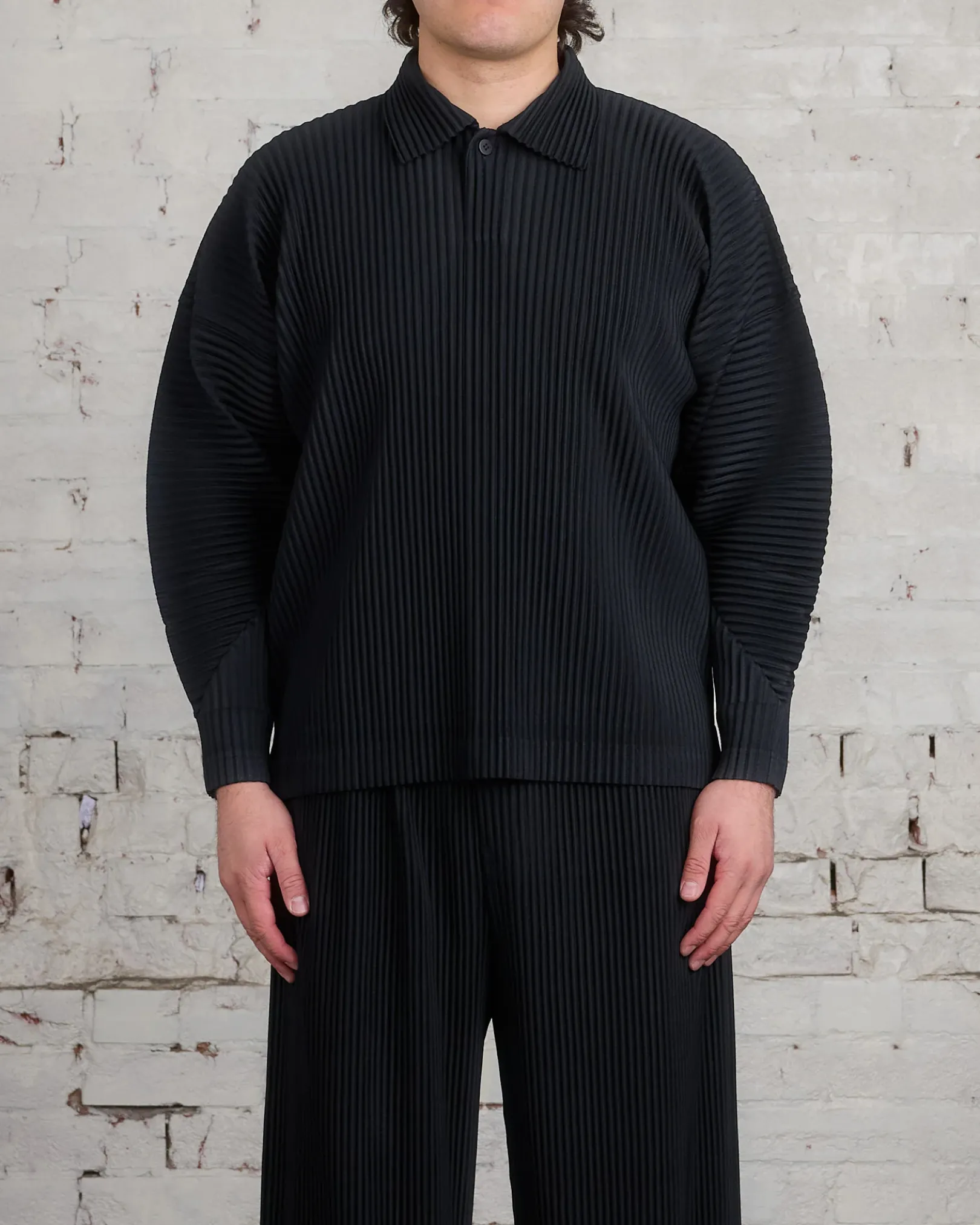This pleated polo shirt has a straight fit and long curved sleeves.