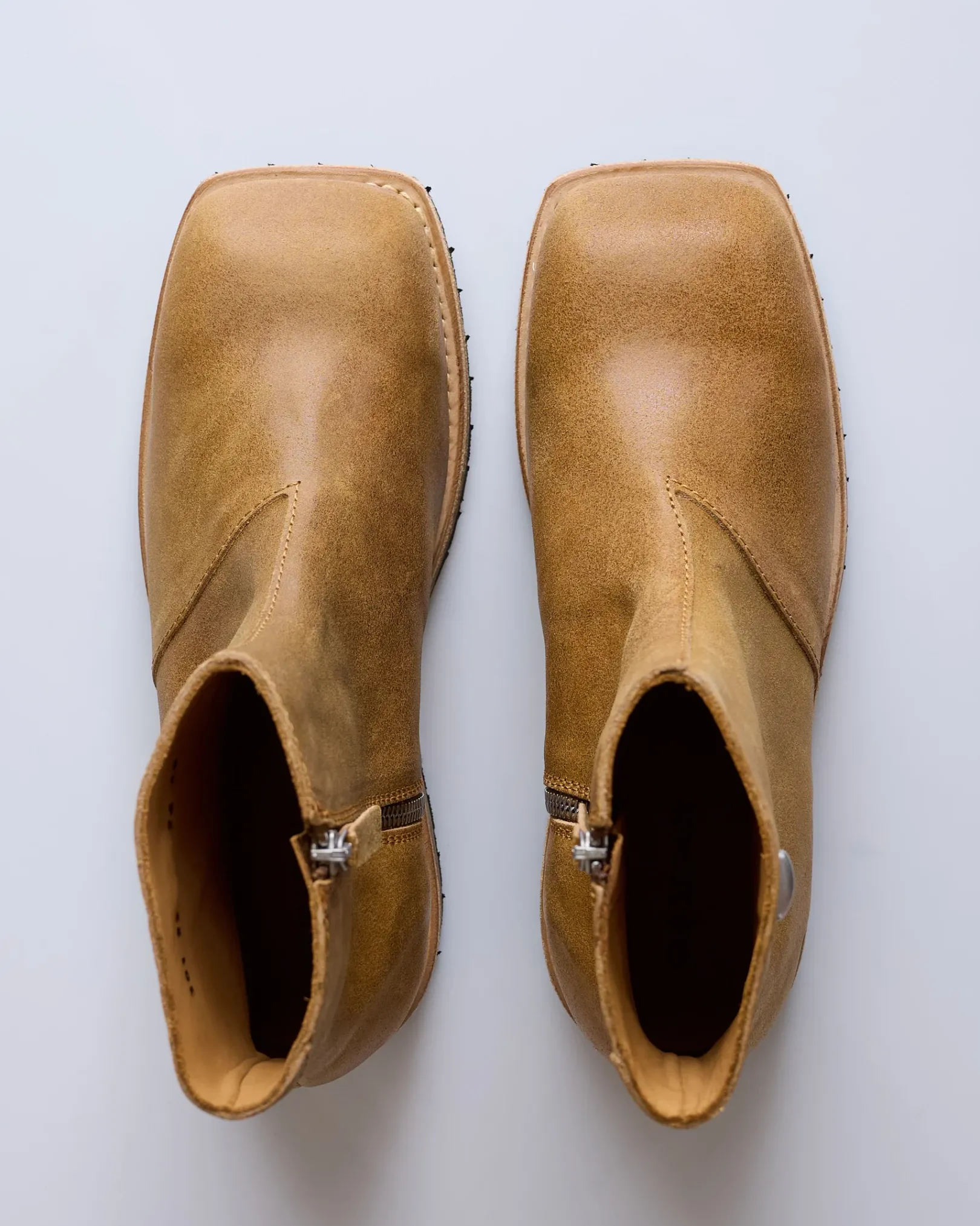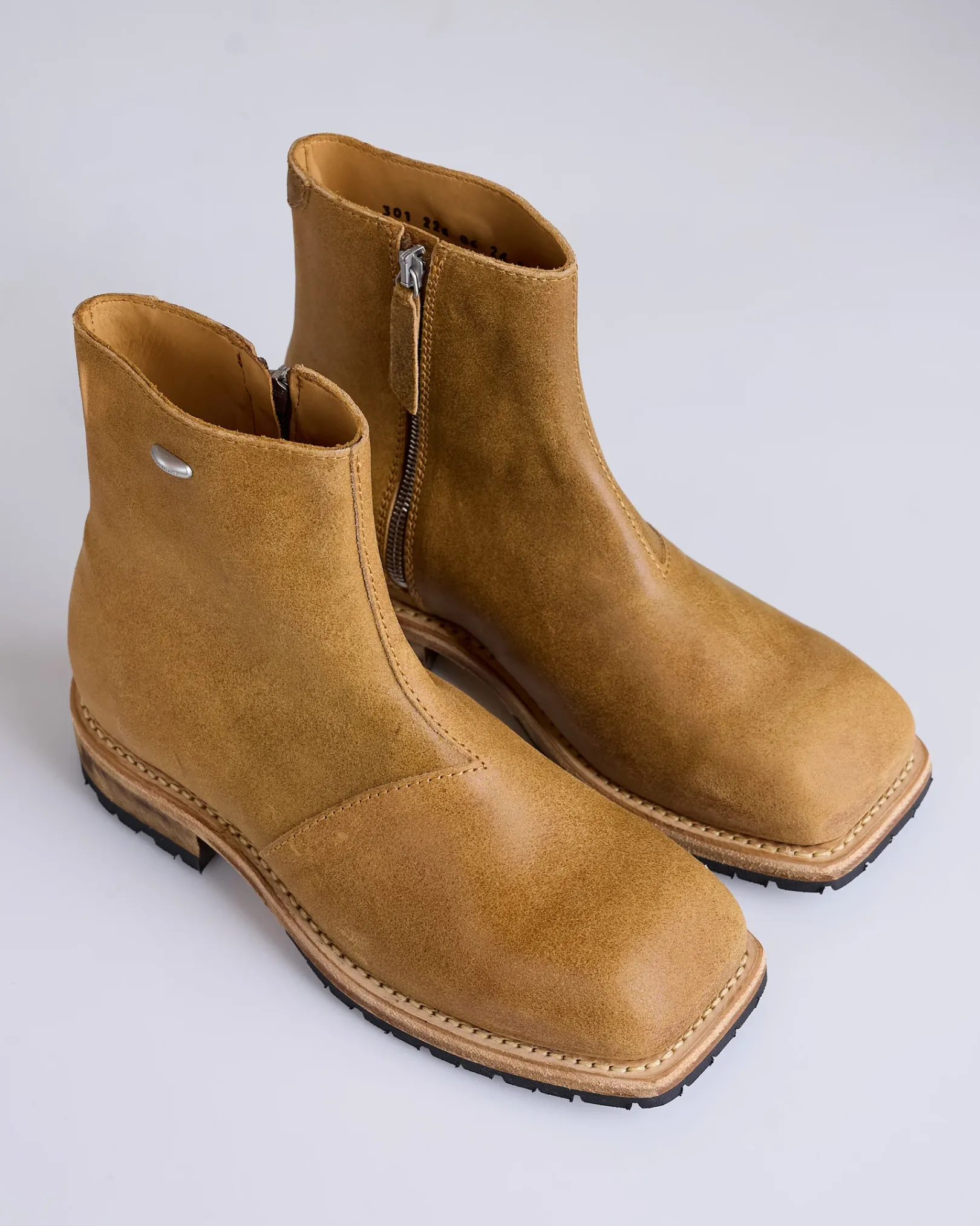 Engine Boot in Sunset Sand Primal Suede. Produced in a Spanish calf leather, the mid cut Engine Boot features a lugged Vibram sole, a Lampo side zip and a metal Our Legacy rivet.
