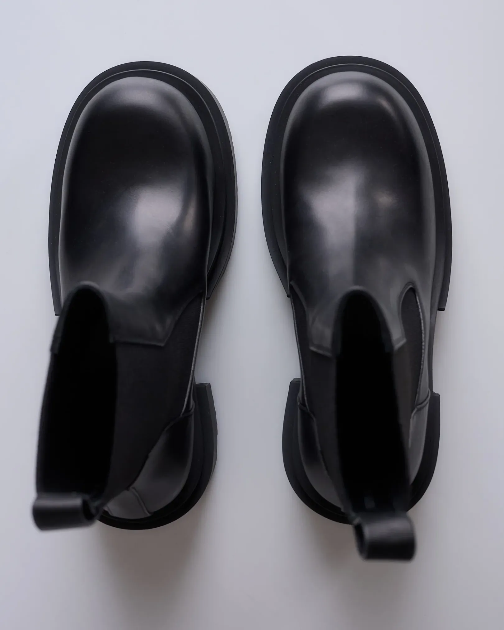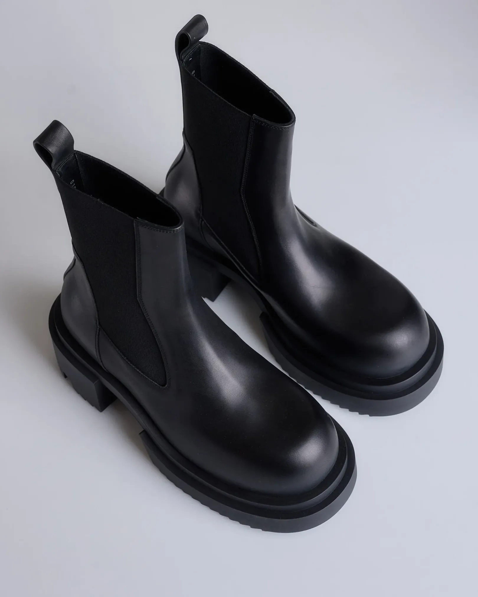These beatle bogun boots are above-ankle height. they have geometric side panels in stretch elastic, an angular heel counter with top stitching, and a back loop pull tab. They have a rounded toe and feature a bogun rubber mega creeper sole with a toothed square heel.