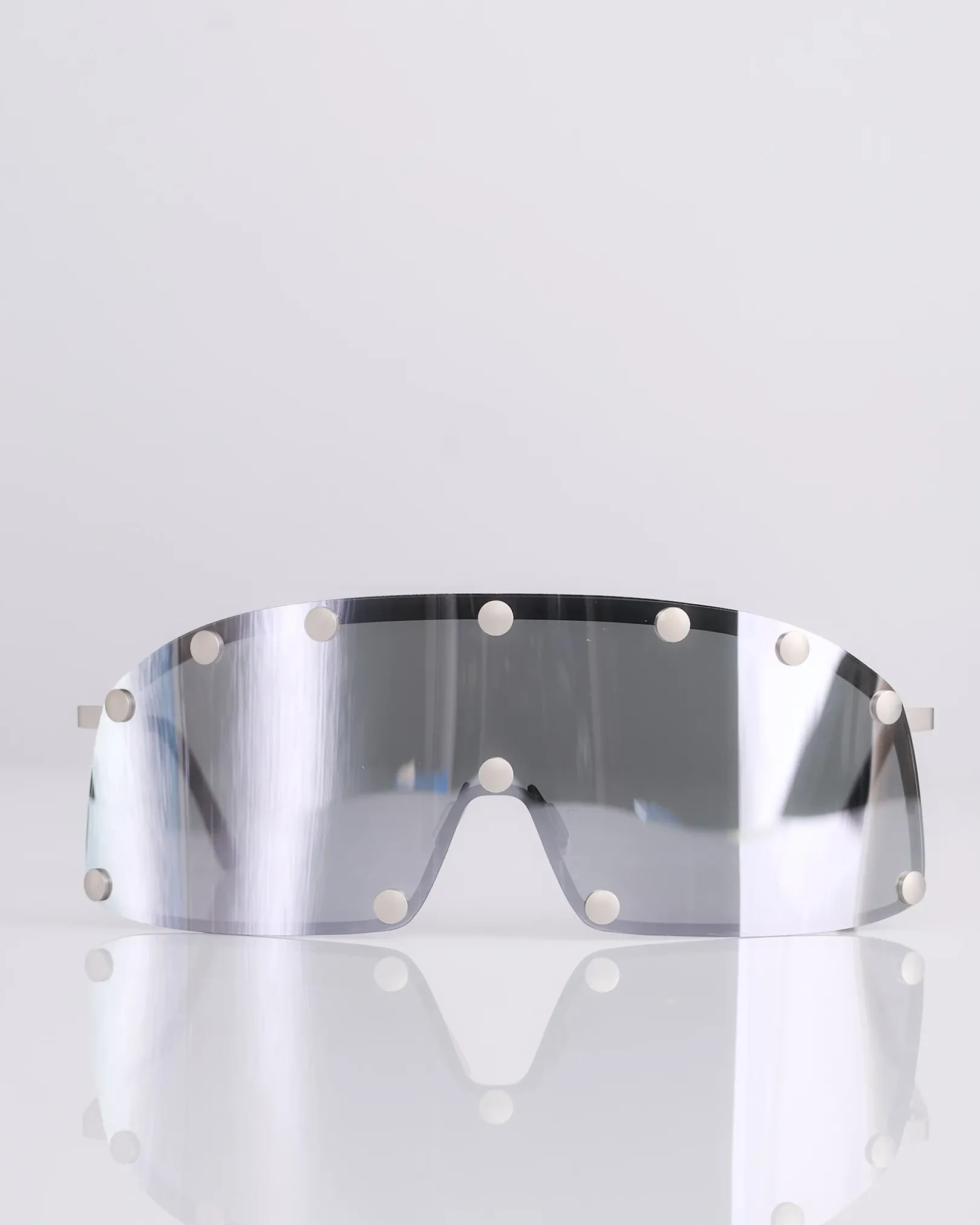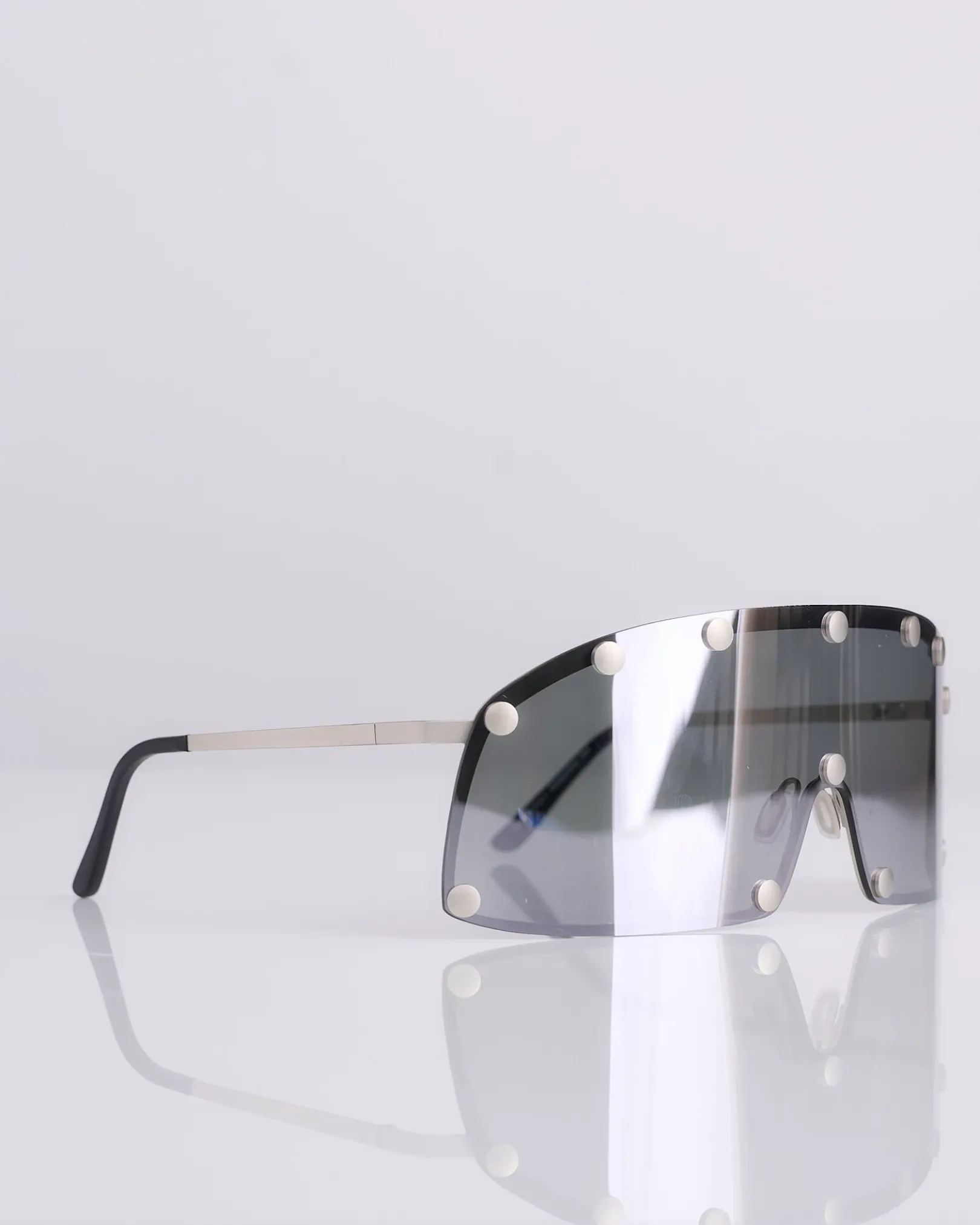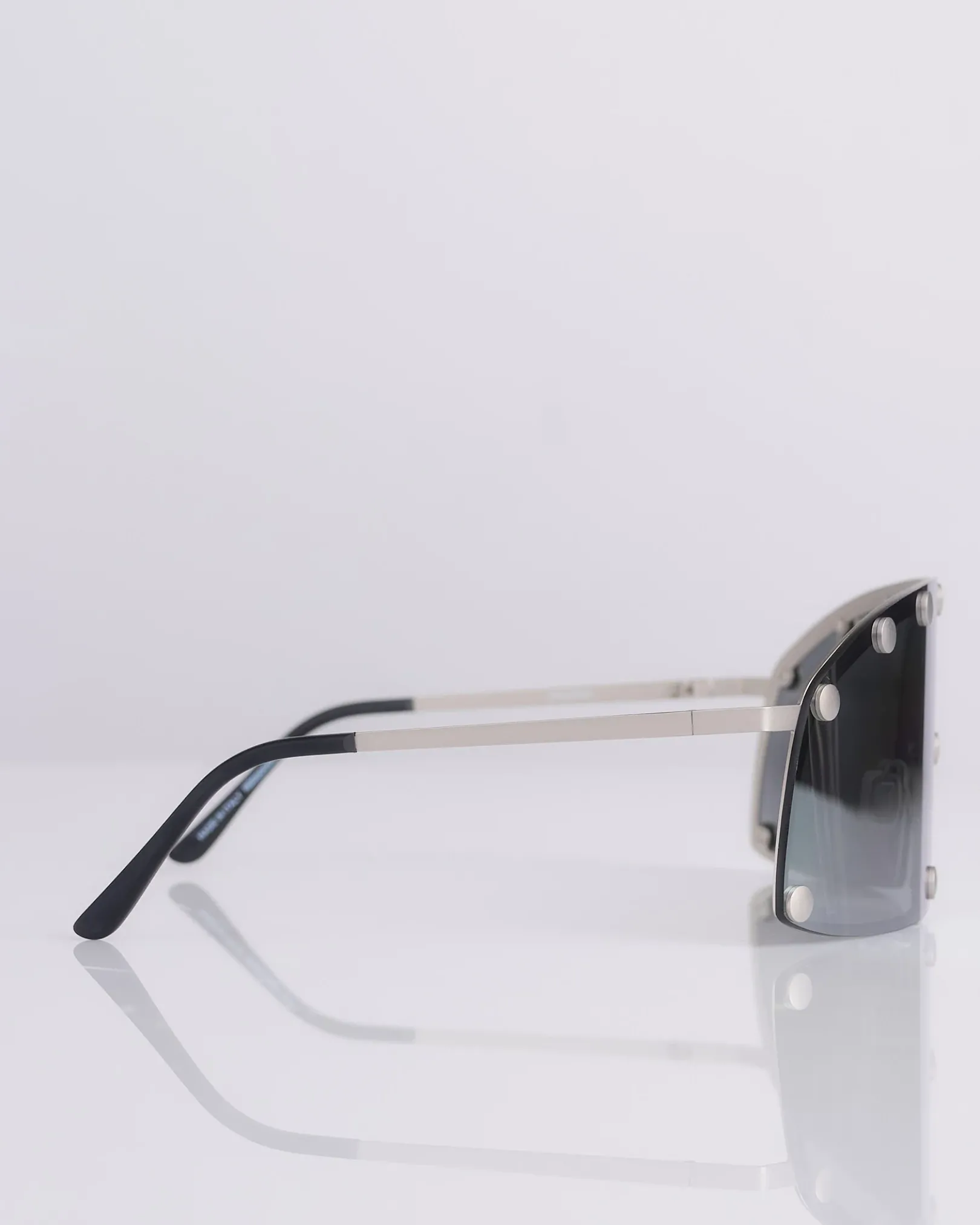 These sunglasses feature a silver surgical stainless steel frame, a straight-bottomed black lense and a rubber nose pad.