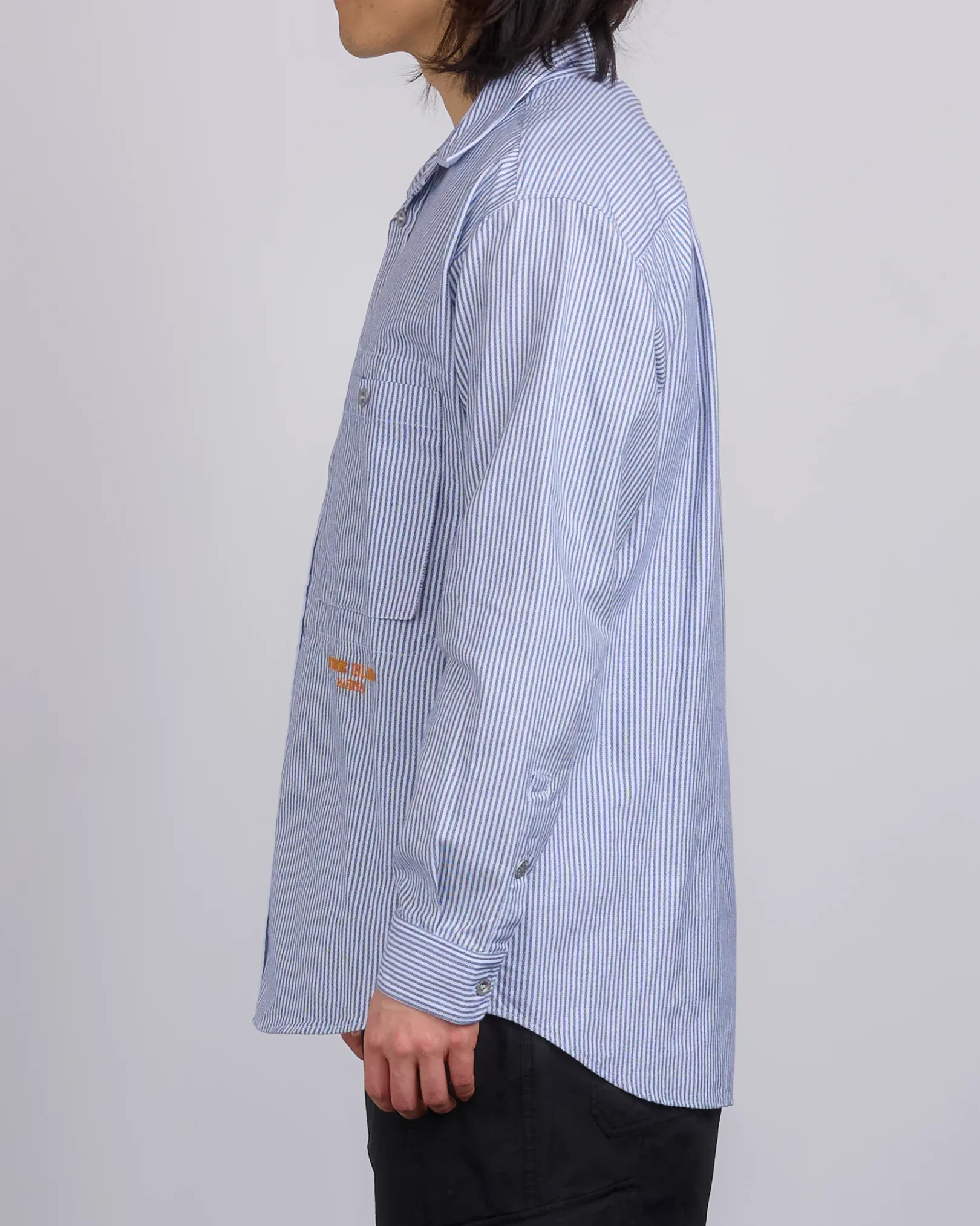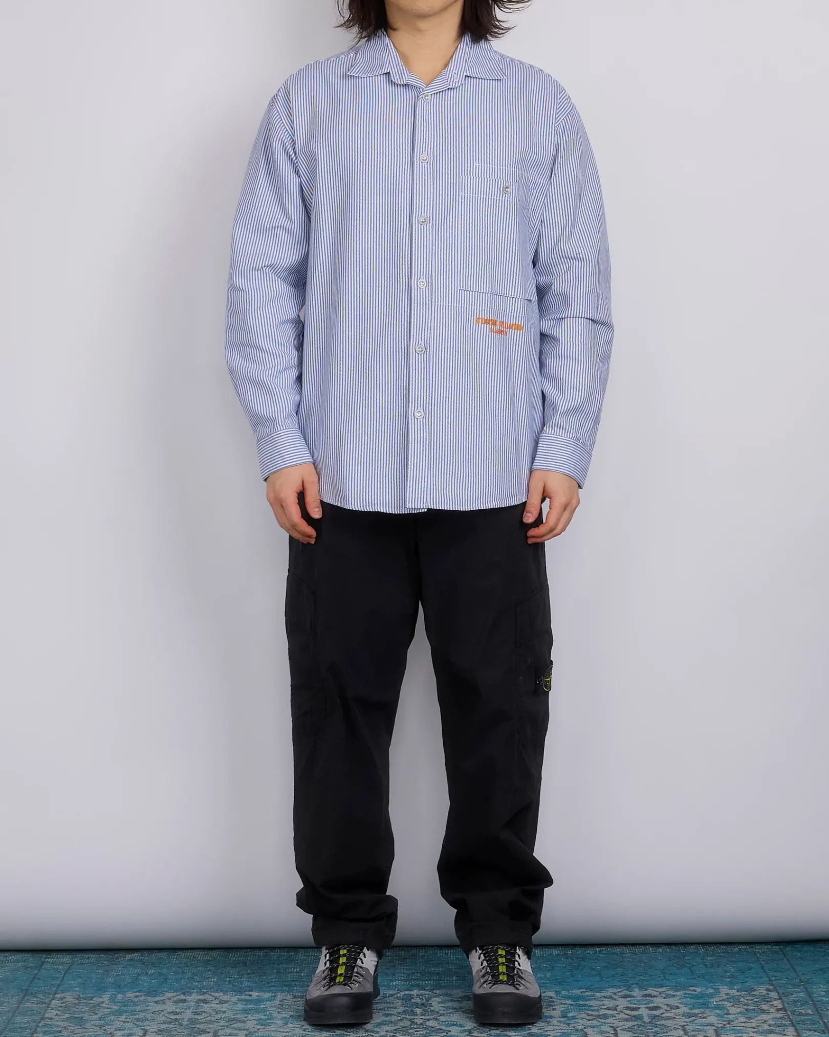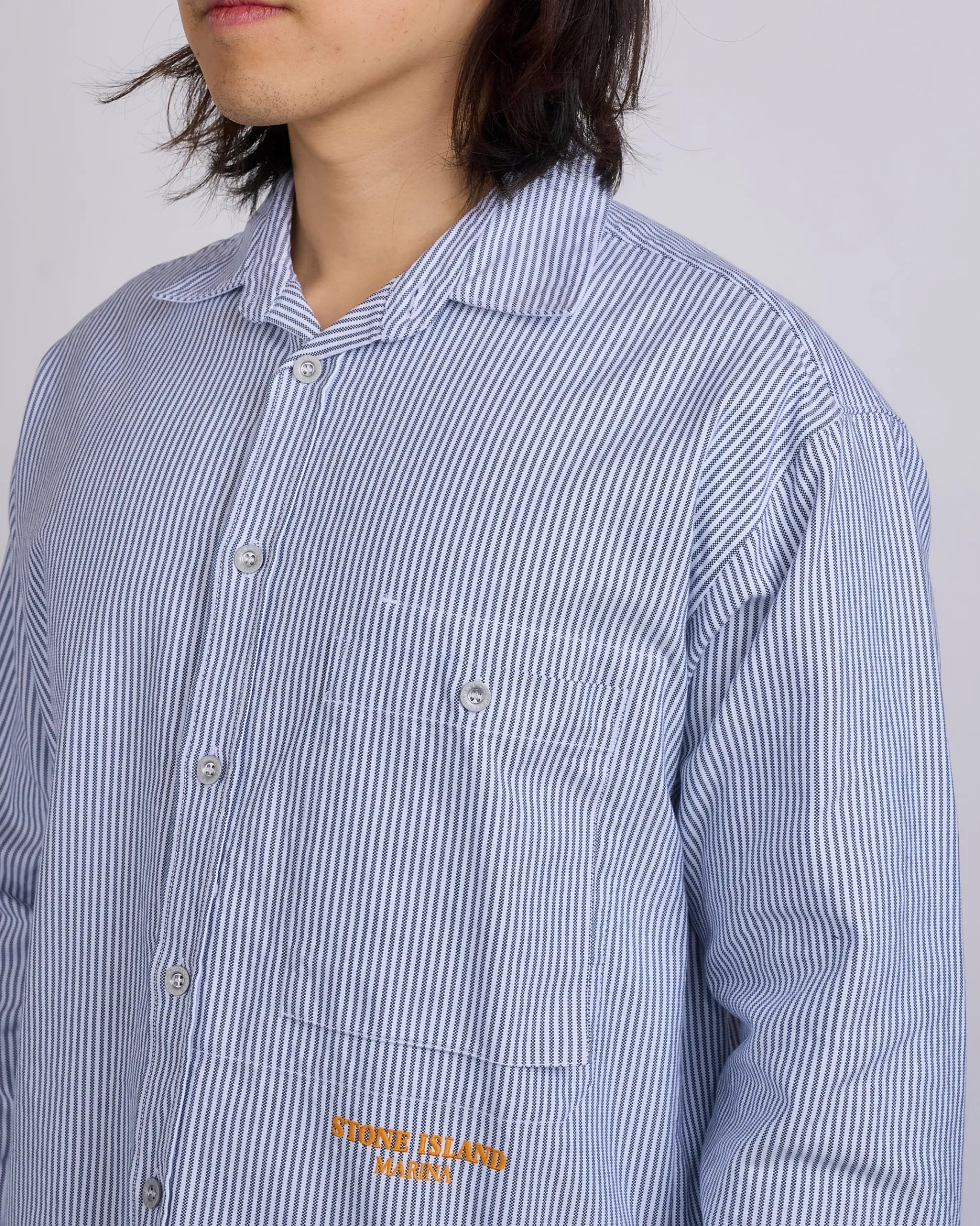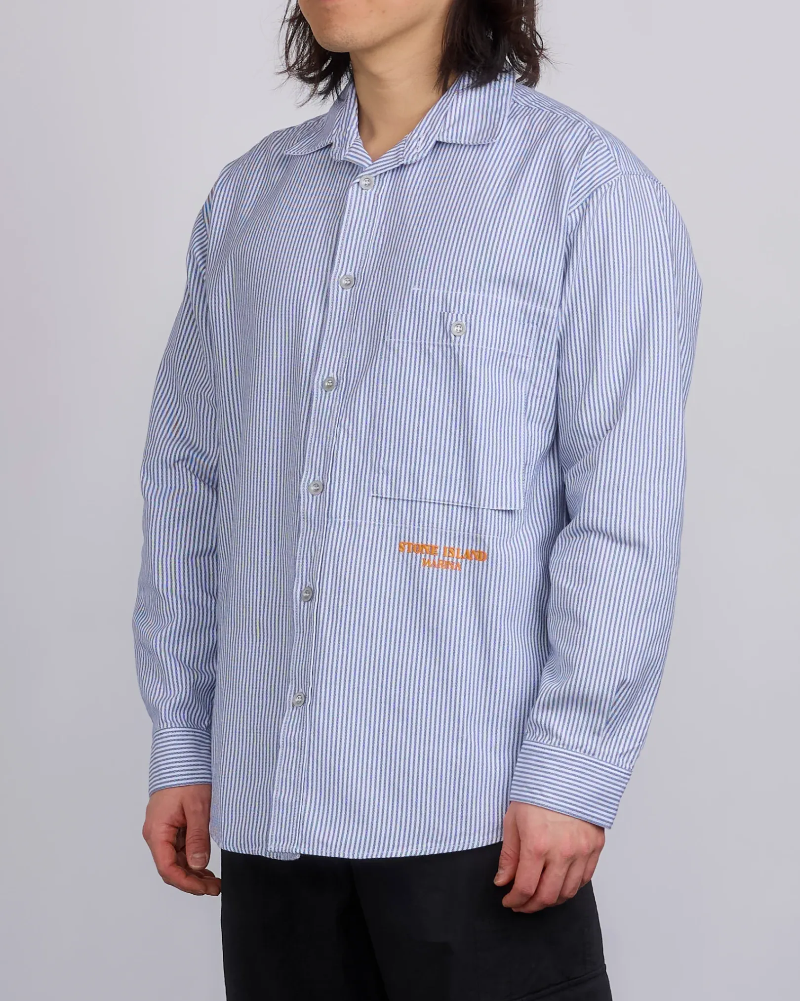 One bellows chest pocket with button fastening. Underneath, embroidery of the Stone Island Marina lettering. Inner slanted chest patch pocket. Yoke on back. Rounded back hemline. Buttoned cuffs. Button fastening. Regular fit.