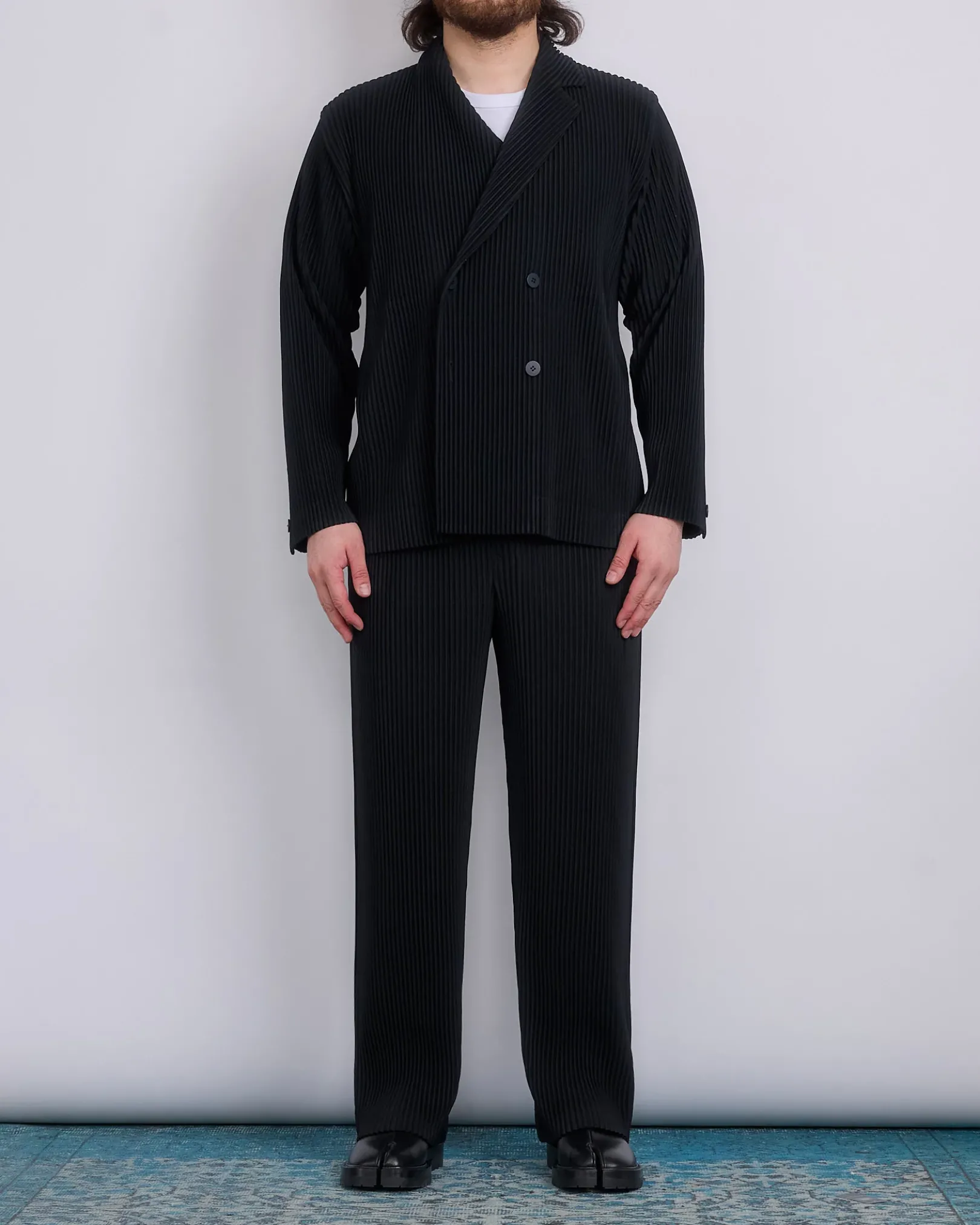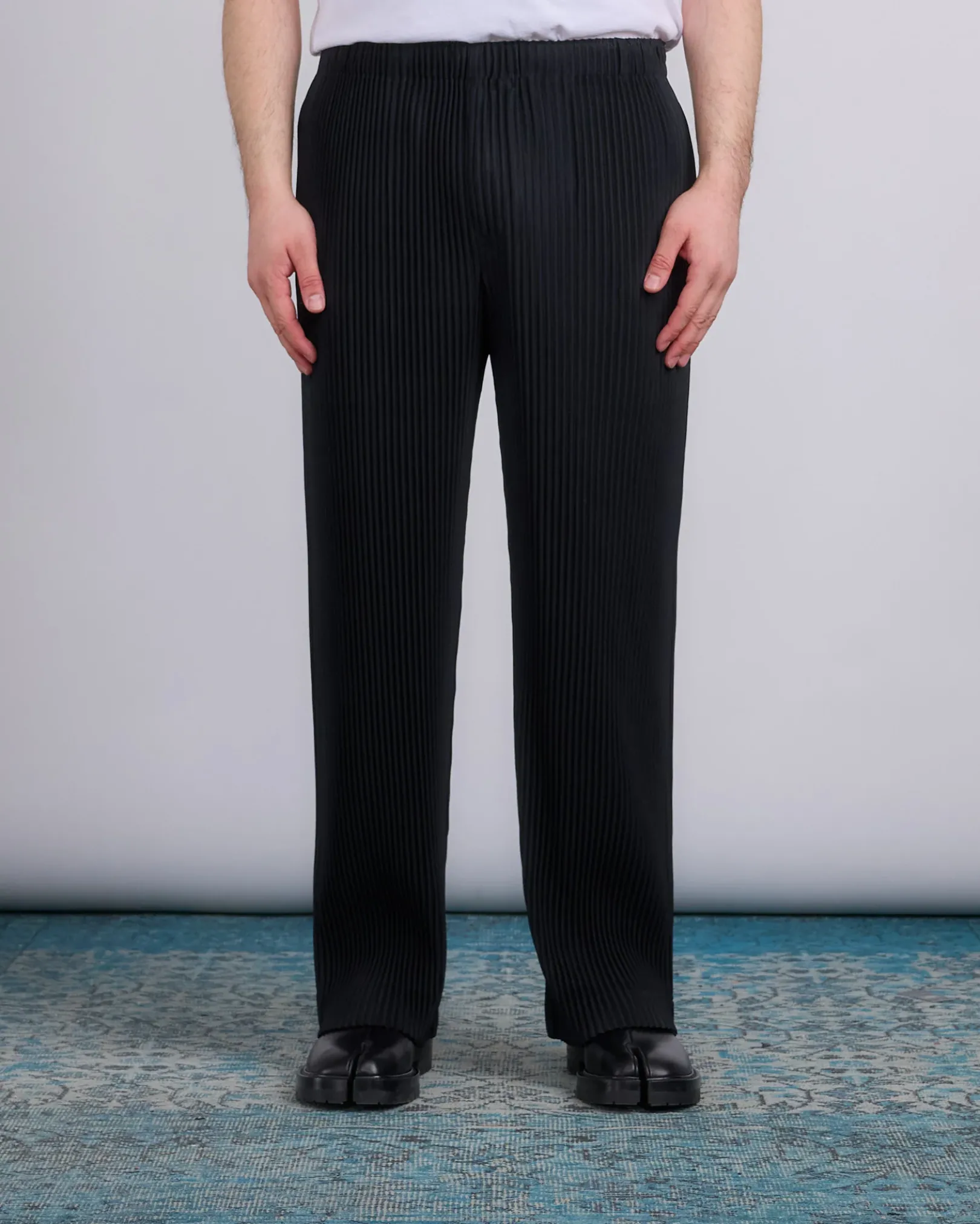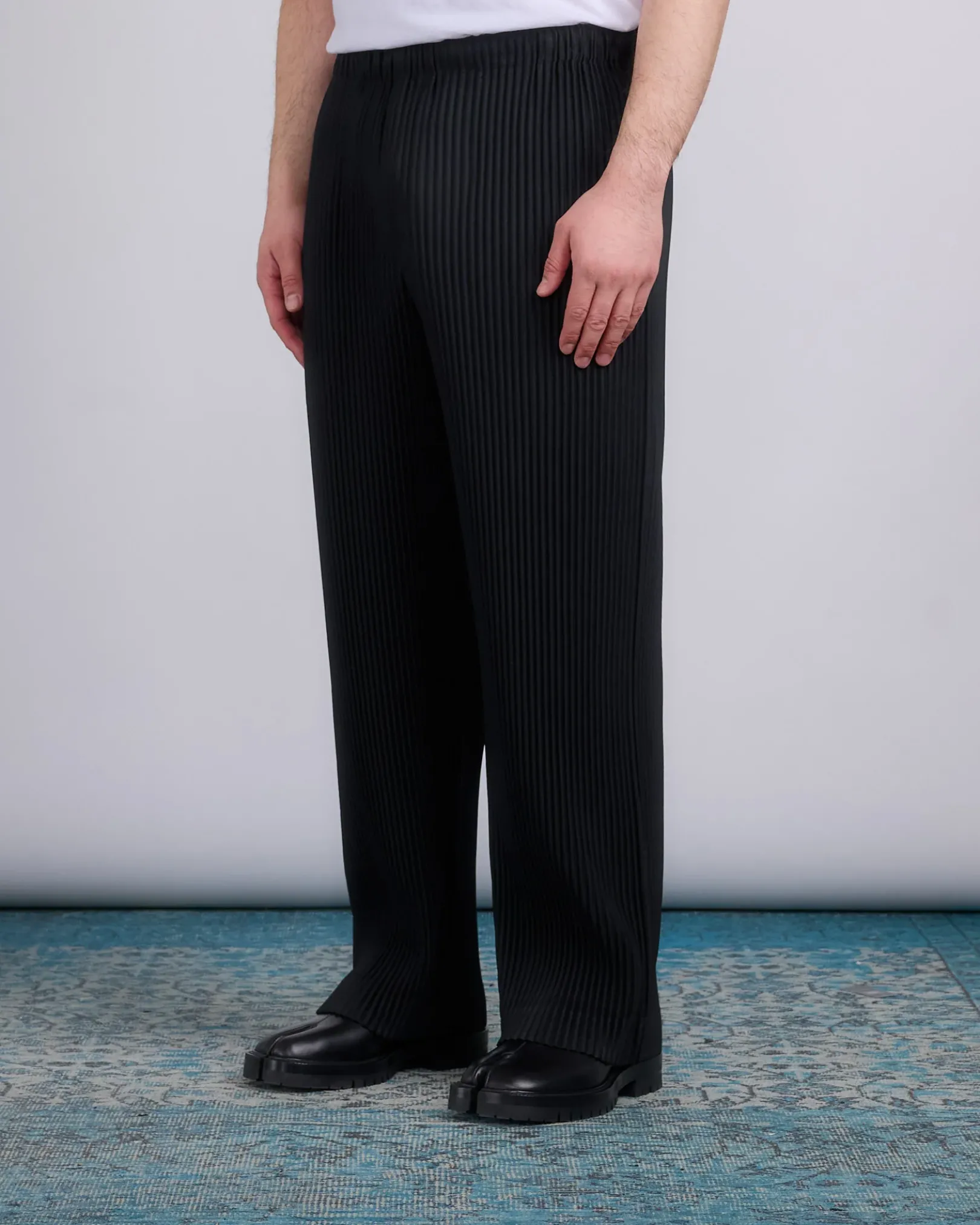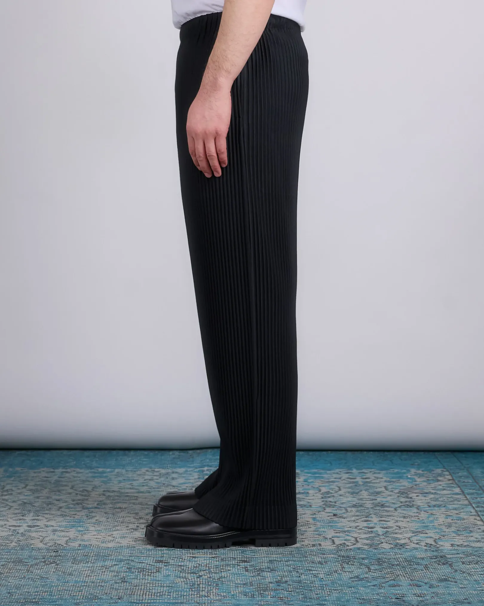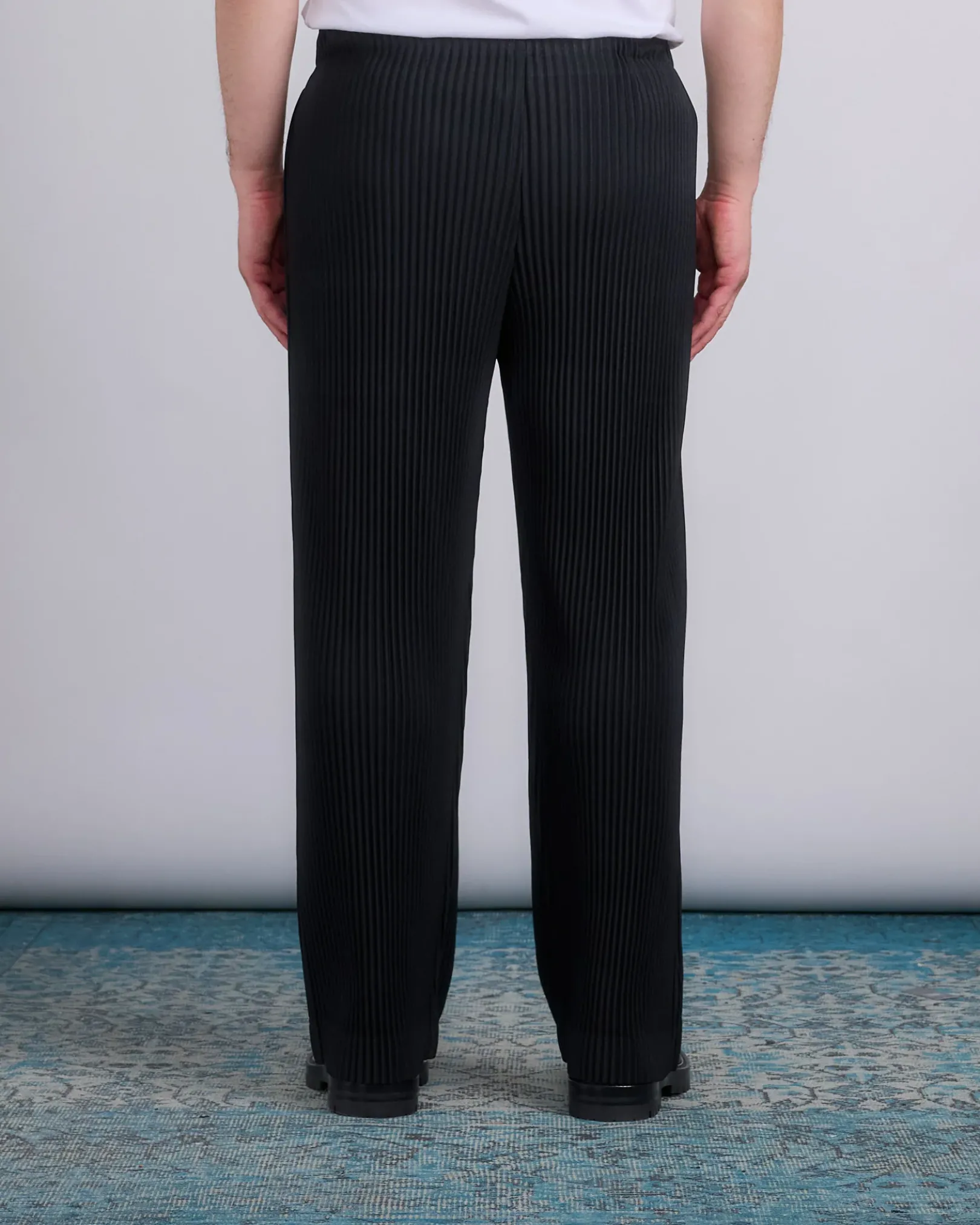 These straight Black pleated trousers have side pockets and a fully elasticated waistband with a button fly and inner drawcord.
