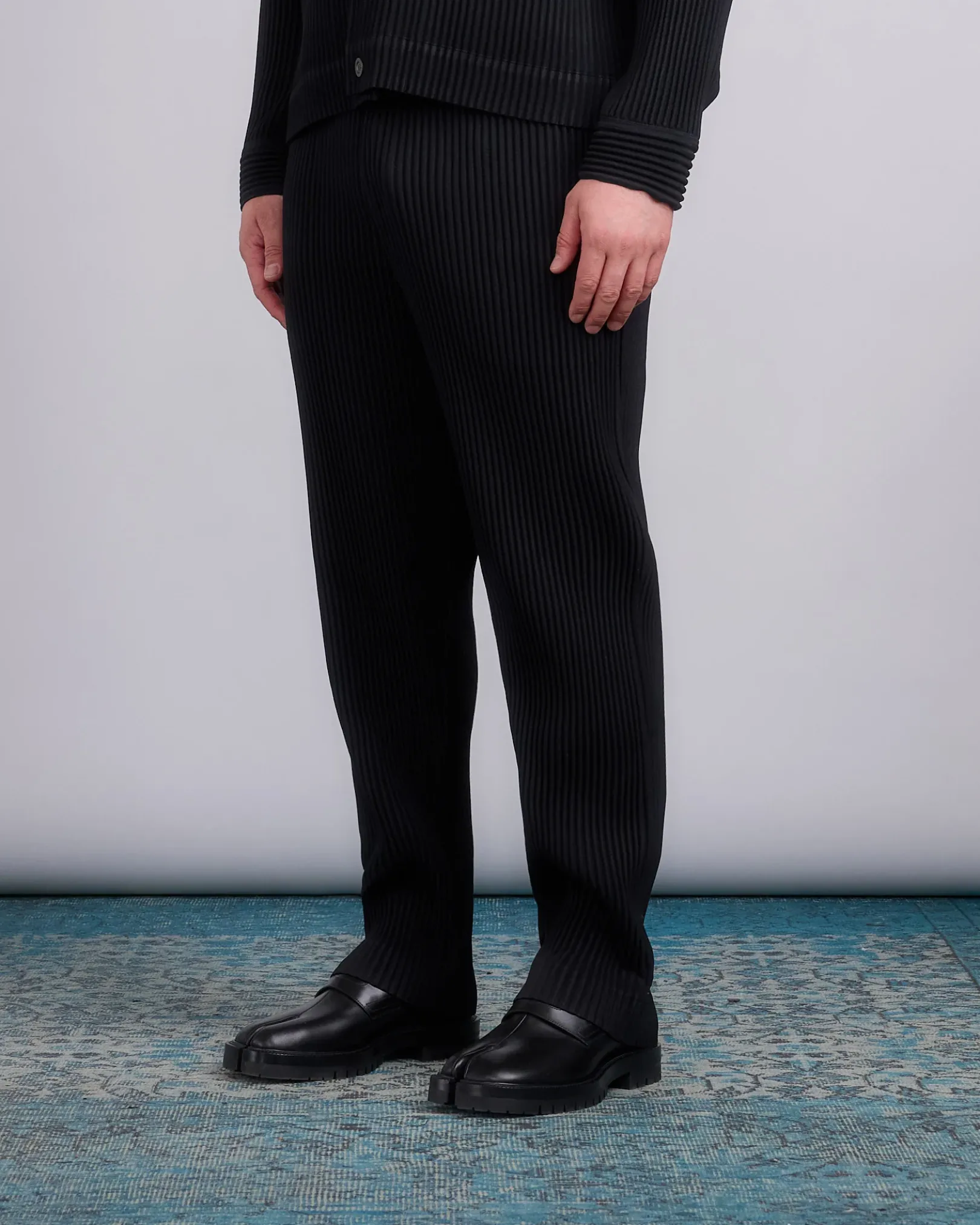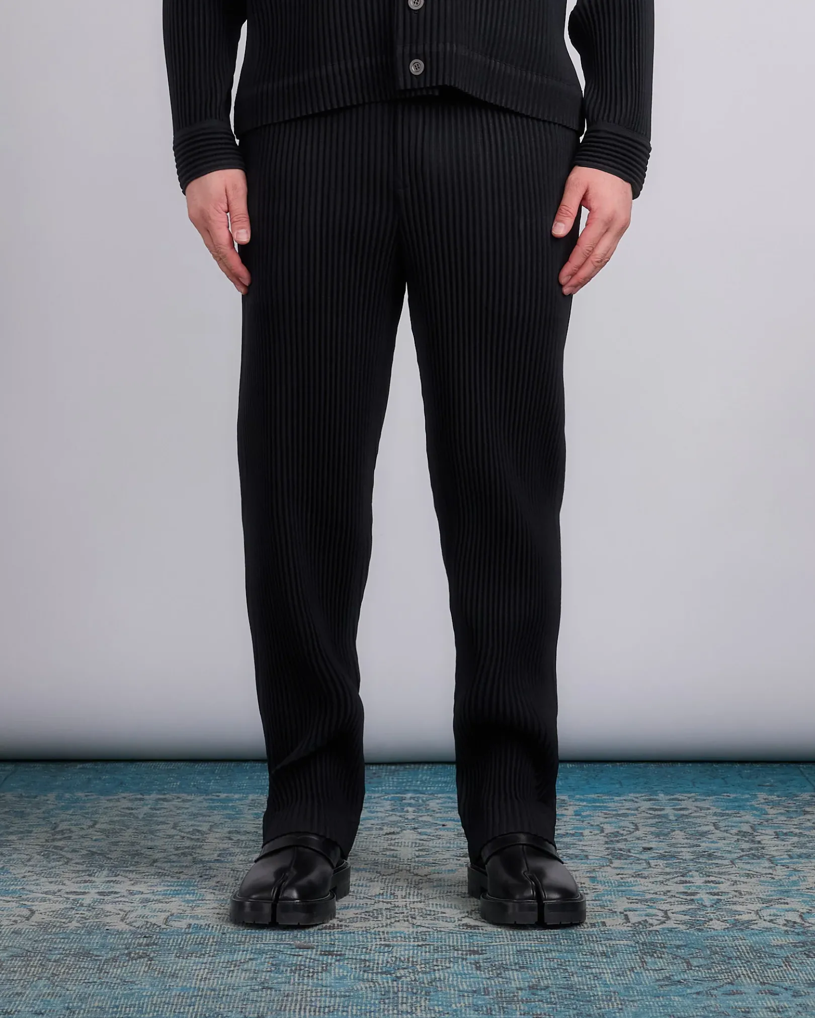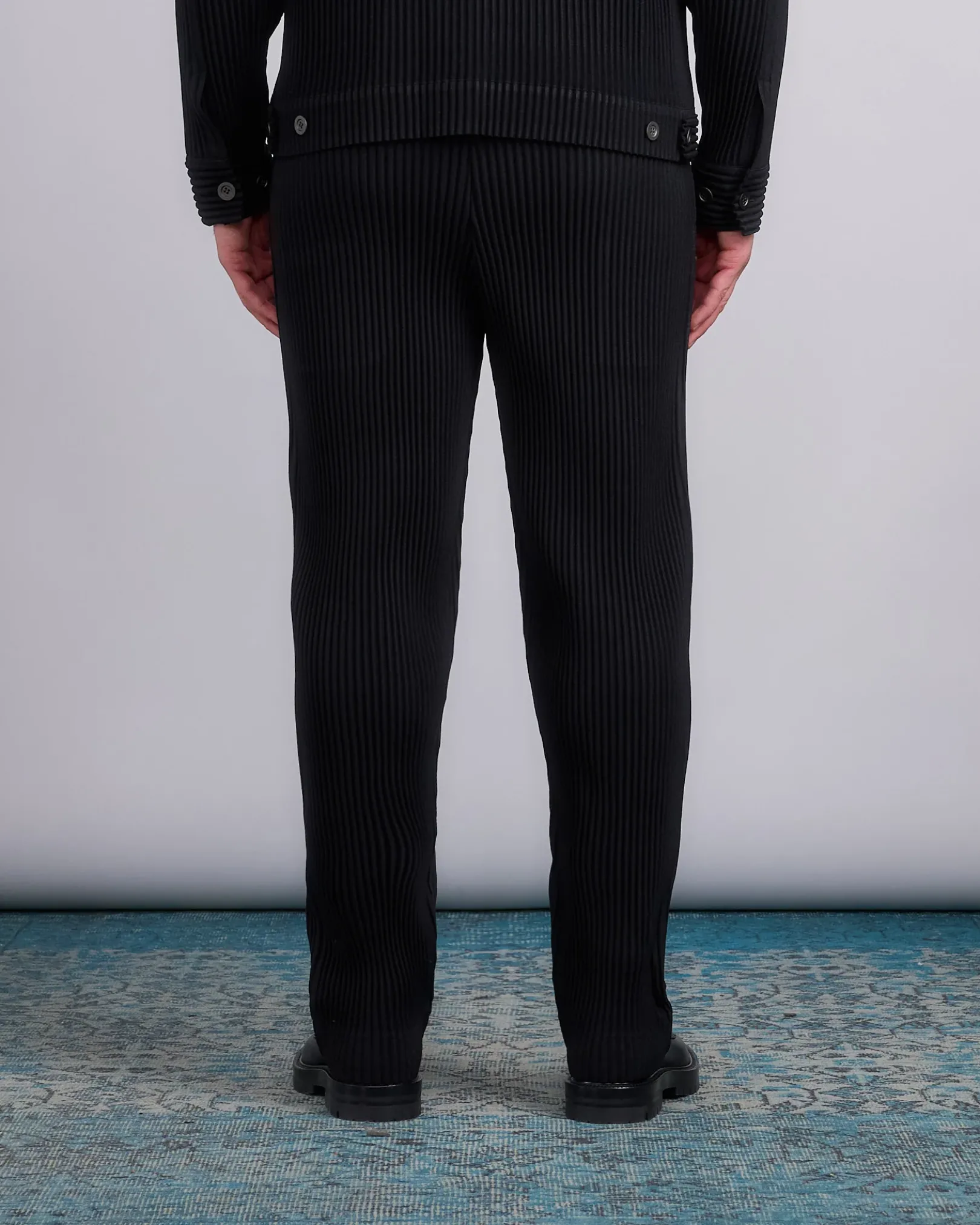 These straight black pleated trousers have side pockets and a fully elasticated waistband with a button fly and belt loops.