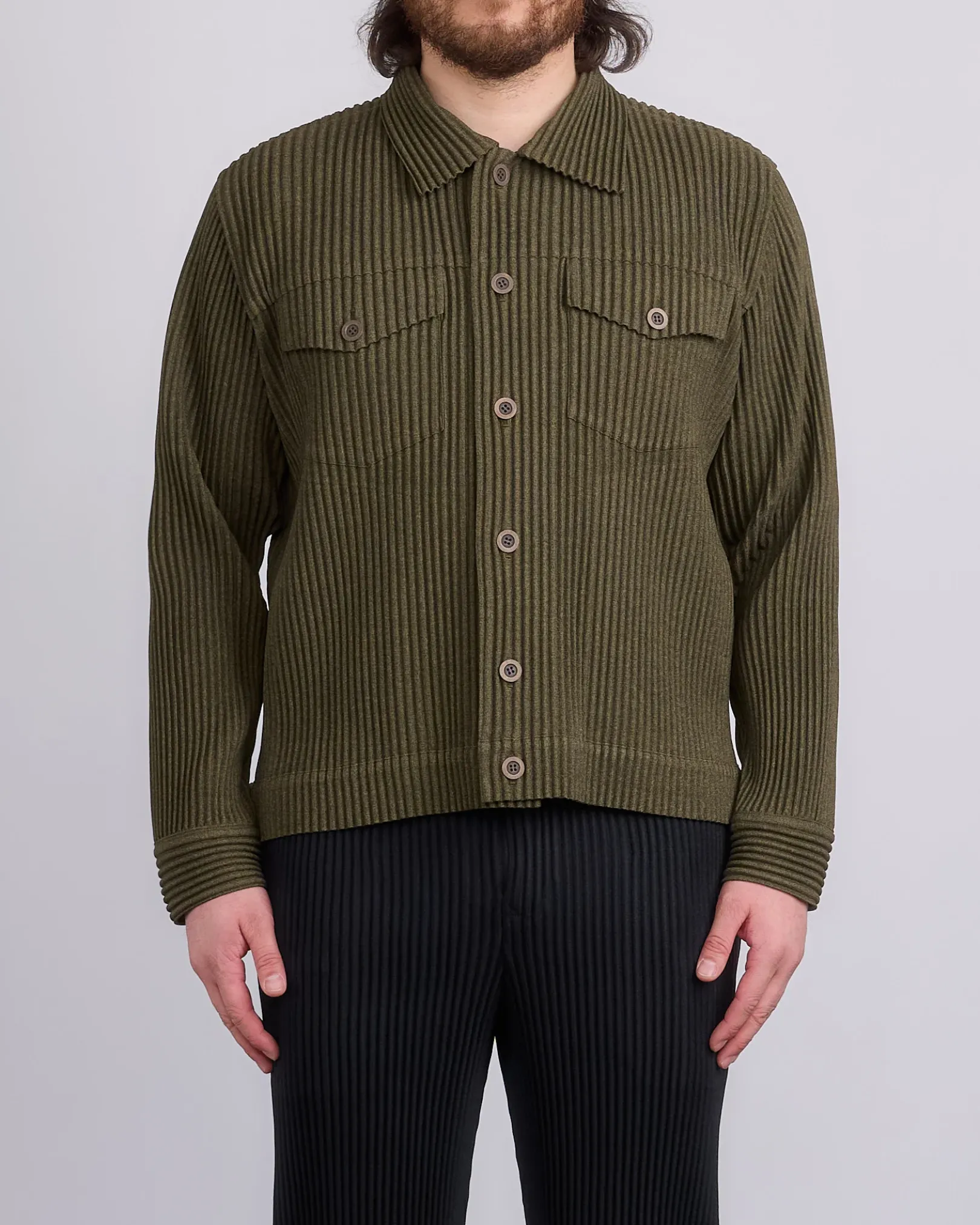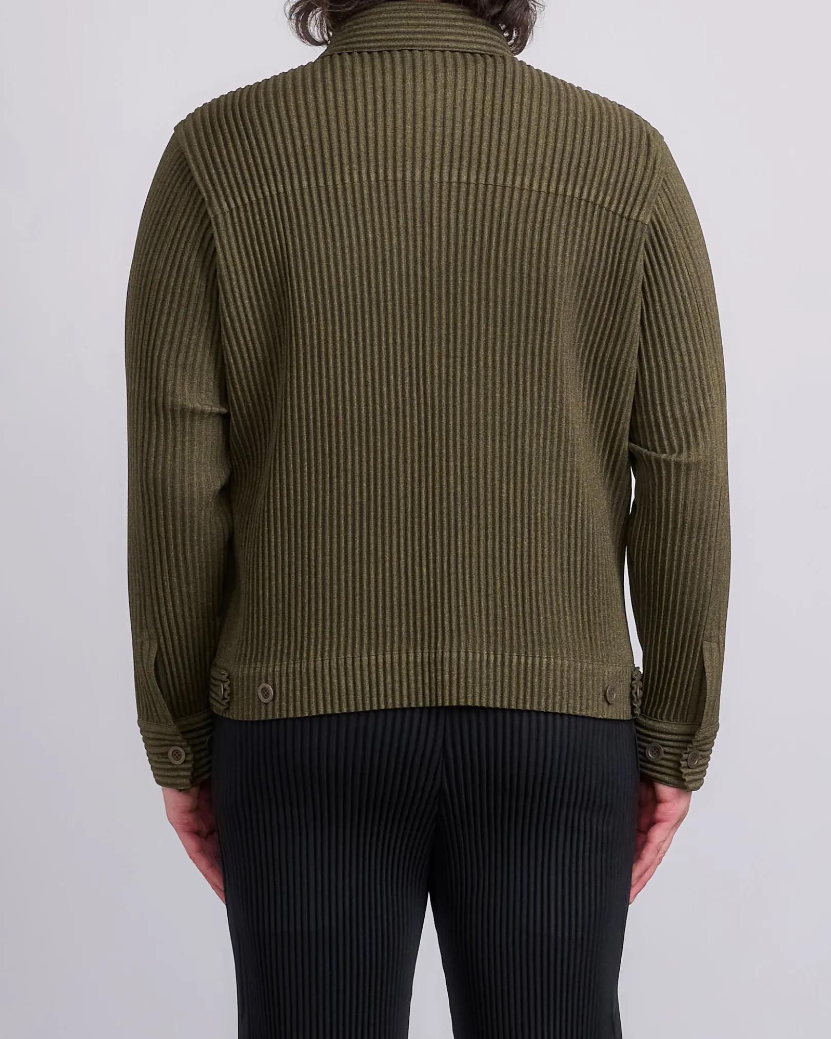 This trucker-style pleated jacket in khaki has chest pockets, side pockets and button fastenings.