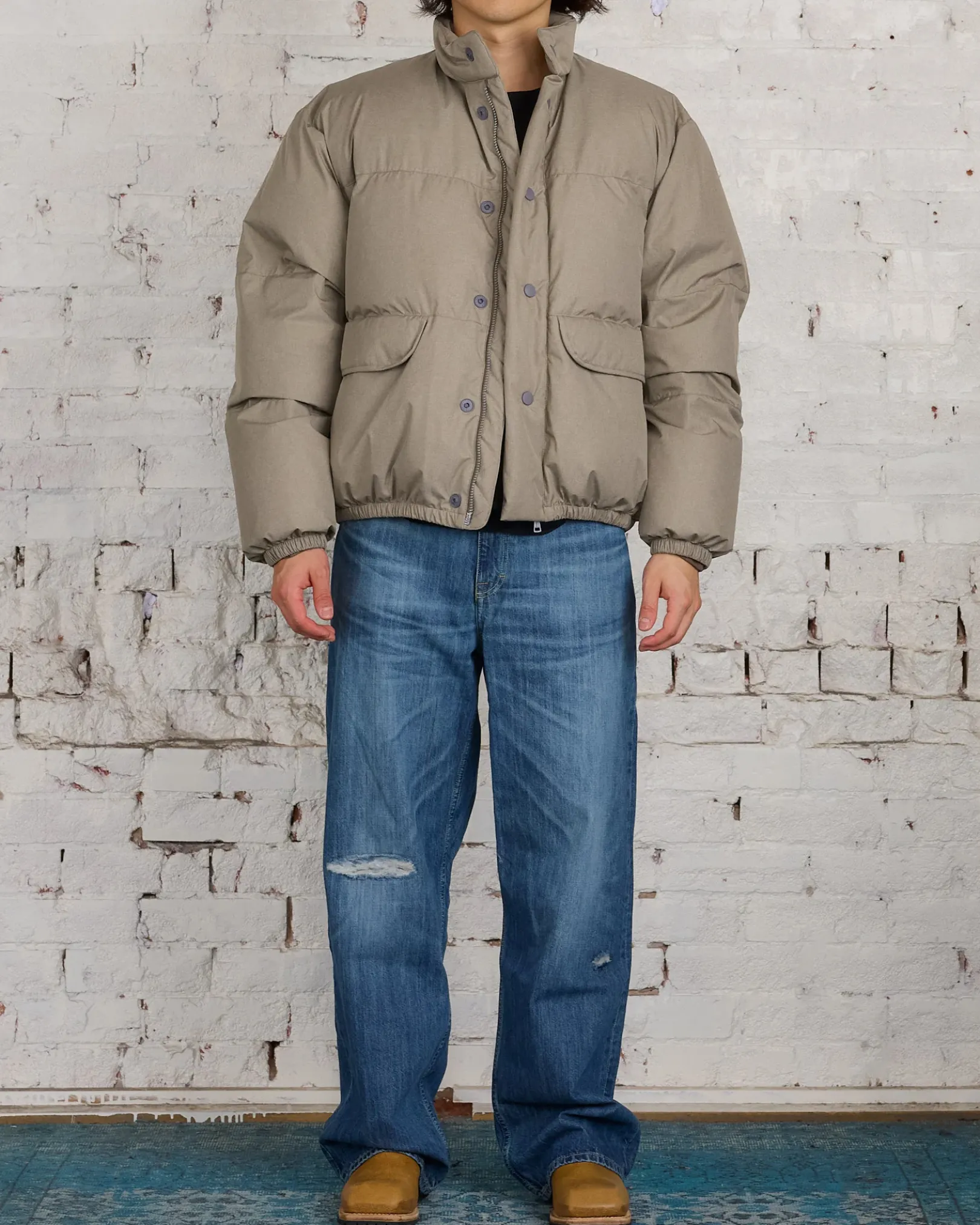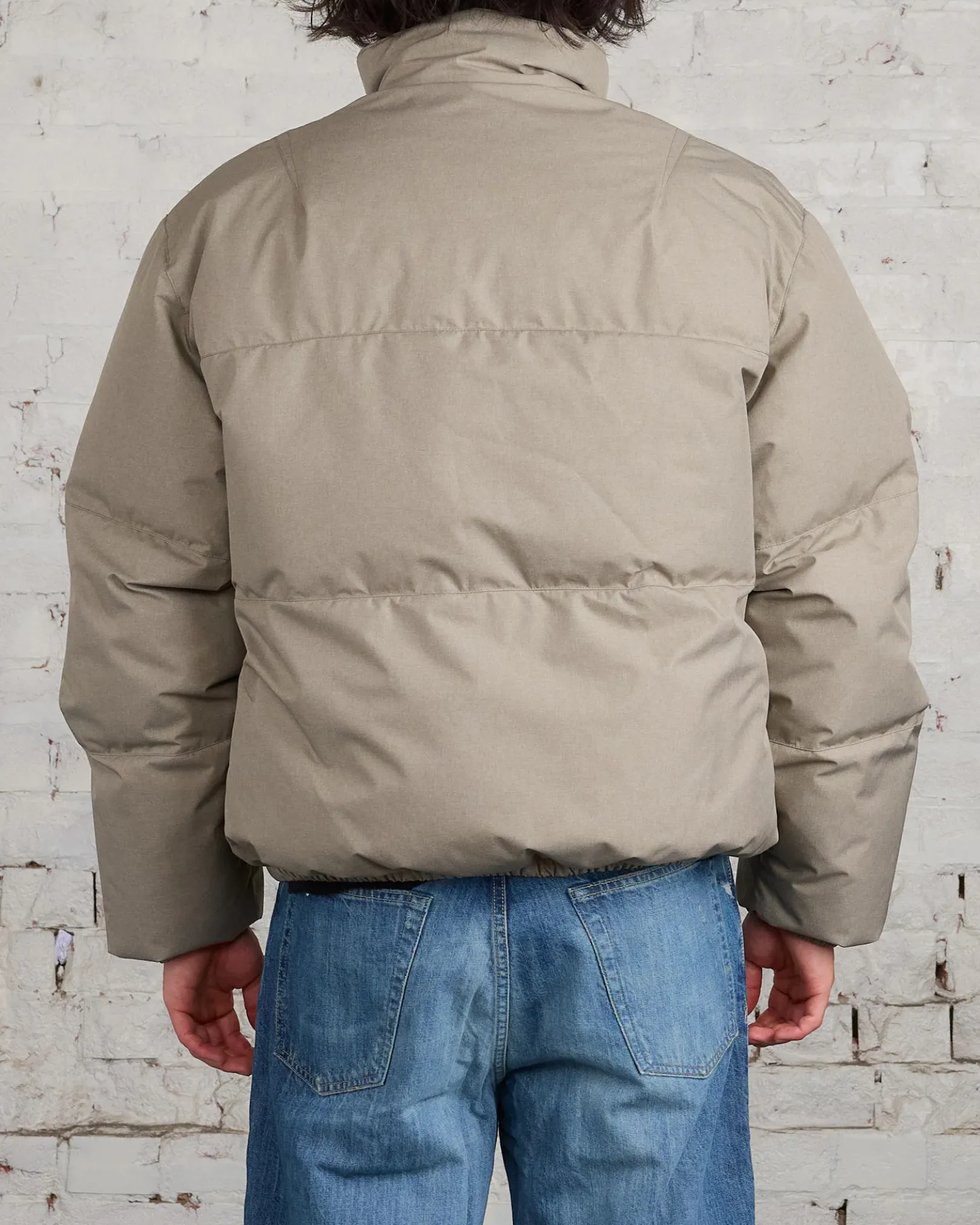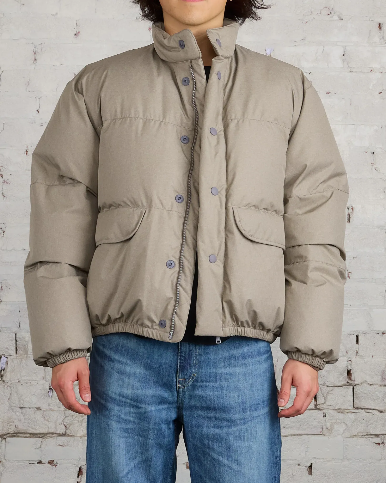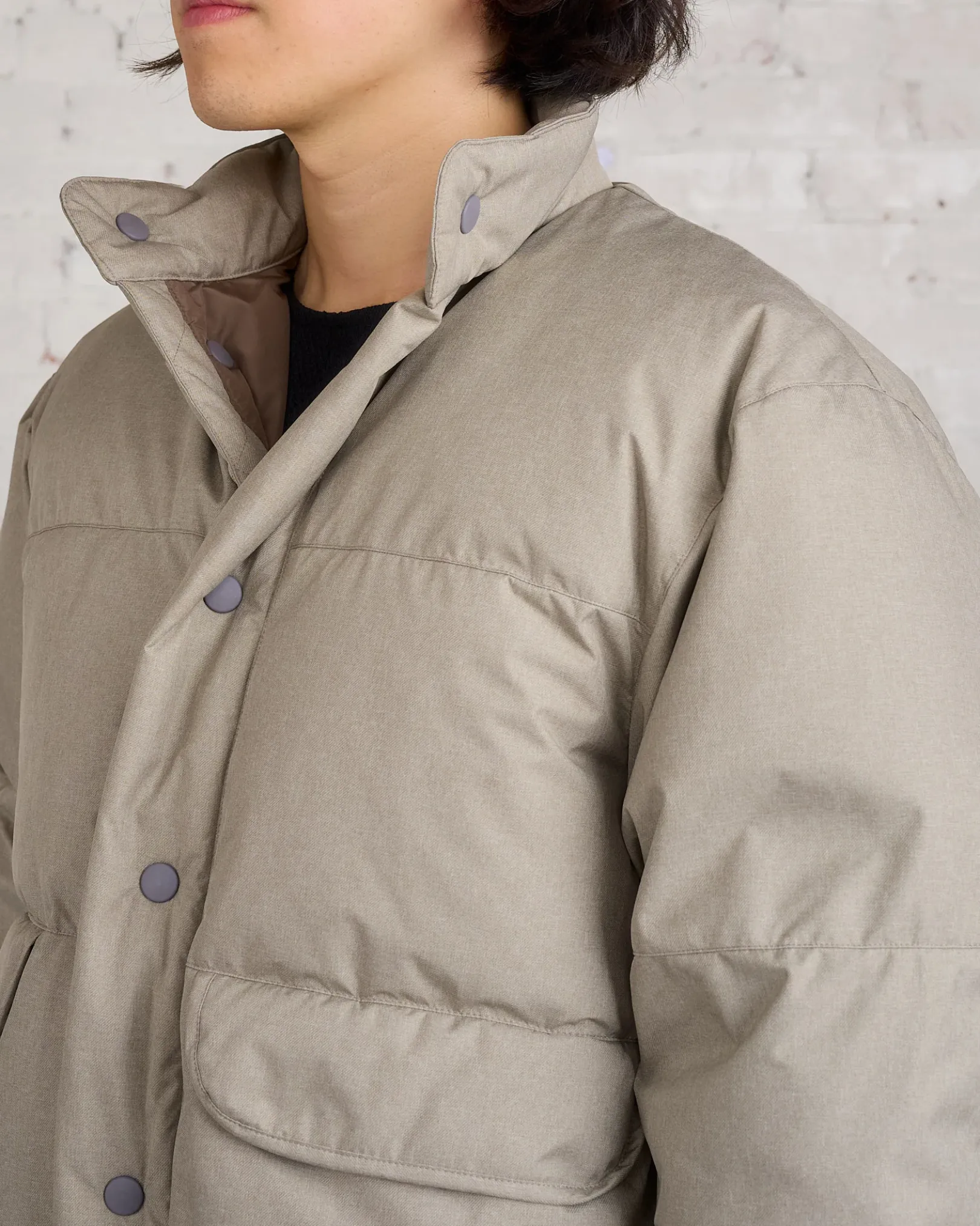 Inhale Puffa in Doubleganger Beige Mel Nylon. Produced in an Italian polyester fabric with a mix of down and synthetic insulation, the mens Inhale Puffa has a boxy fit and features a funnel neck collar, two hand warmer pockets with snap closure, an inner zip pocket and a two way lampo zip.
