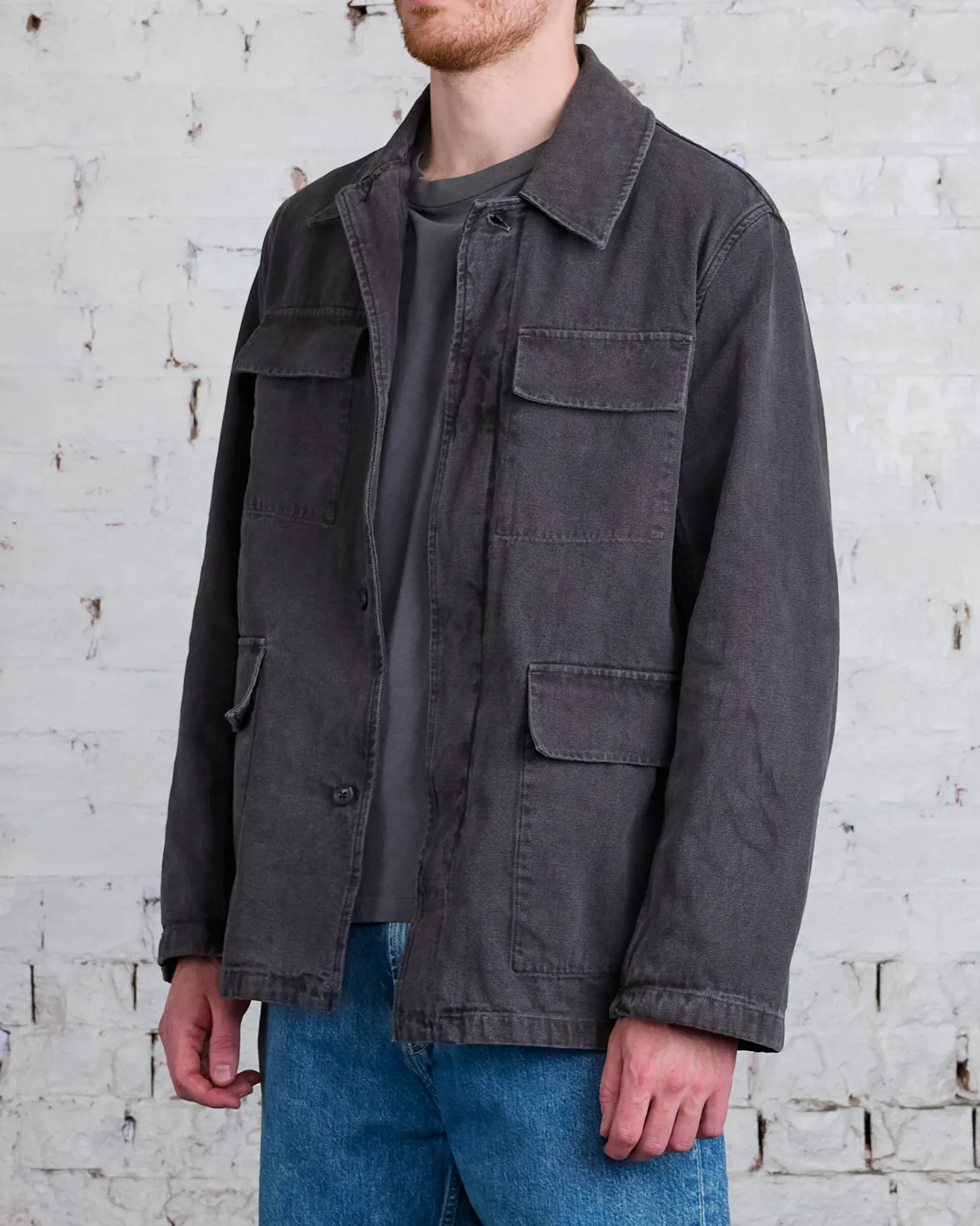 Uniform Jacket in Ash Black Reborn Canvas. Produced in a piece dyed Italian cotton canvas, the mens Uniform Jacket has a relaxed, boxy fit and features four patch pockets, a covered placket and horn buttons.