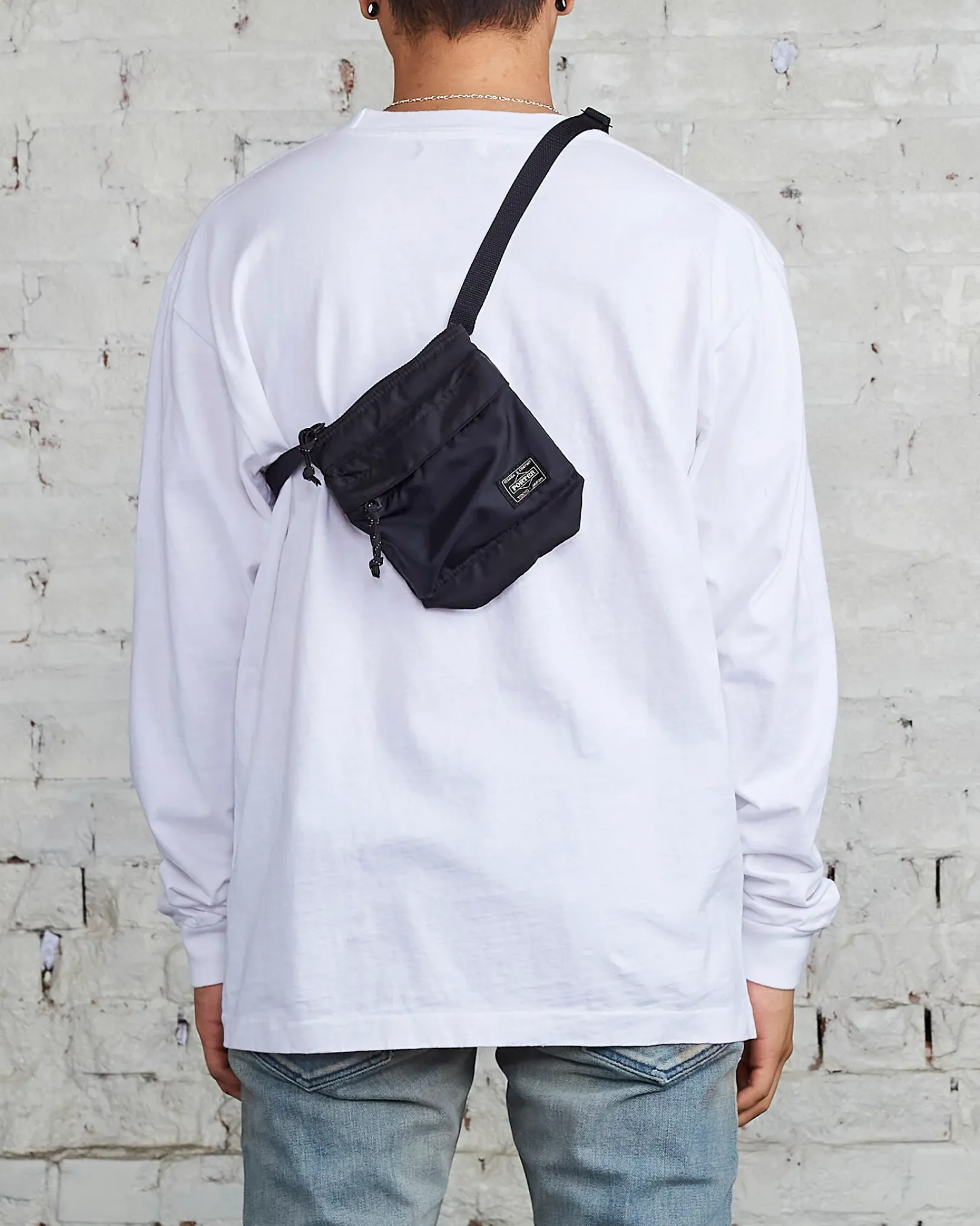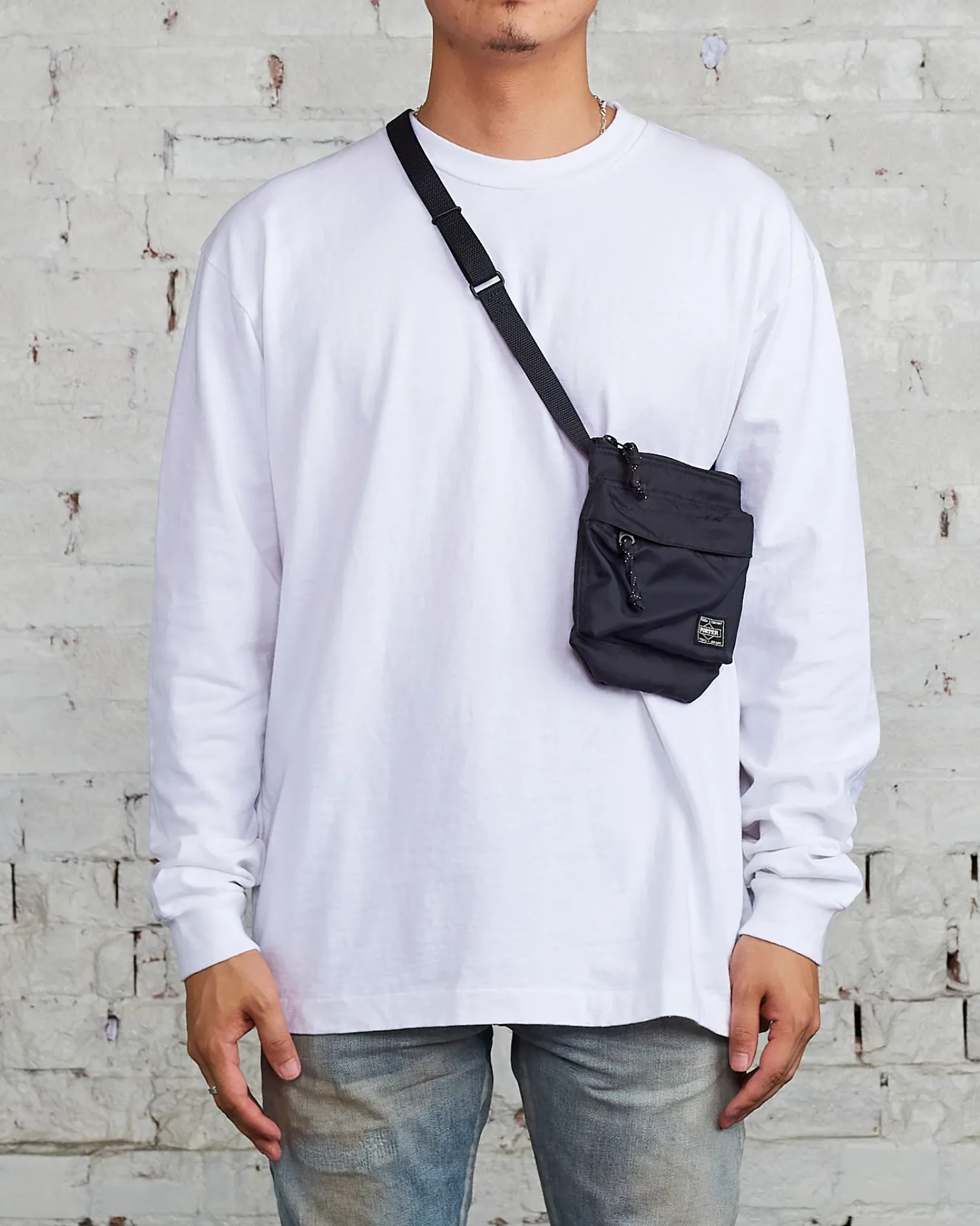PORTER FORCE Shoulder Pouch in Black. Inspired by military-style goods, this series highlights the unique color variations found by chance in the fabric. Made with durable 210 denier 6 nylon, originally used for rubber boats, this bag offers functional design with an interior key clip, front pocket, zip closure, and interior divider.