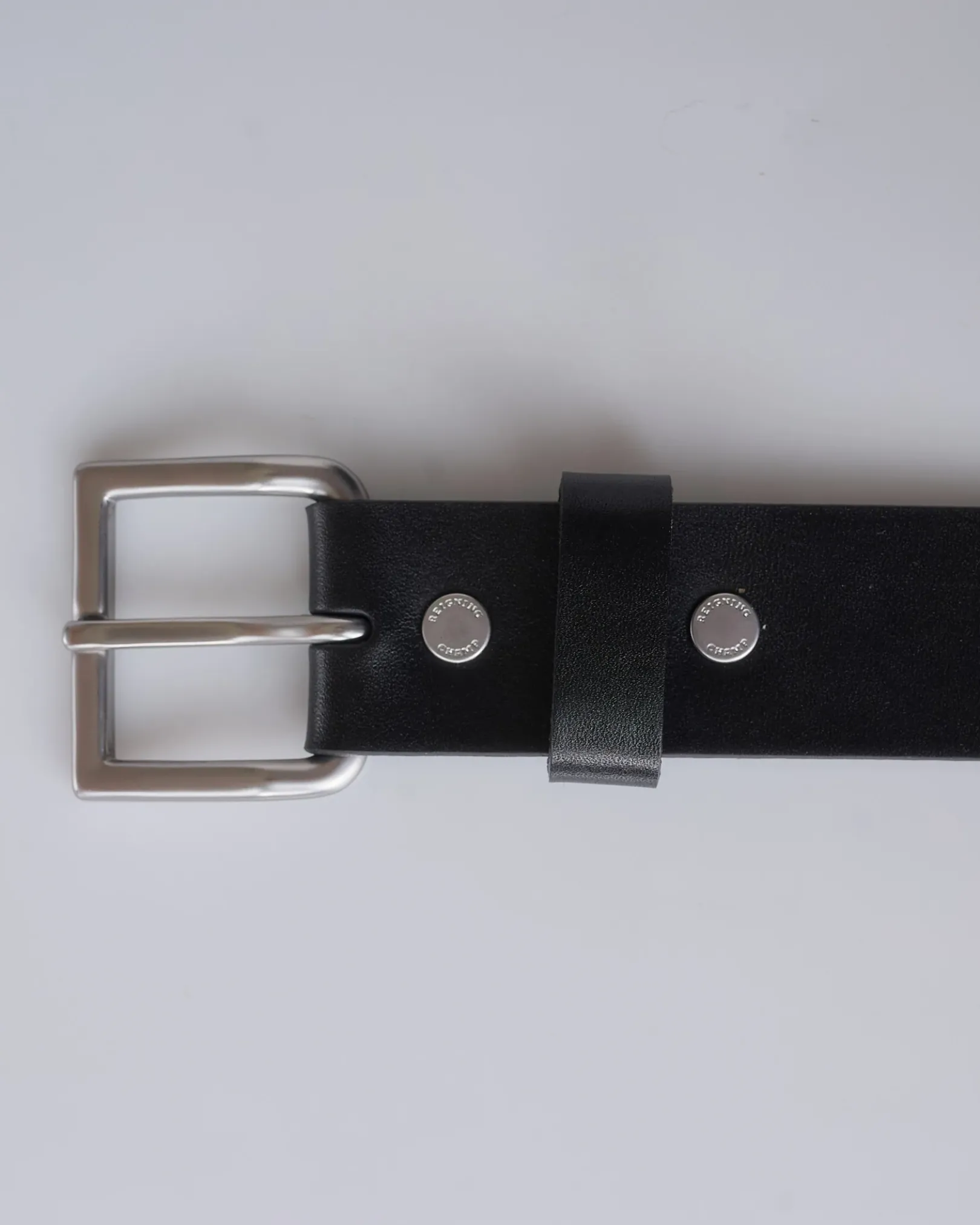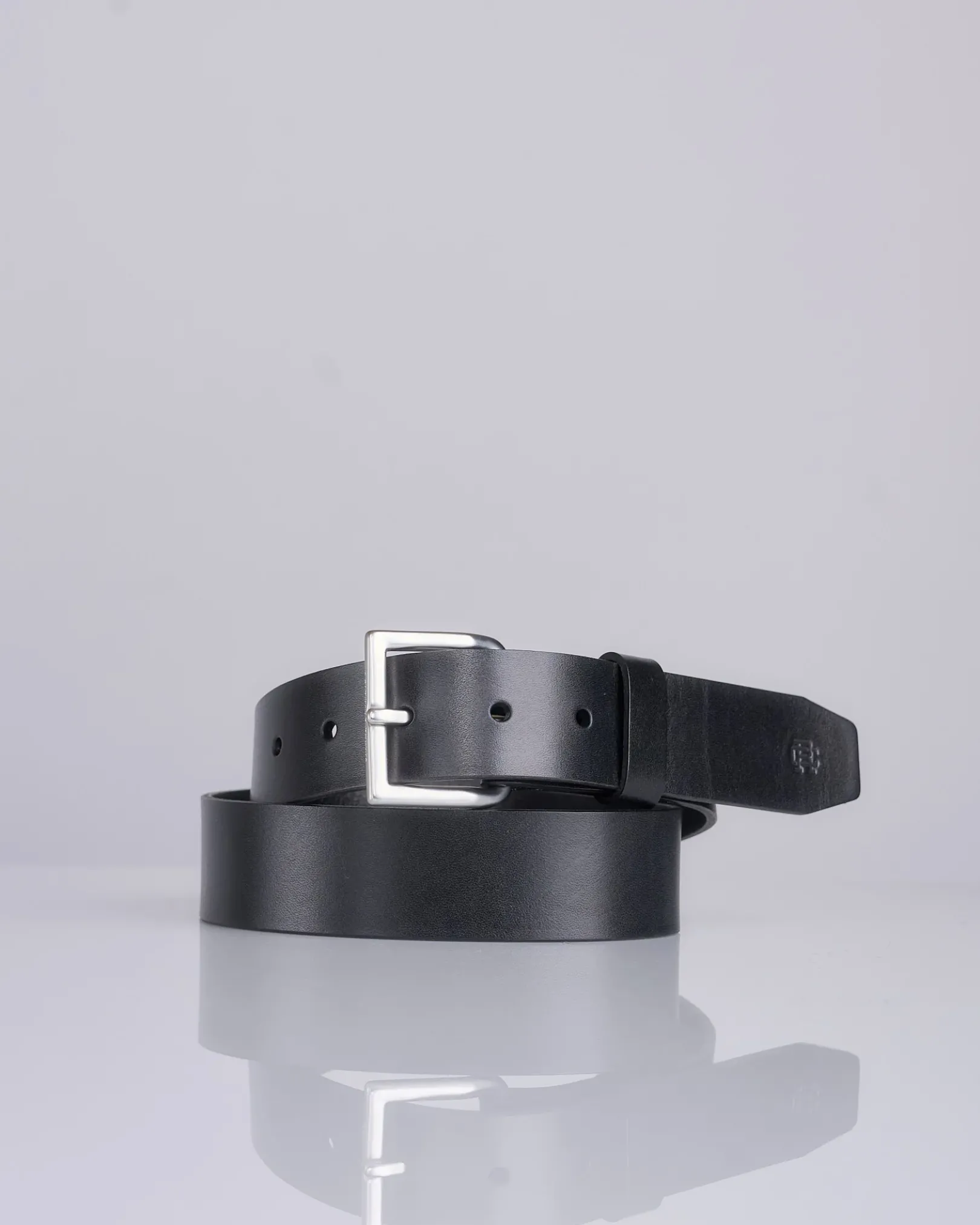 This classic leather belt is built for both casual and tailored occasions. Featuring a debossed buckle and rivets, mitered corners, and a standard 1-3/8″ width.