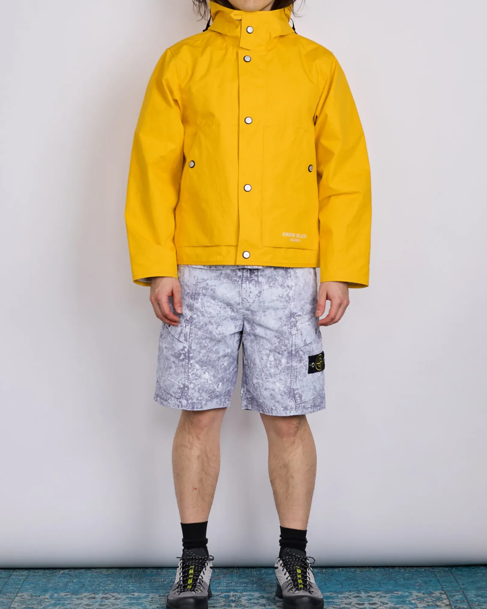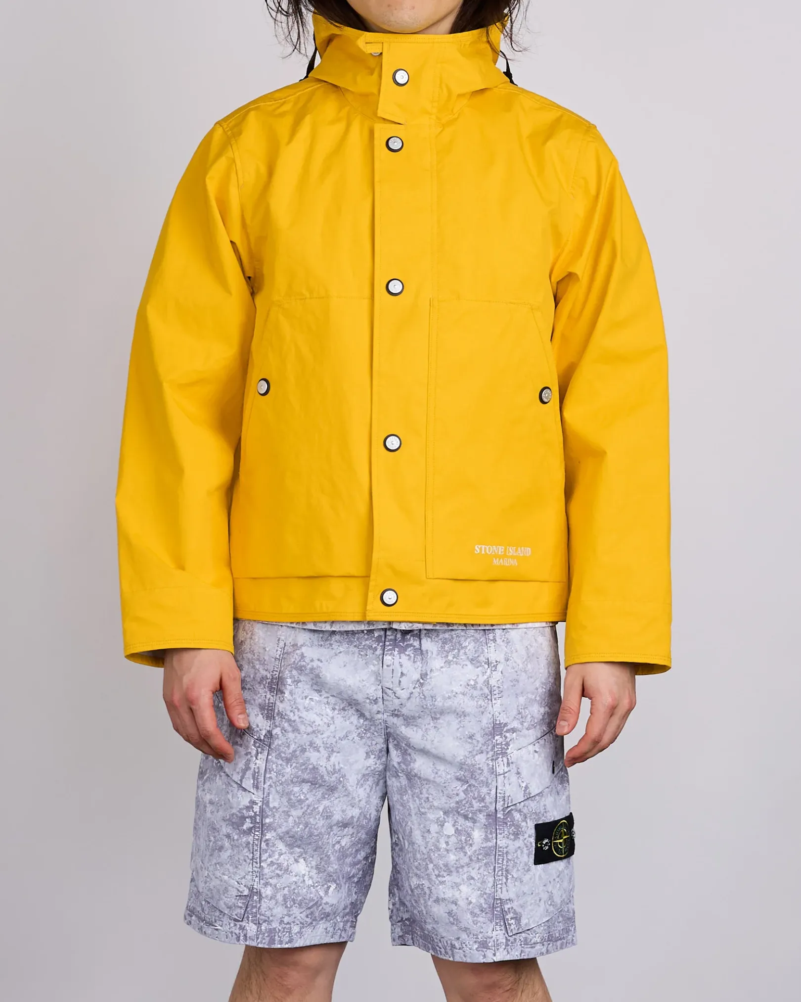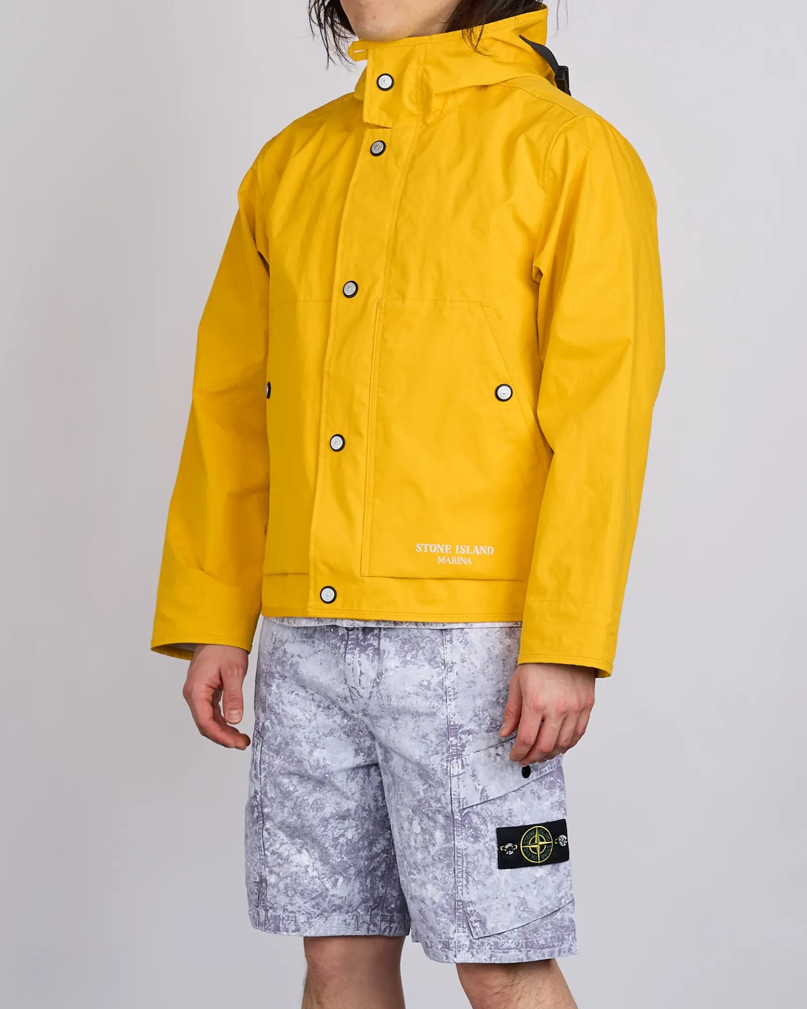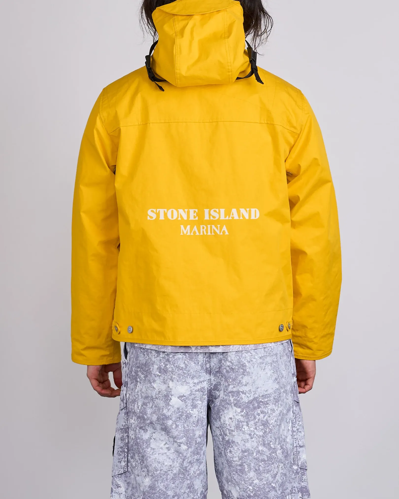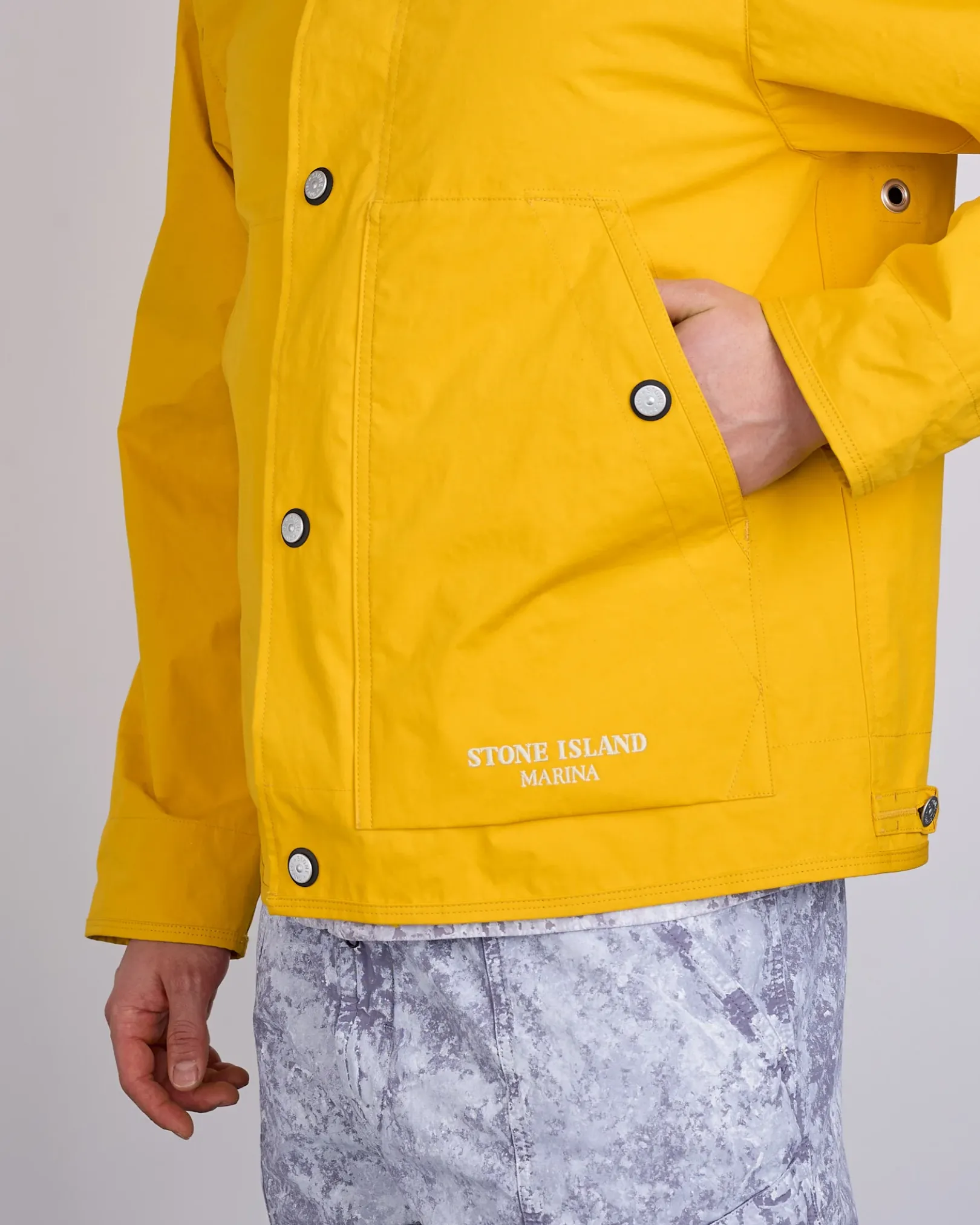 Hood with visor and adjustable nylon tape side straps. Slanted hand pockets with snap fastening on rubber disc. Embroidery of the Stone Island Marina lettering on the left pocket. Metal eyelets under arm. Reflective fabric band inside cuff. Yoke on back with overstitched shoulders. Print of the Stone Island Marina lettering. Adjustable straps on sides held by button. Reflective fabric band inside bottom hem. Two-way hidden zipper fastening with strap and pull metal loop; placket with snaps on rubber discs.