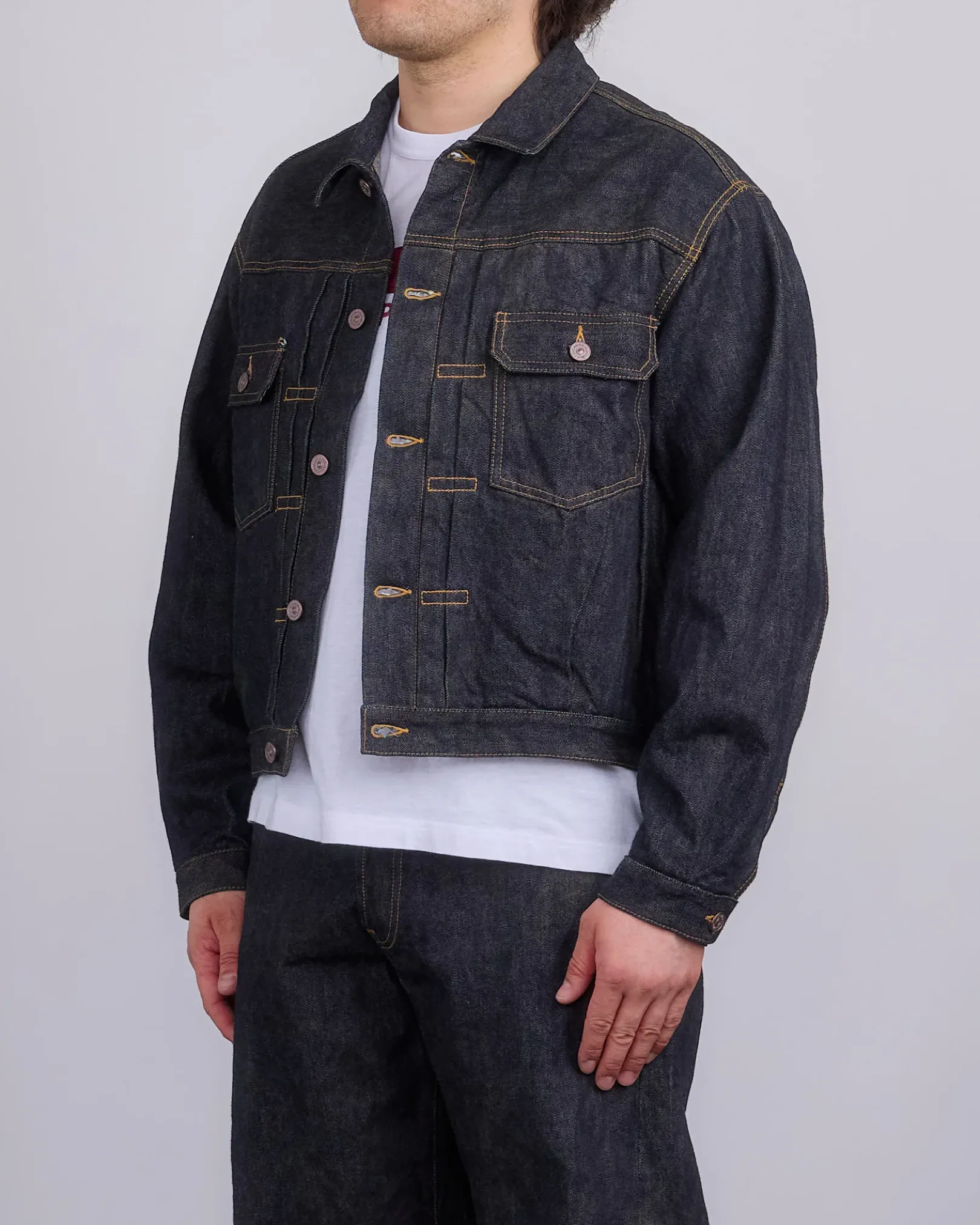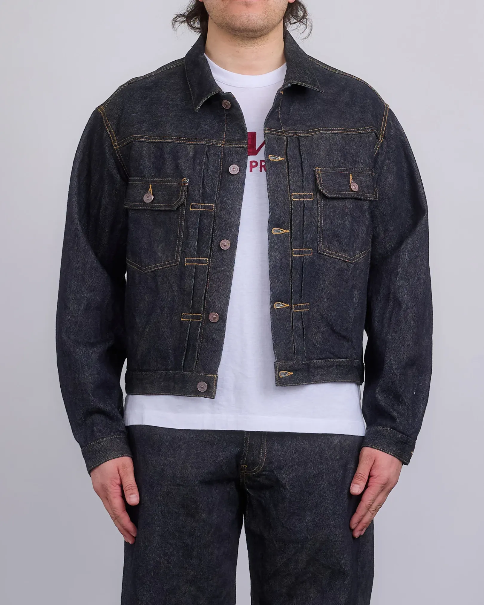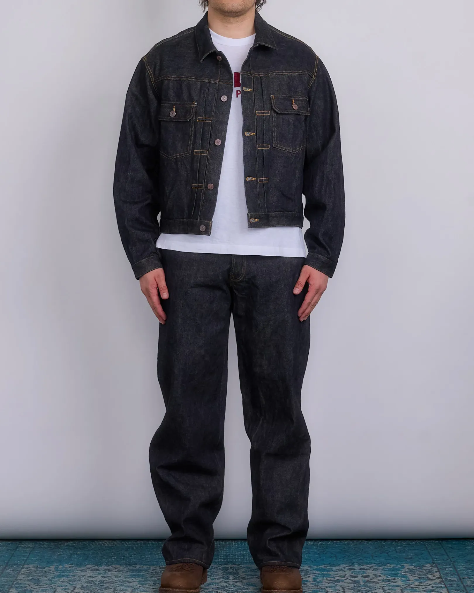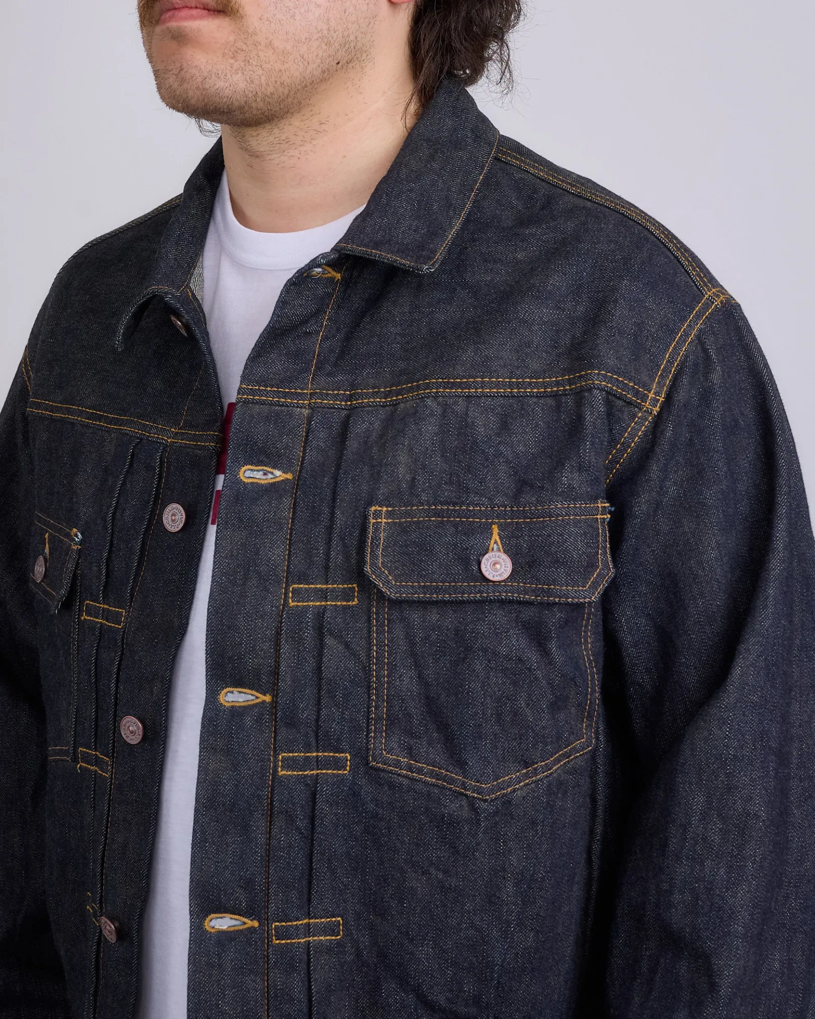 The 101X Raw Mud OD jacket is crafted from custom 13oz mud-dyed denim, achieving a distinct, richly textured finish. The natural mud dye process ensures that no two pieces are alike, with variations in tone and texture. Designed with a wide, cropped fit, it features red selvedge details, original copper buttons and rivets, and zip-closure side pockets. A natural-dyed buckskin patch completes the piece.