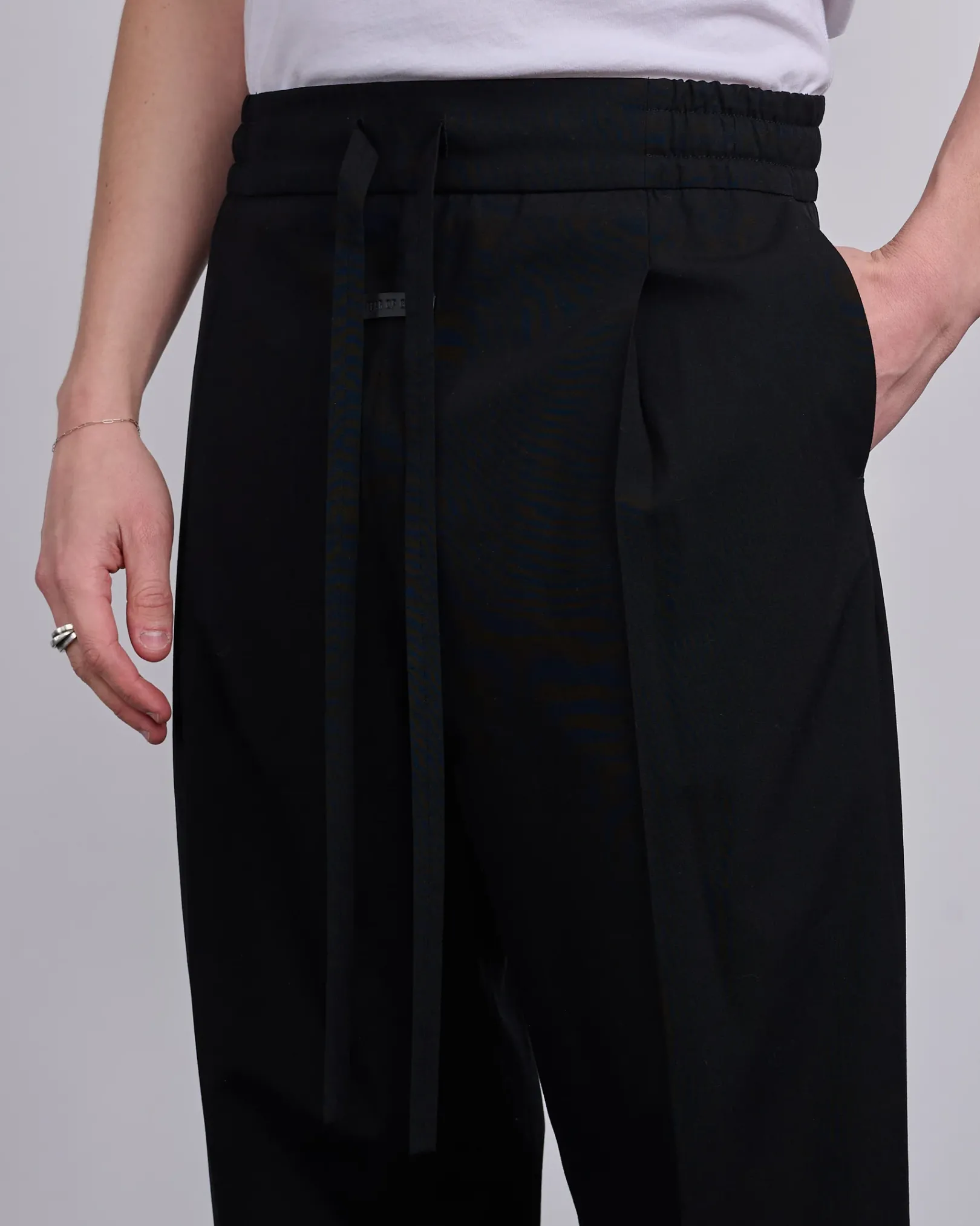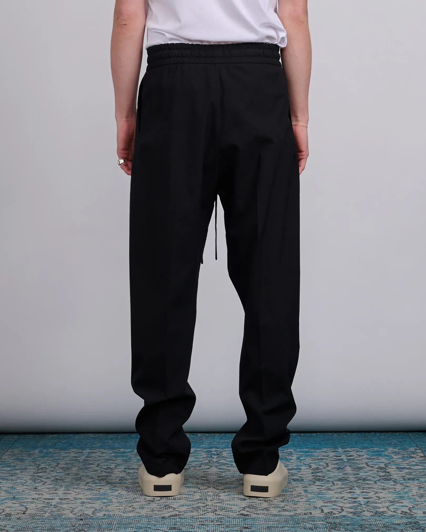 The Drawstring Wide Leg Pant is tailored in Italy from virgin wool-cotton blend for lightweight polished style. Additional features include an encased elastic waistband, self-fabric drawstring, side pockets, and Fear of God label.