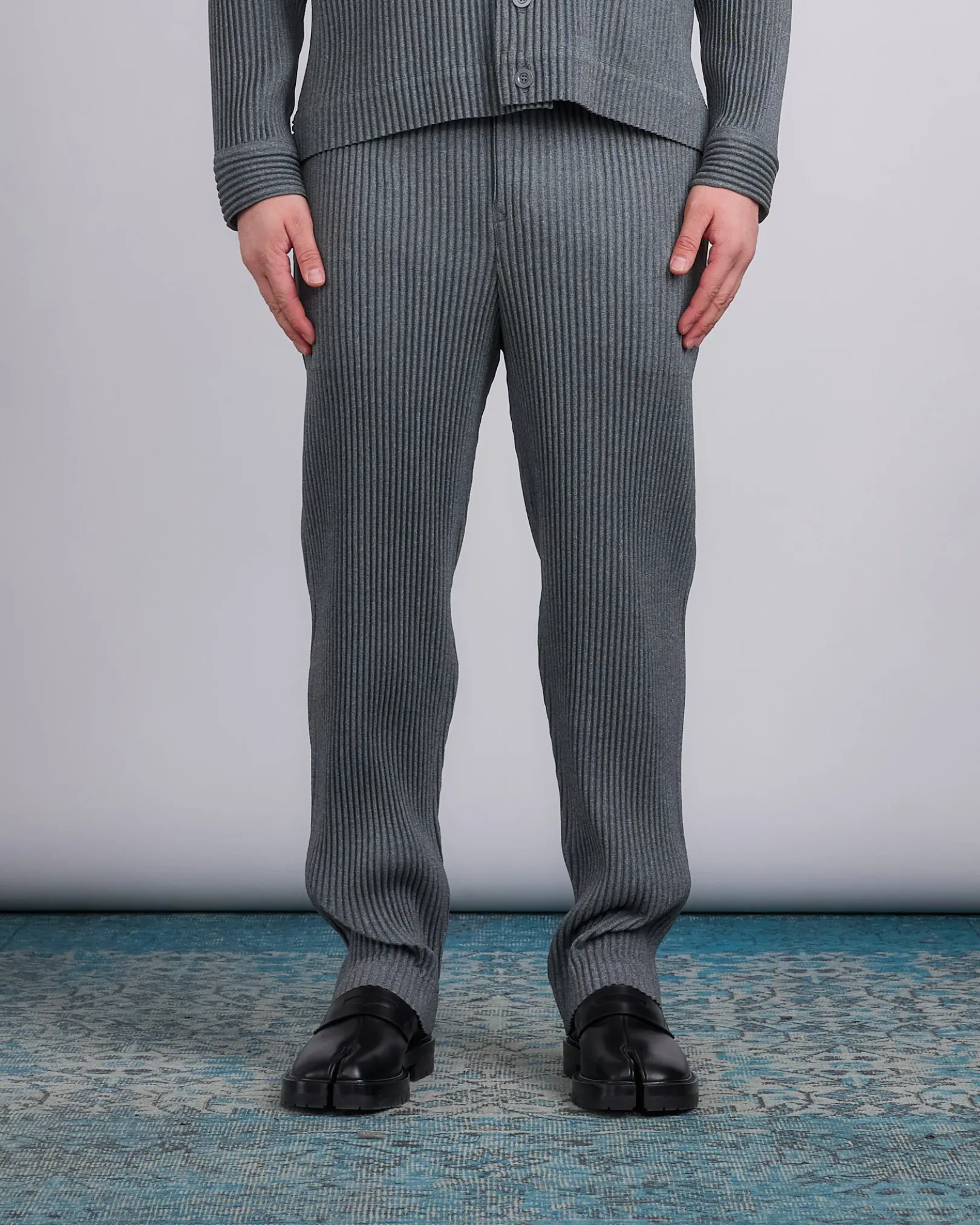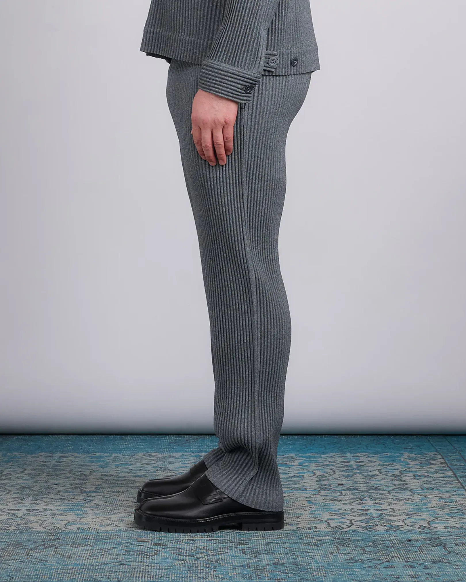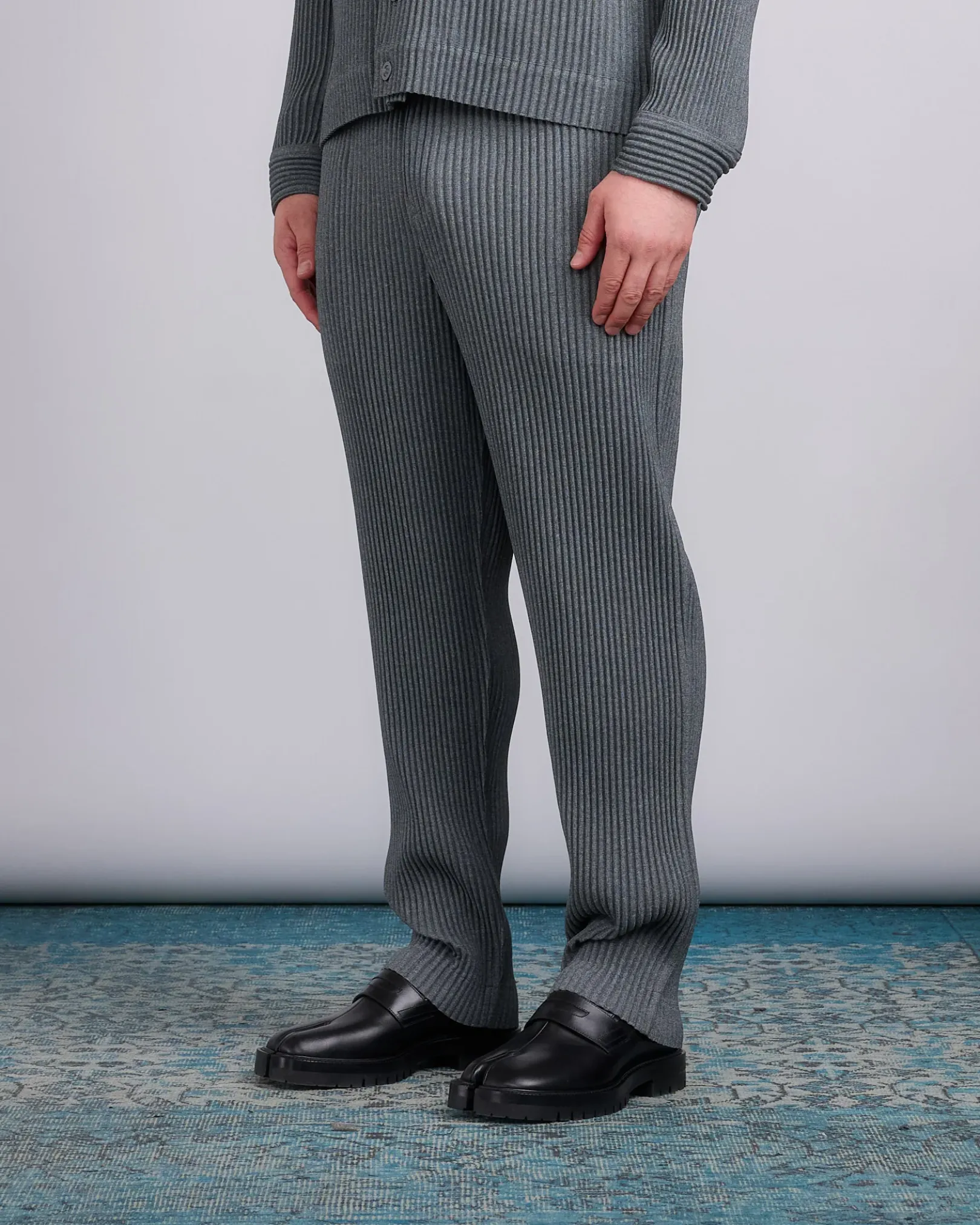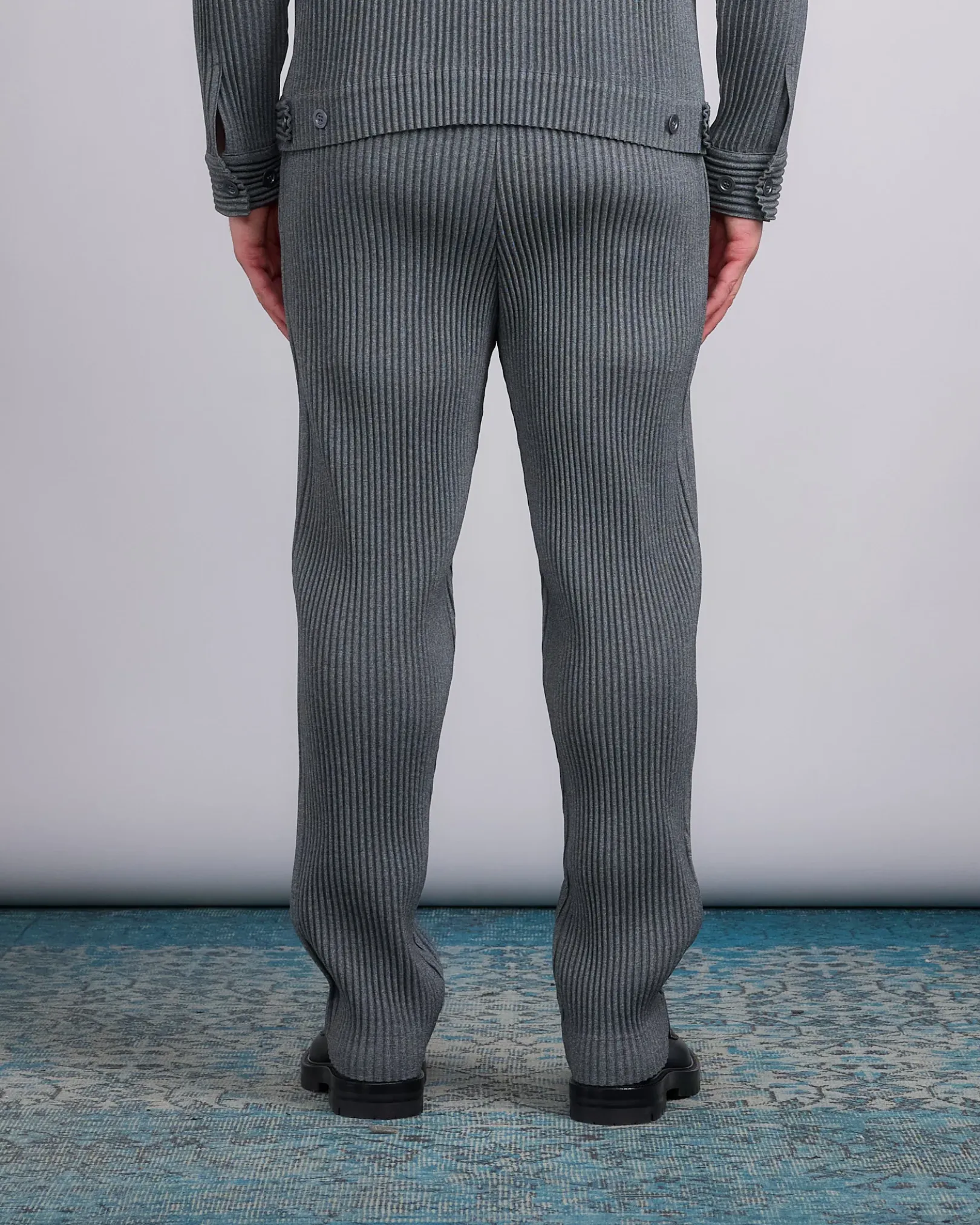 These straight gray pleated trousers have side pockets and a fully elasticated waistband with a button fly and belt loops.
