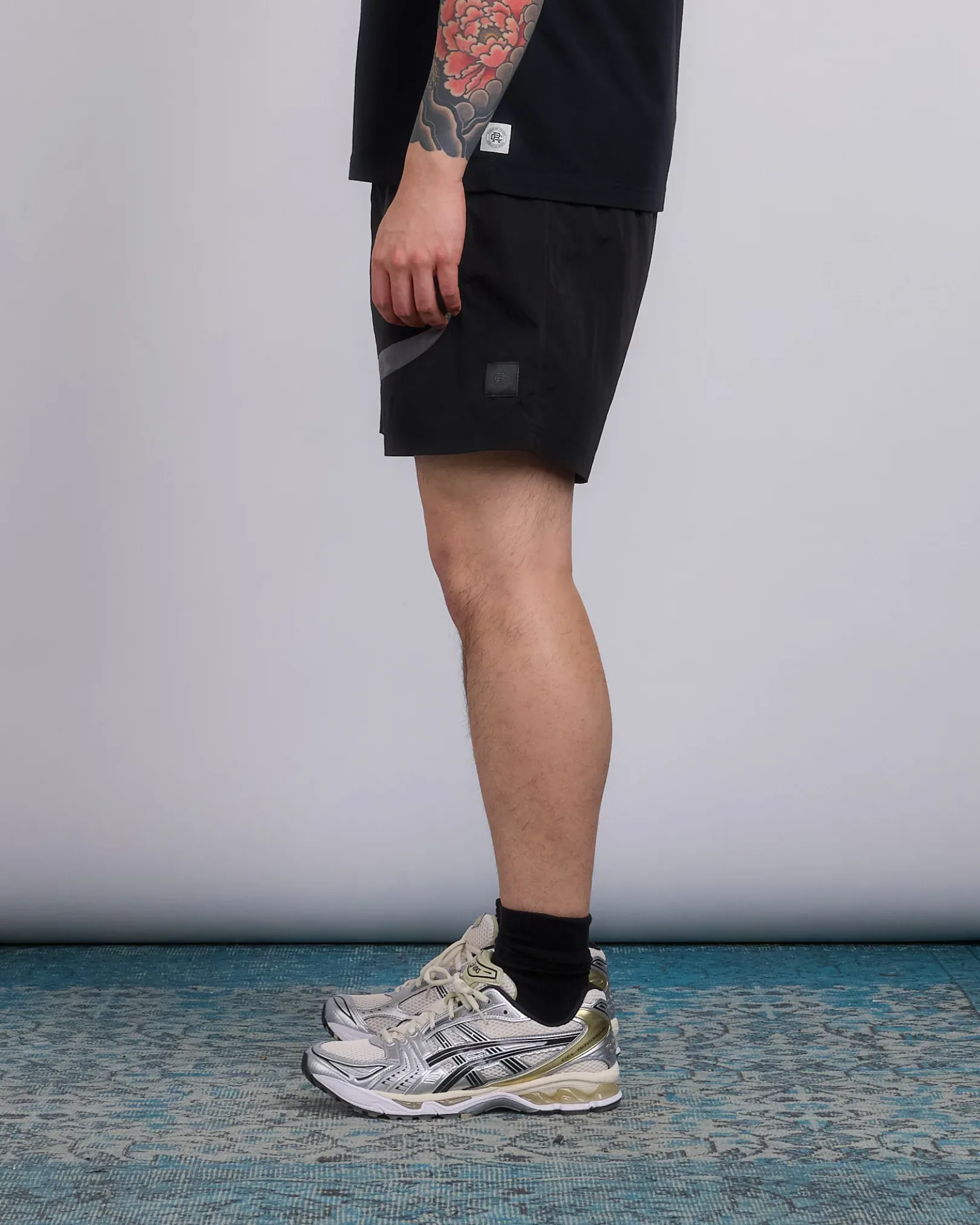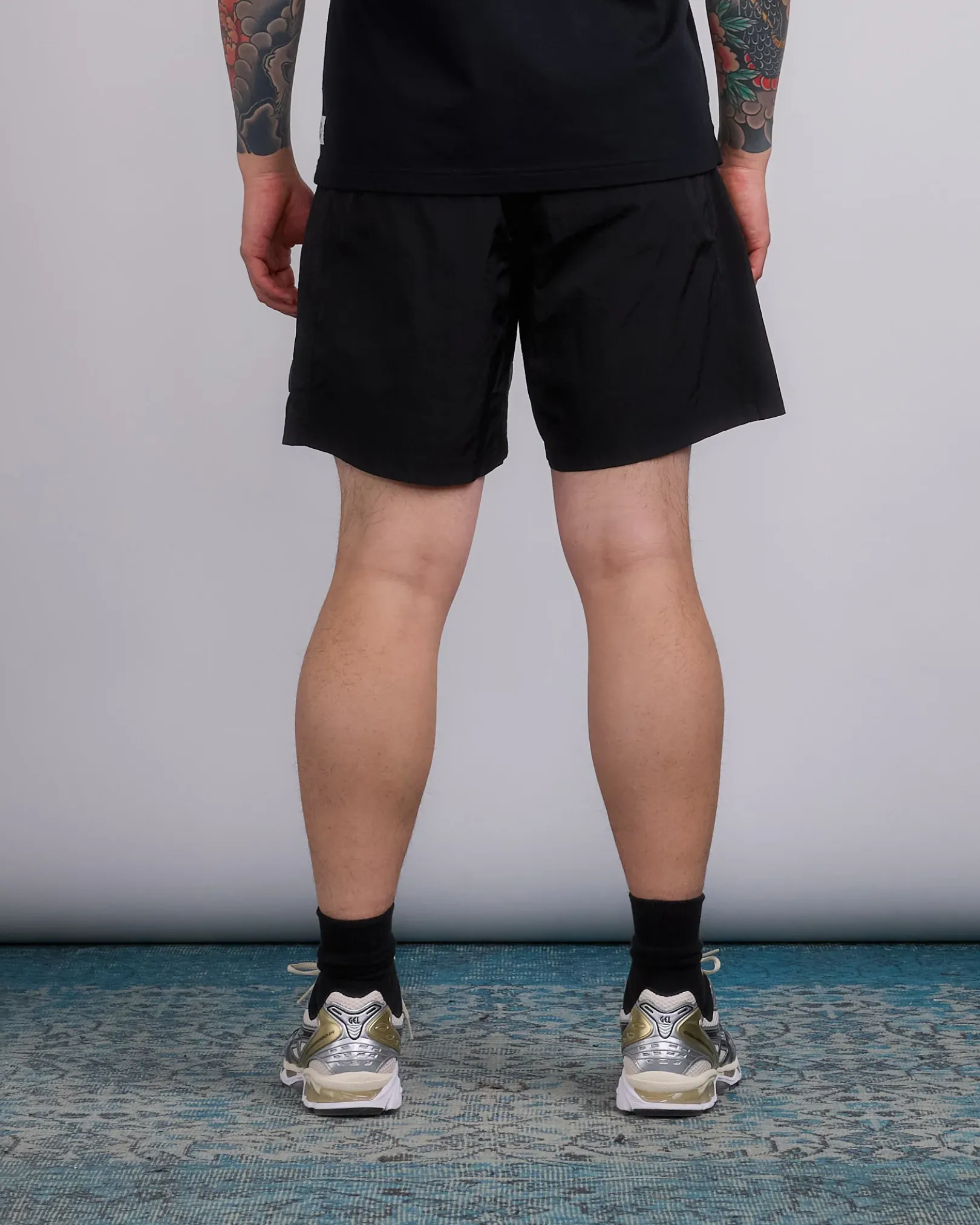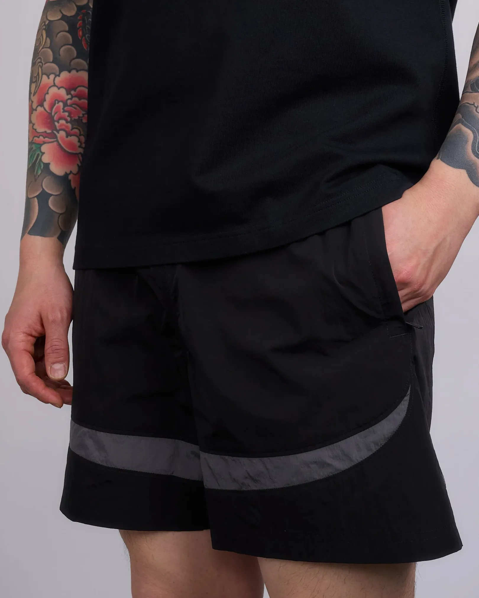 This versatile short is crafted from water-repellent crinkle nylon with contrast paneling. Designed for multipurpose activity, it features a 6″ inseam, elasticated waistband, and mesh-lined zip pockets.