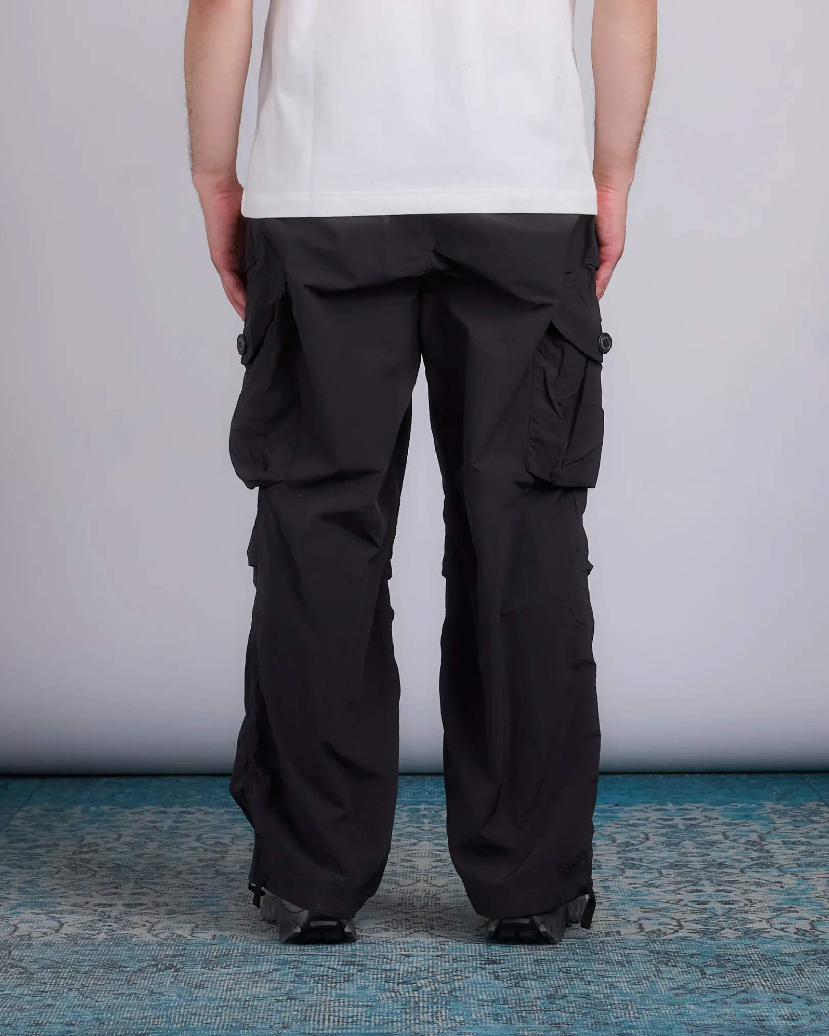 A water-repellent ripstop fabric with a unique elasticity and color due to the use of split yarn. Cargo pants with a loose and wide silhouette.