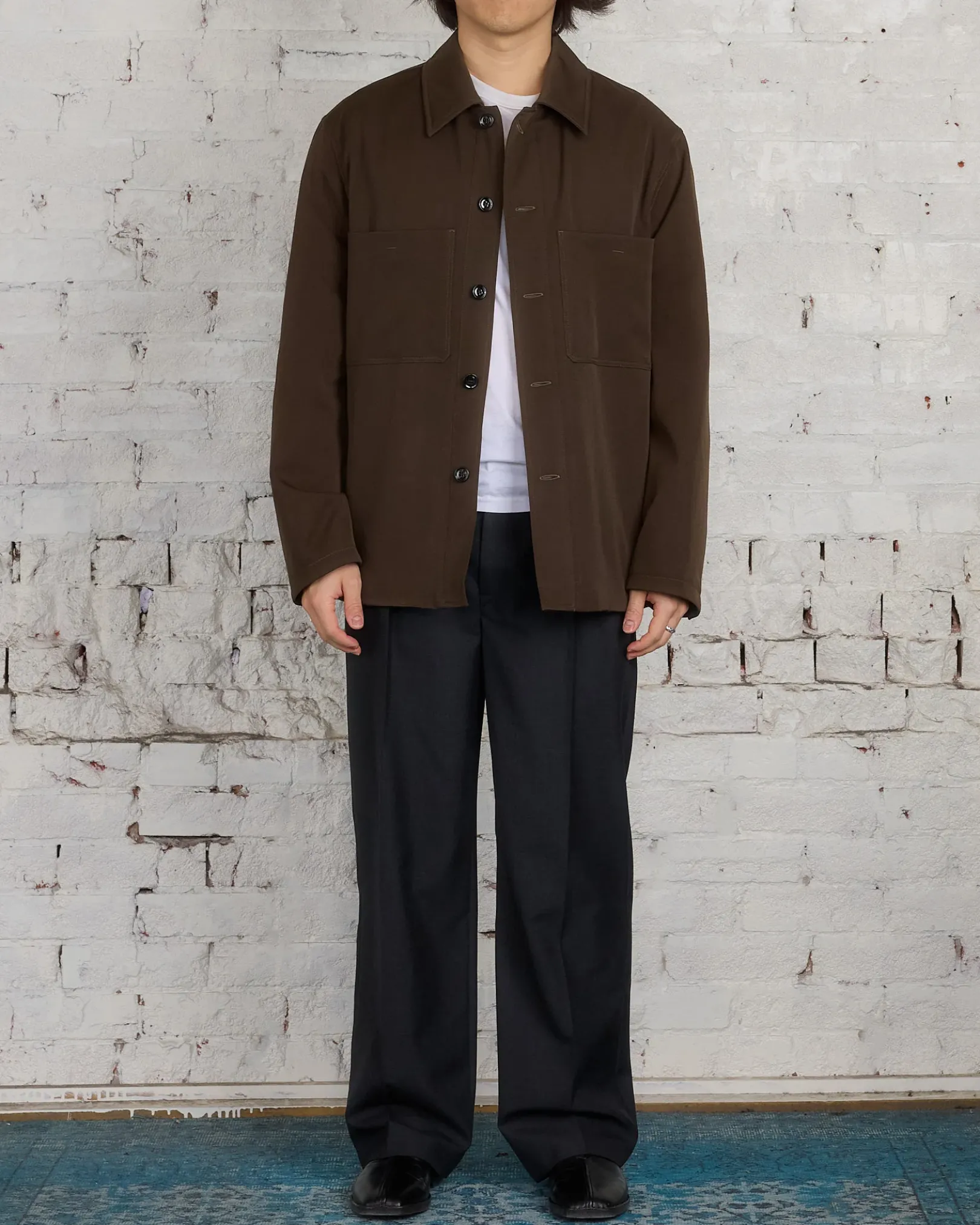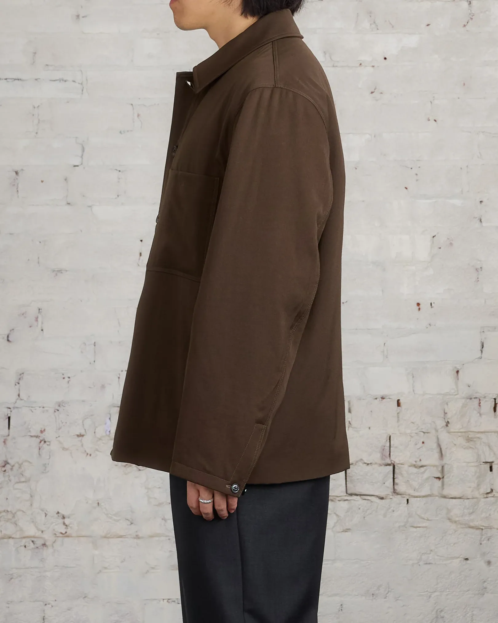 The Wadded Facing Blouson Jacket is made in fluid wool gabardine with a washed finishing made from RWS wool with a delicate hand. It is fully lined and has two patch pockets, straight collar, cuff buttoning and an inside pocket. A contrast stitching detail runs along the corozo buttoning and around the cuff.